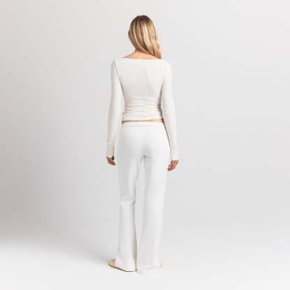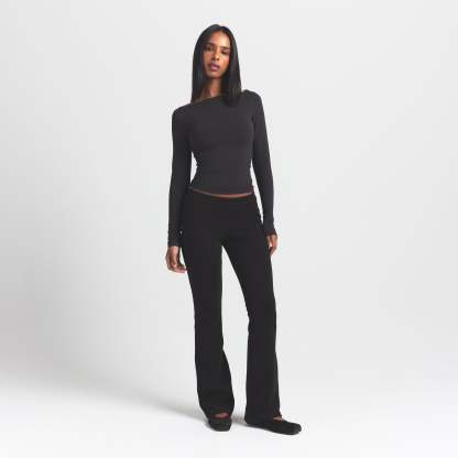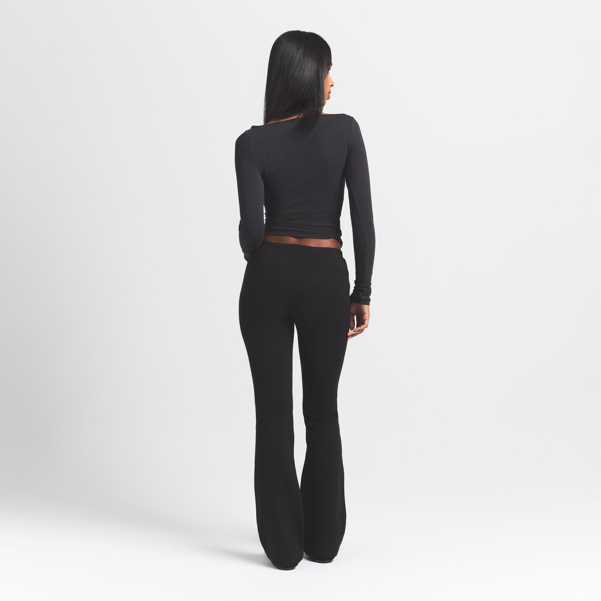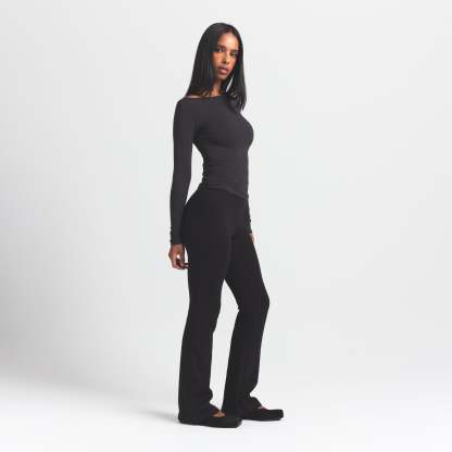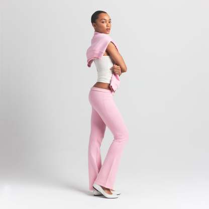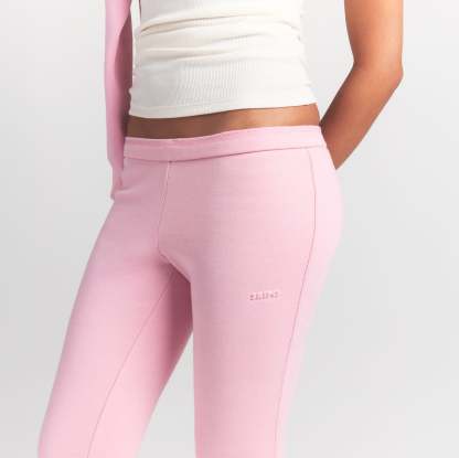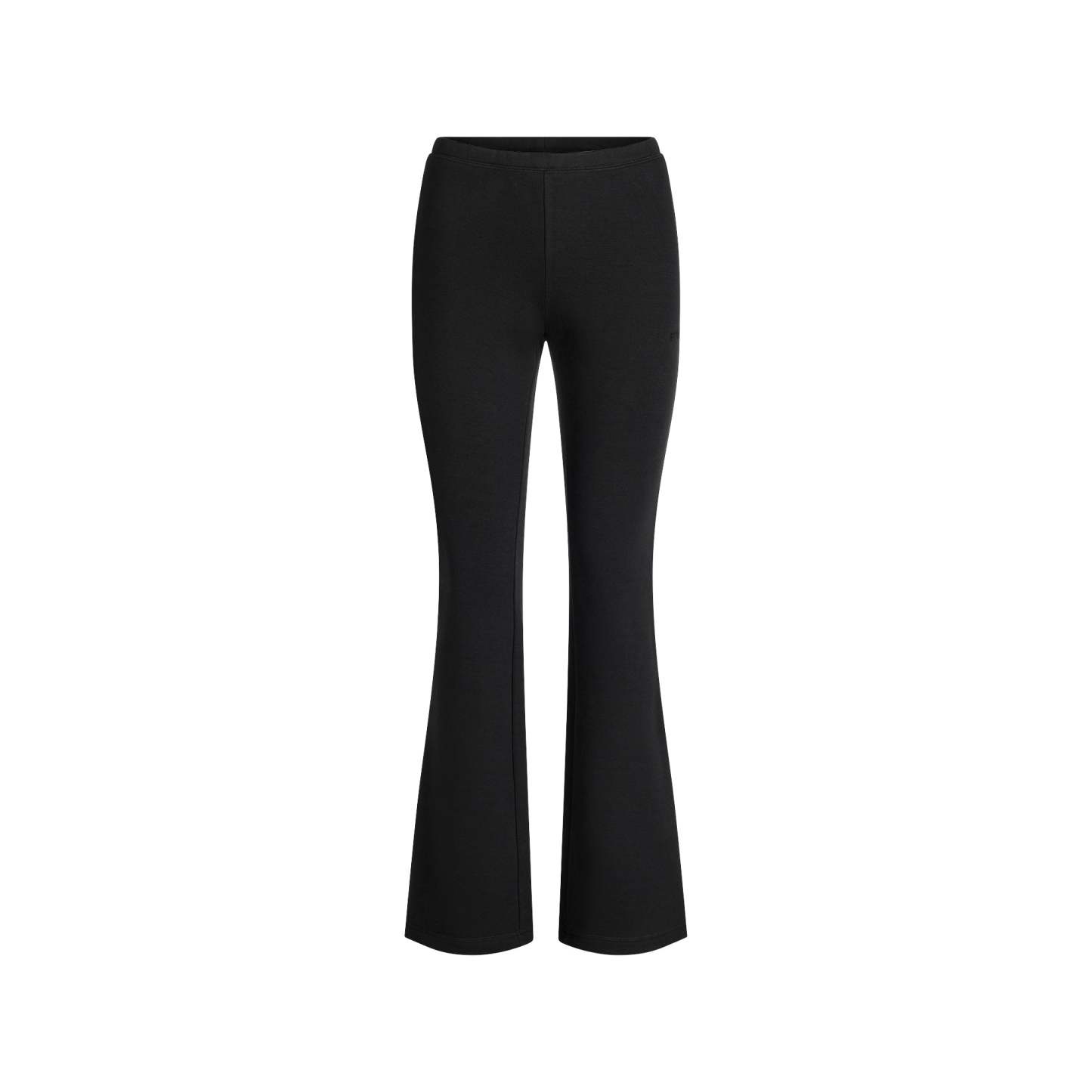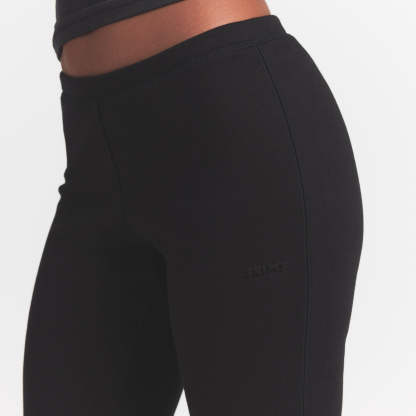 - Mid-rise, Soft knit encased elastic waistband, Embossed logo at wearers left hip, Fits tight to body, Slim straight leg