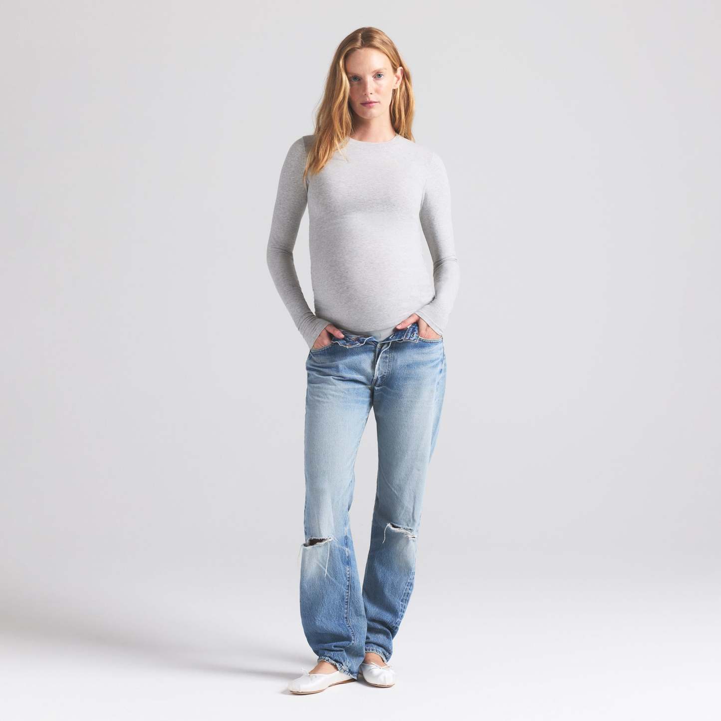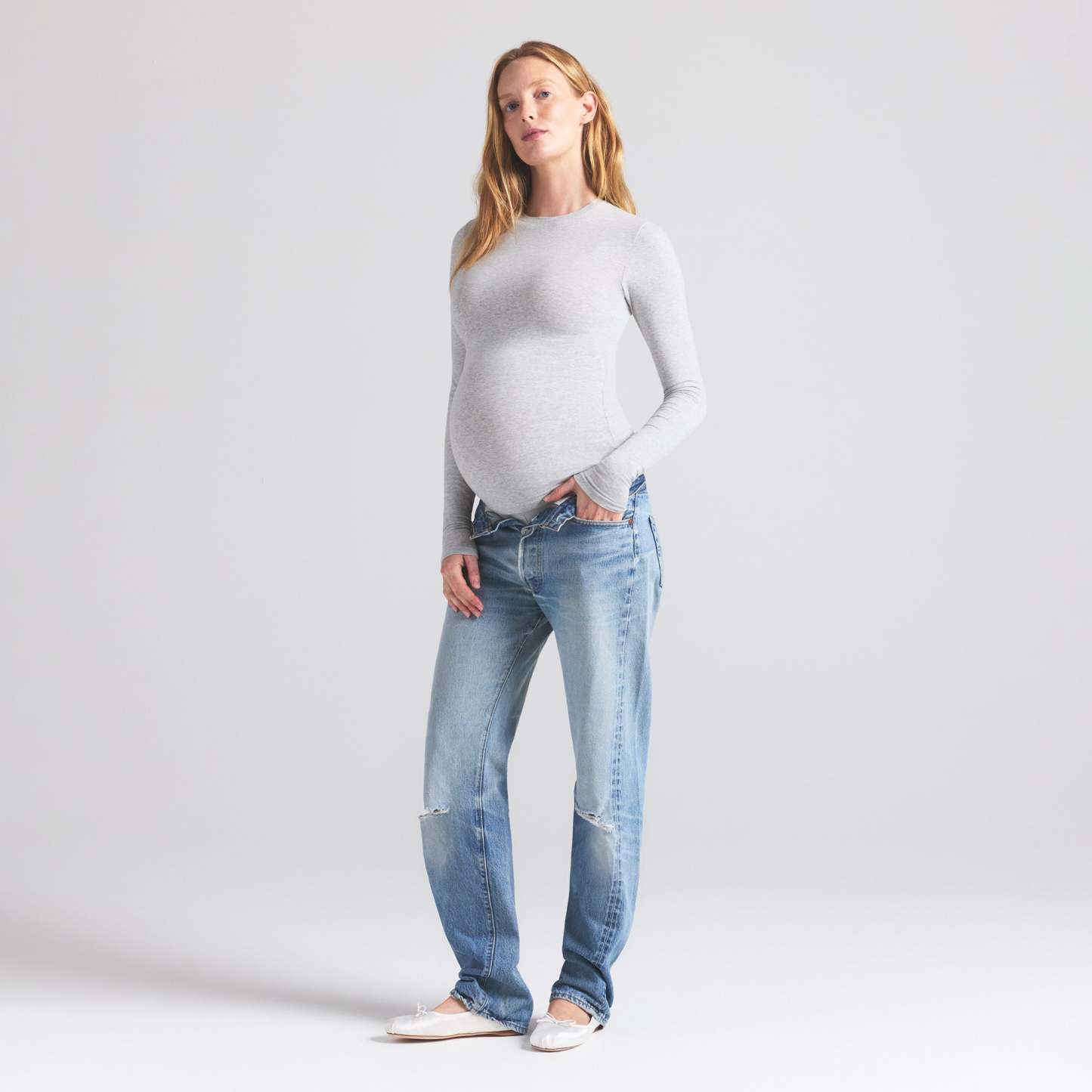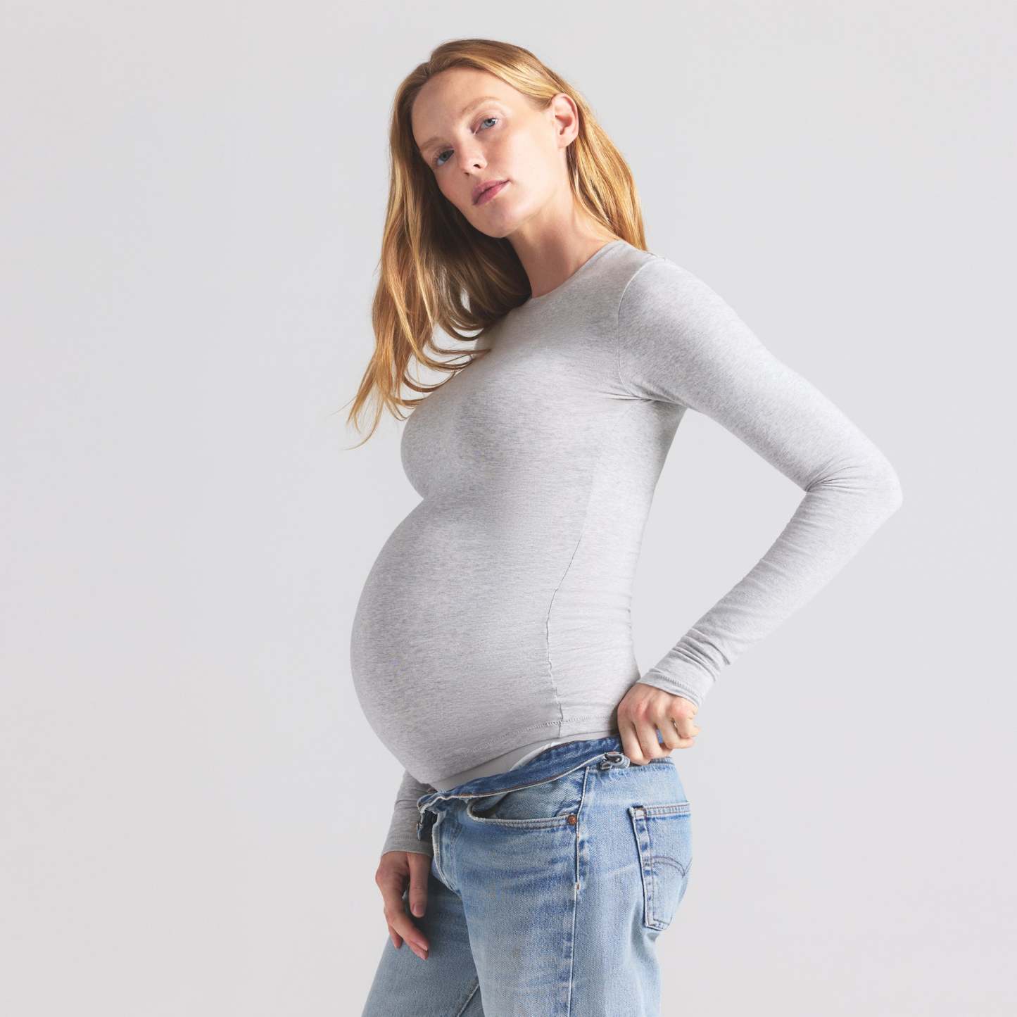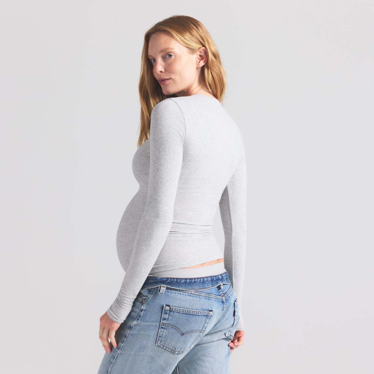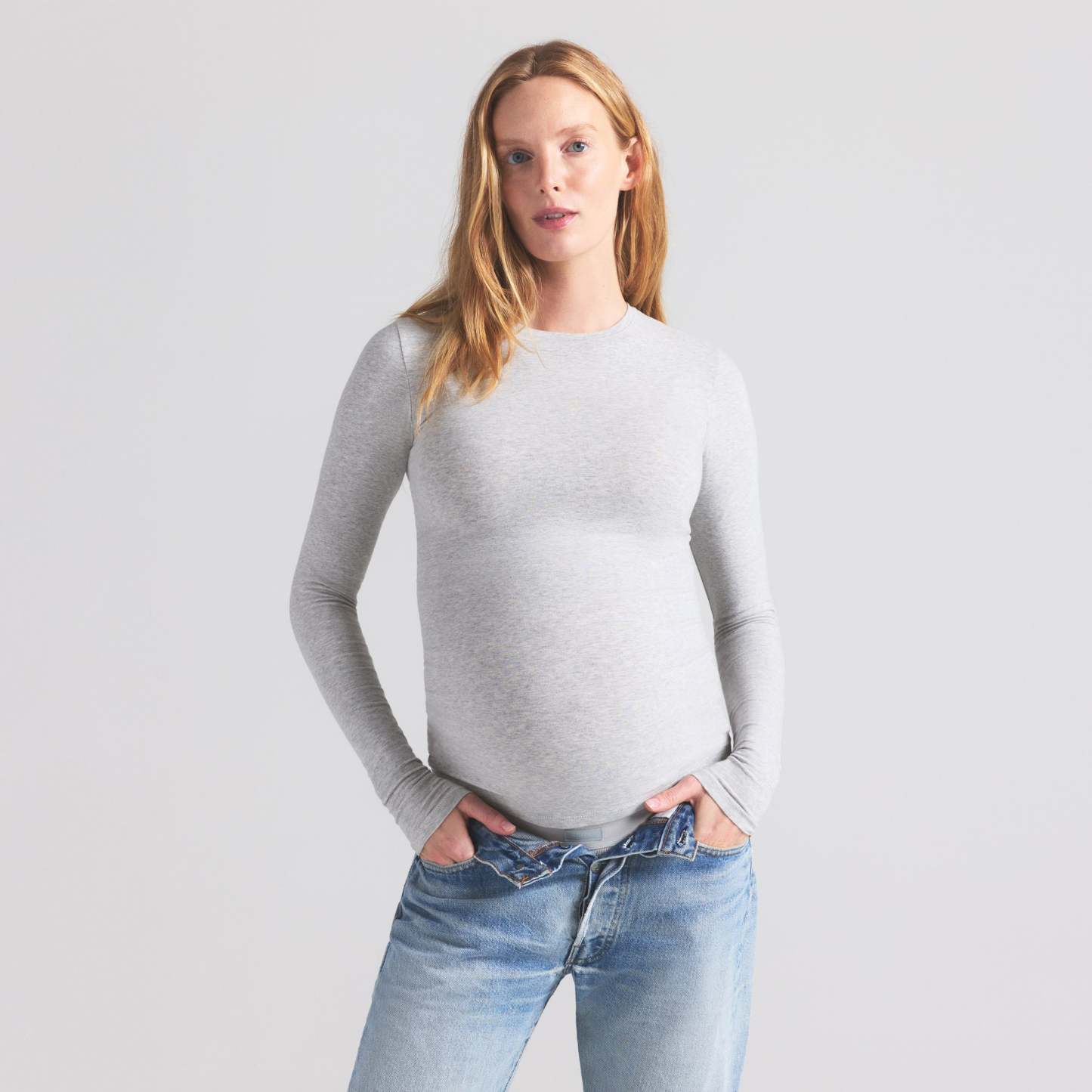 Our best-selling tee made bump-friendly. This long sleeve style is designed in our signature stretchy Cotton Jersey for all-day comfort. Made for lounging or leaving home, this flattering crew neck tee features ample room for your growing bump.
