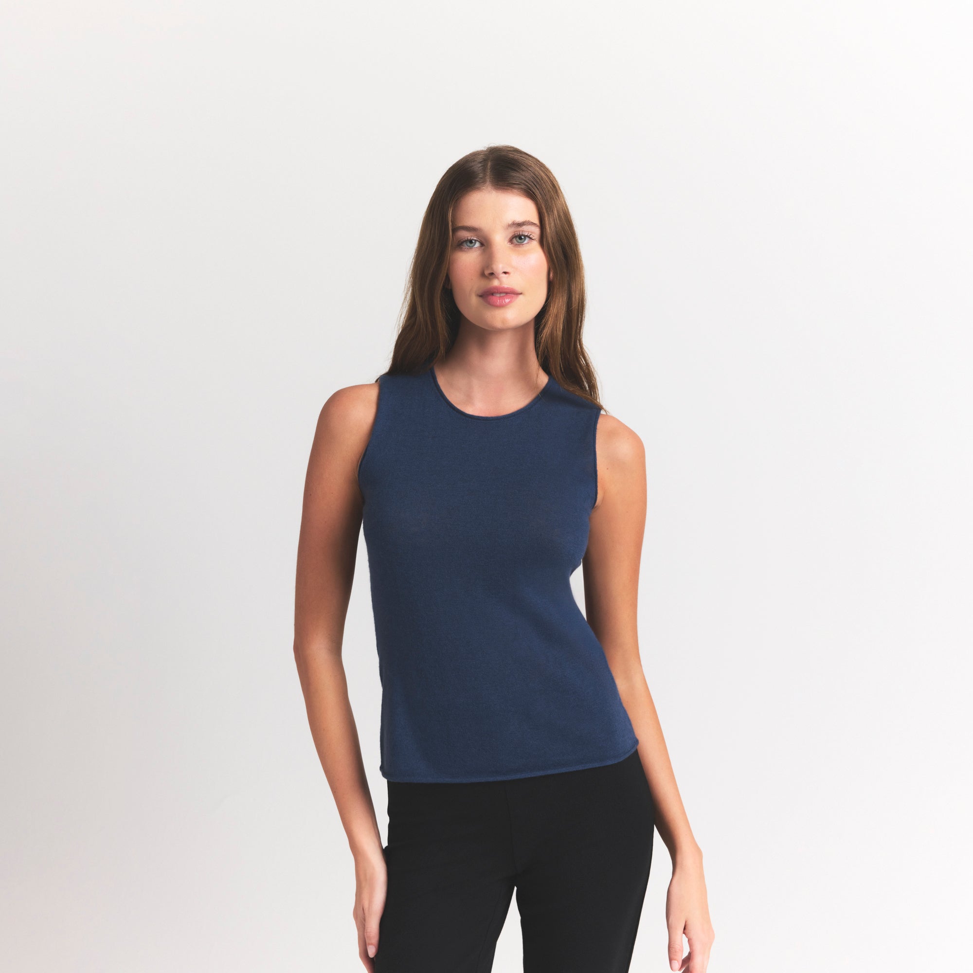 Refined, polished style. This semi-sheer sleeveless top is your-go to layer for luxe comfort, designed in our lightweight, 100% Grade A Cashmere. Features a crew neckline and rolled edge details.