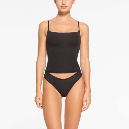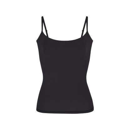 - Fitted double-lined cami, Shelf bra, Wide scoop neckline, Standard length, Intended to hit top of hips