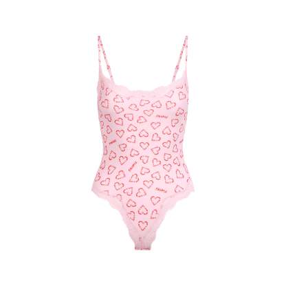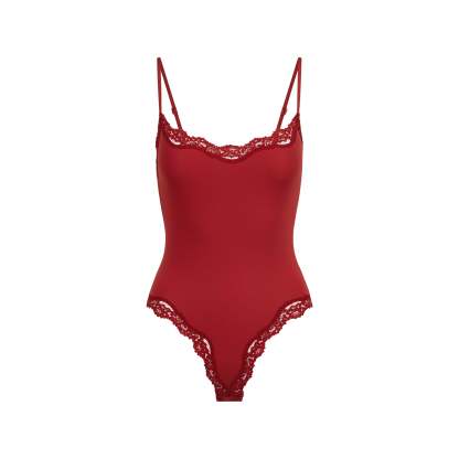Buttery-soft and ultra-flattering, this romantic stretchy lace trim bodysuit is a must-have. Features a scoop front neckline, adjustable straps, and a 100% cotton gusset with snap closure. Fits true to size.