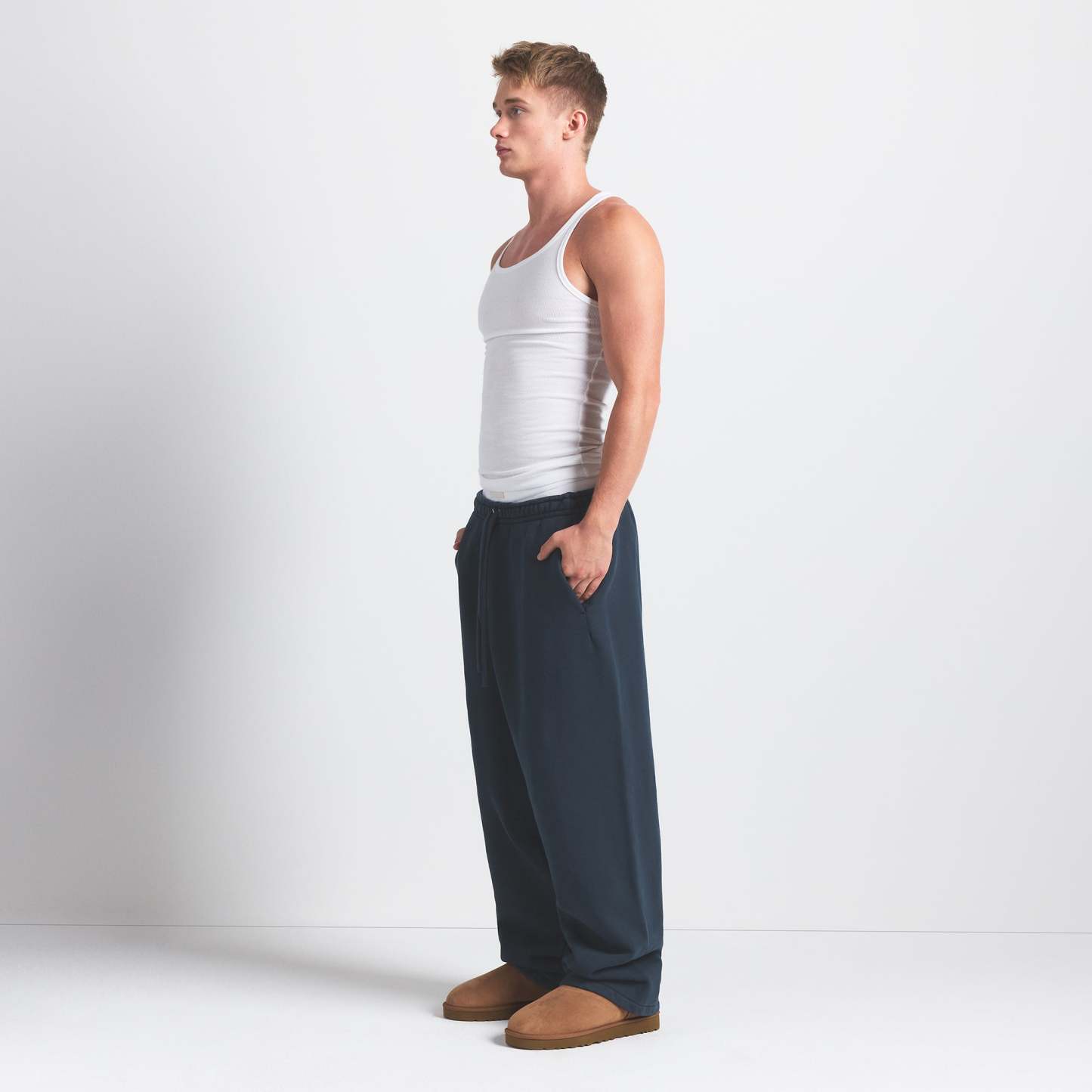 - Relaxed fit, Elastic waistband, Exterior drawcord for adjustability, Darted side pockets, Branded leather patch, Straight leg