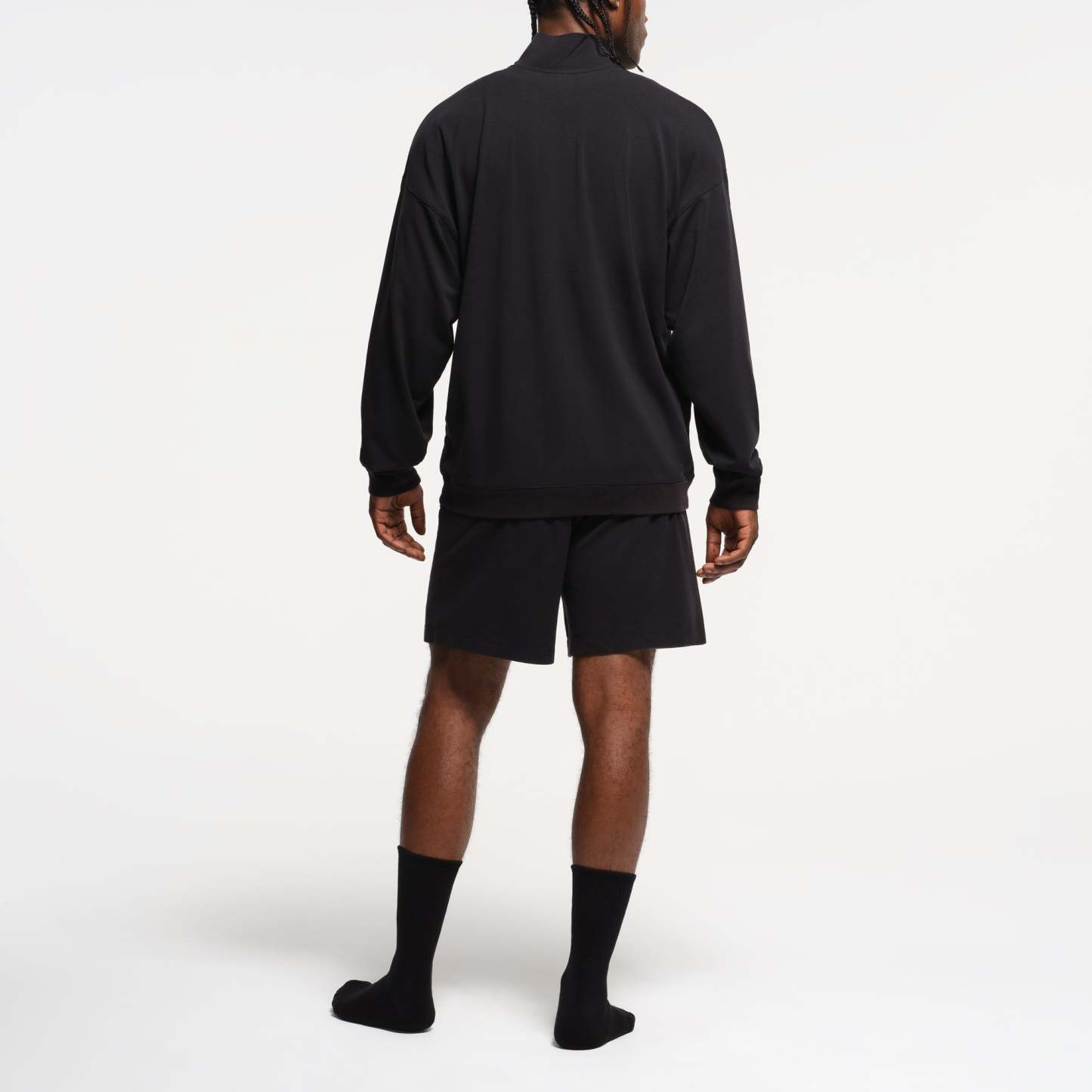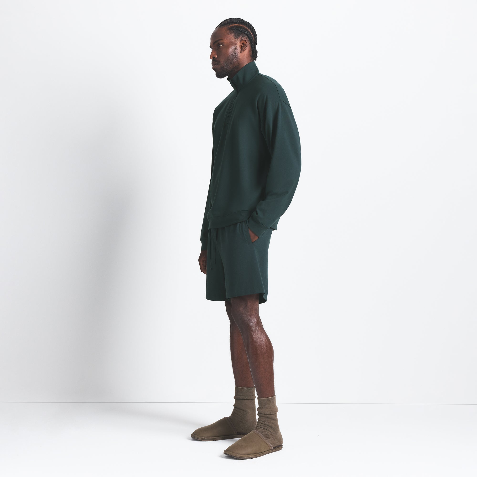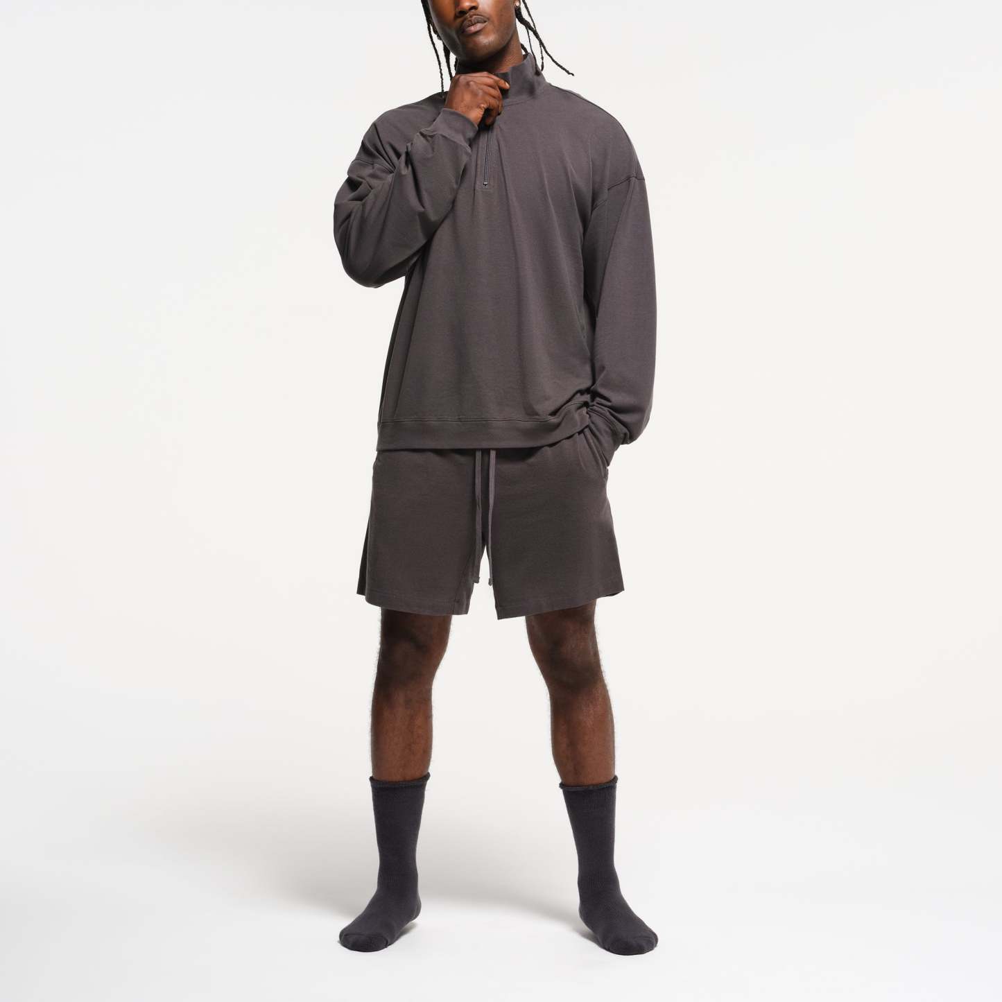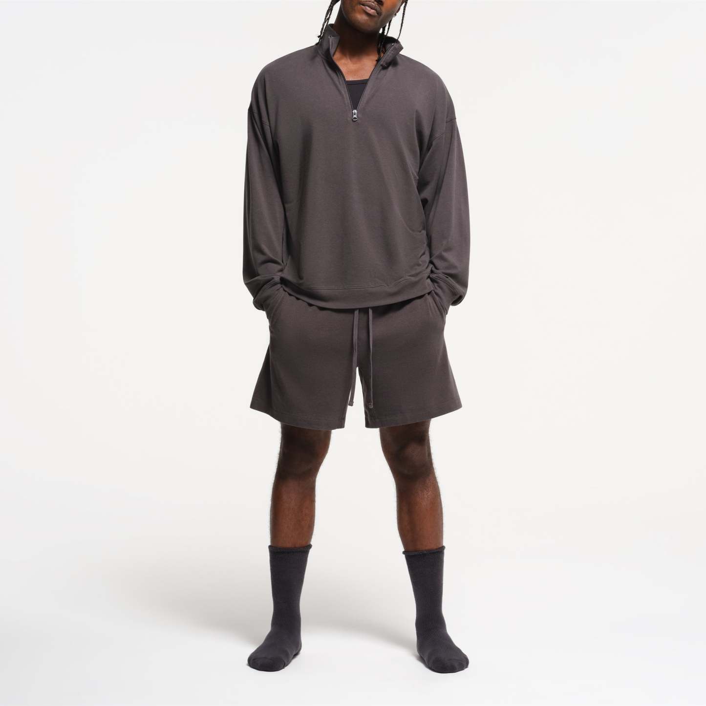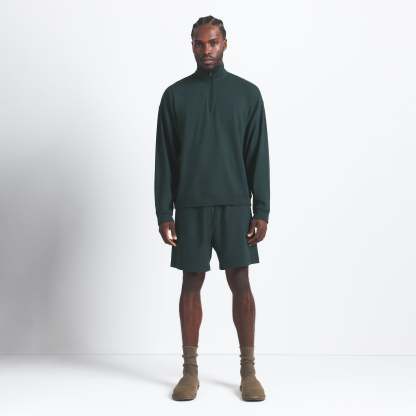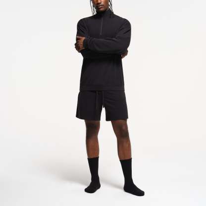 The comfiest quarter zip. Perfect for off days on the couch and around town, this relaxed lounge staple boasts our soft, stretchy jersey fabric. Features a collar, dropped shoulder, and rib details at the cuff and hem. Fits true to size