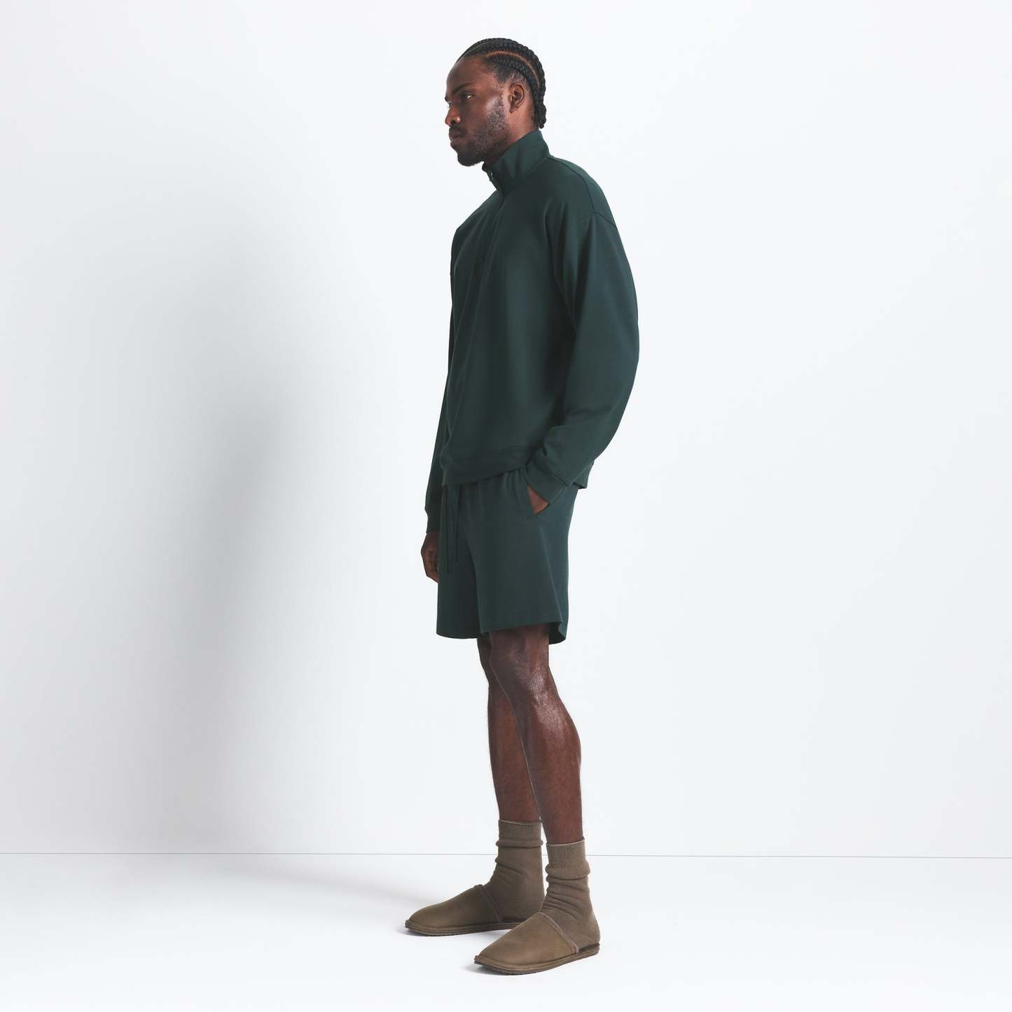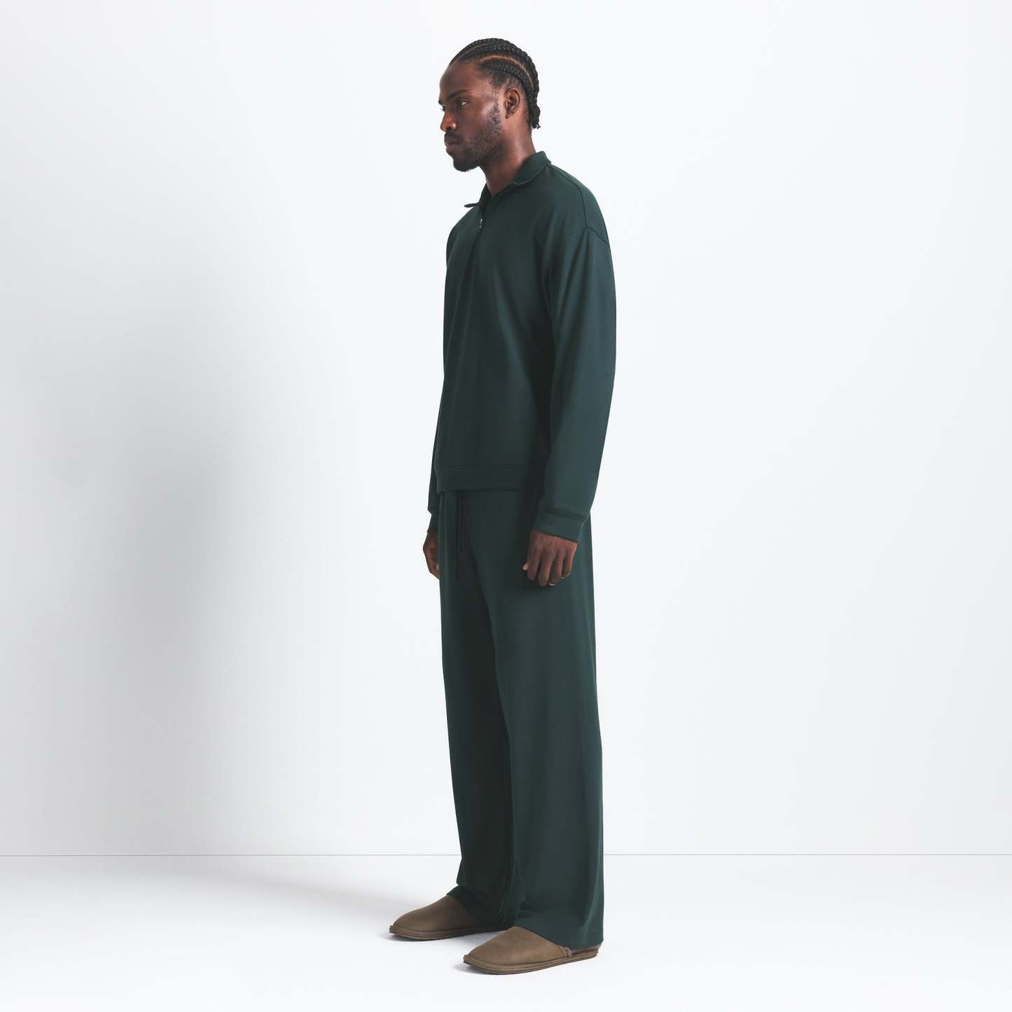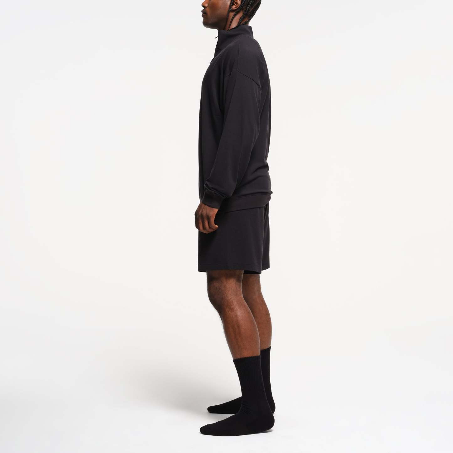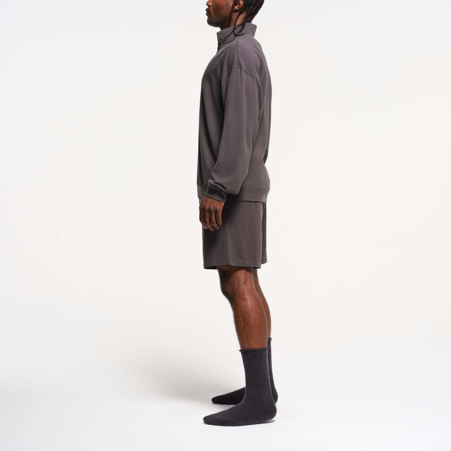 The comfiest quarter zip. Perfect for off days on the couch and around town, this relaxed lounge staple boasts our soft, stretchy jersey fabric. Features a collar, dropped shoulder, and rib details at the cuff and hem. Fits true to size