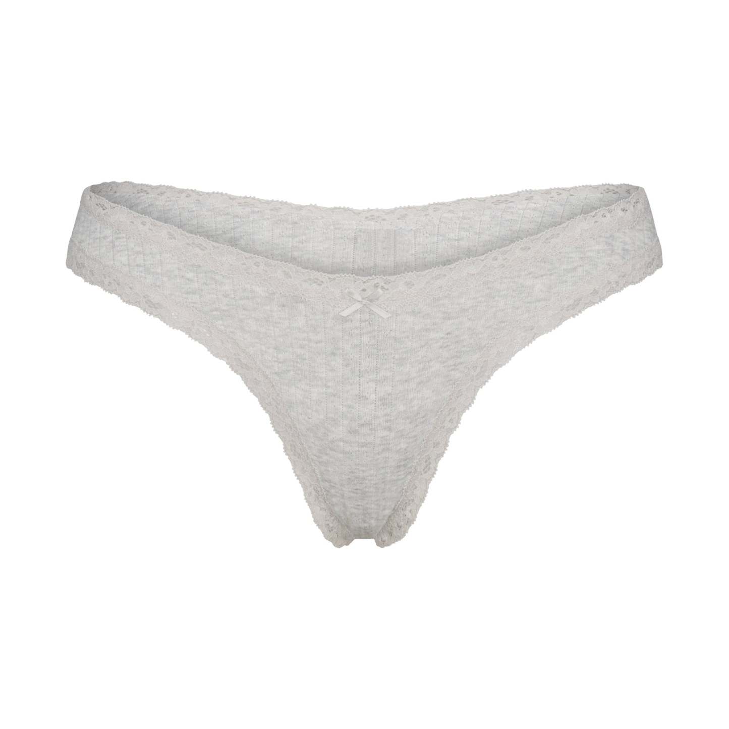 Light, lacy, and soft. Sweeten your top drawer with this pretty thong, designed in our new lightweight cotton pointelle fabric. Features lace trim details at the waist and leg opening and a center bow detail. Complete with a 100% cotton gusset and fits true to size.