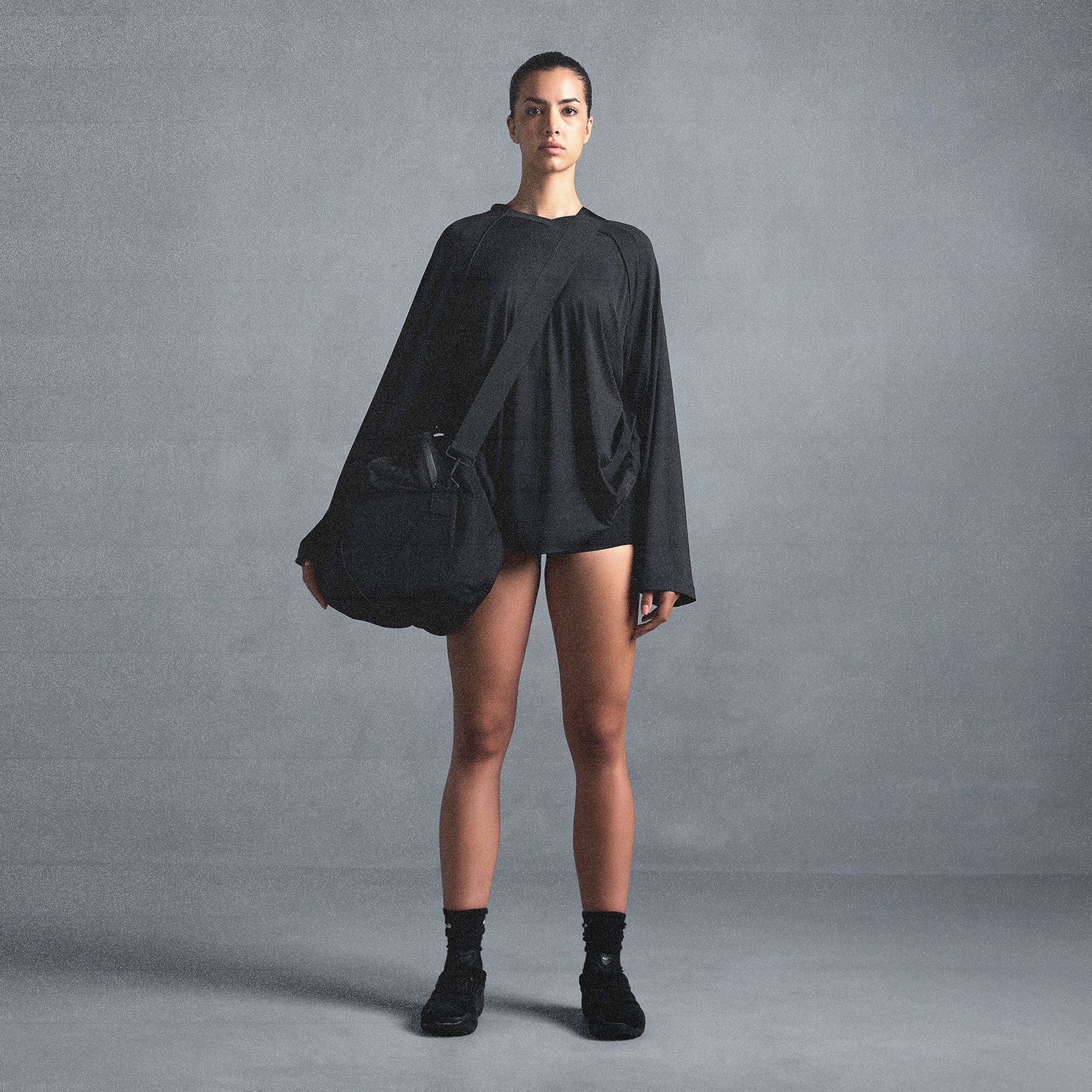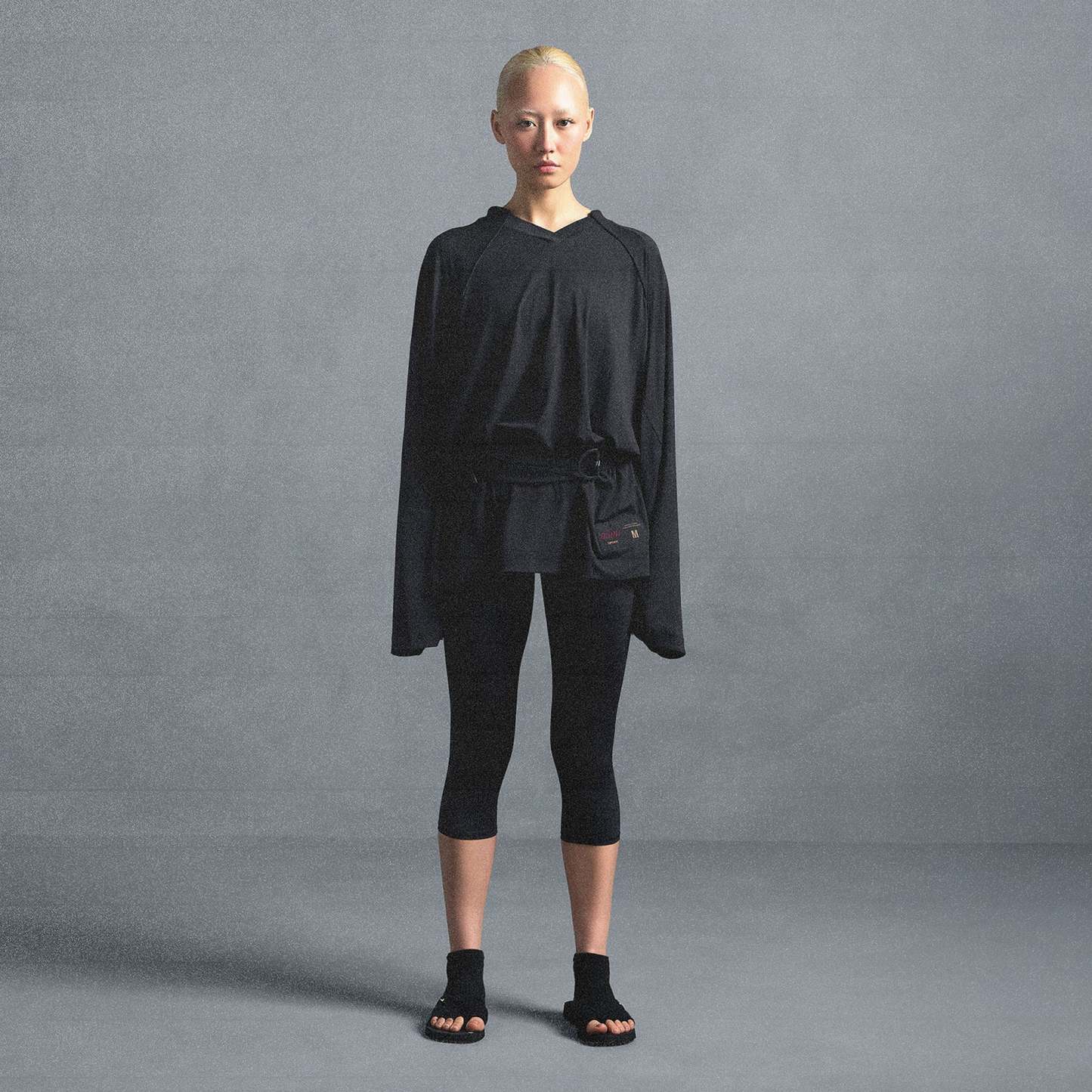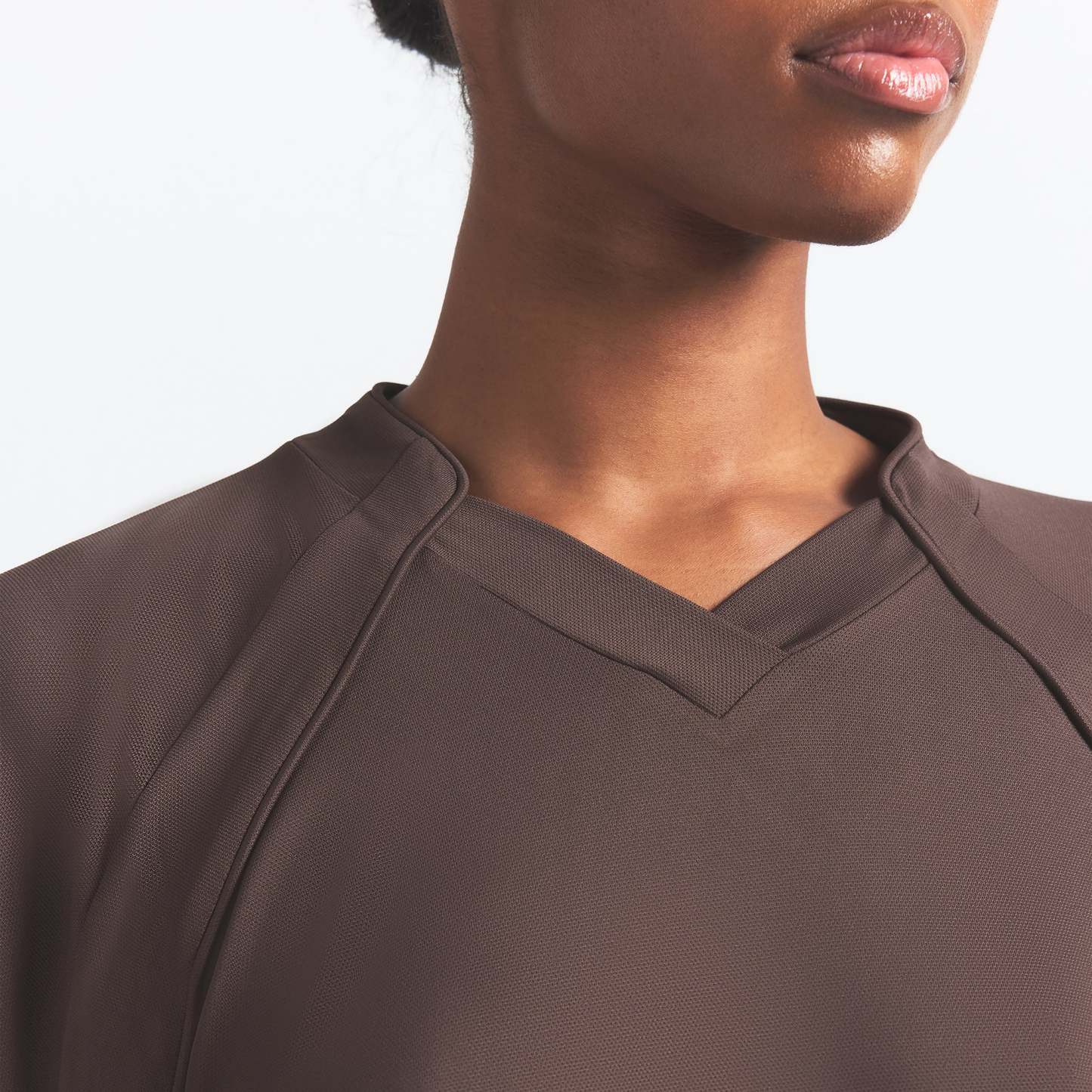 V-neck, Raglan long sleeves, Panel detail on front and sleeve, Woven logo patch on wearers left, Oversized fit