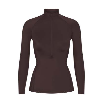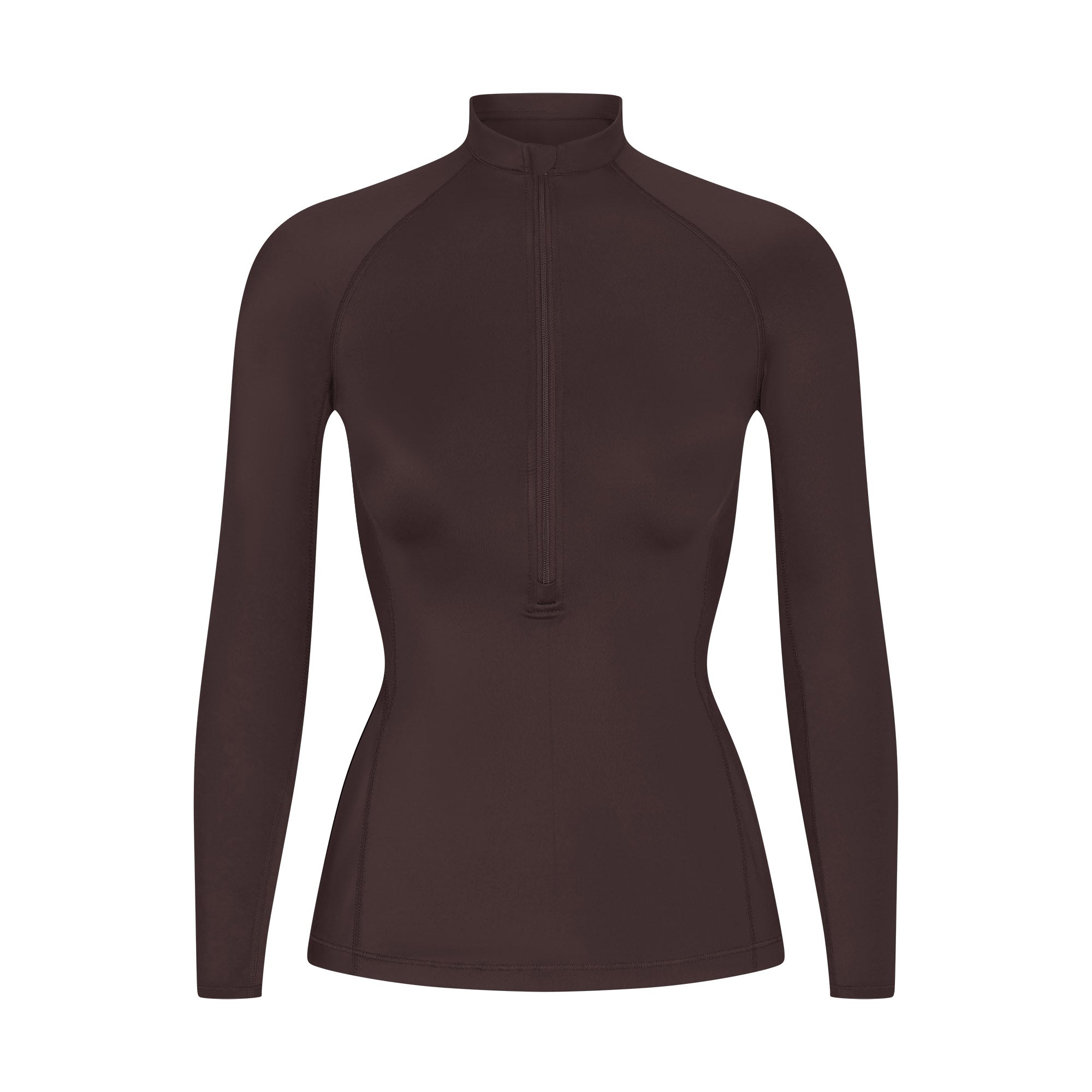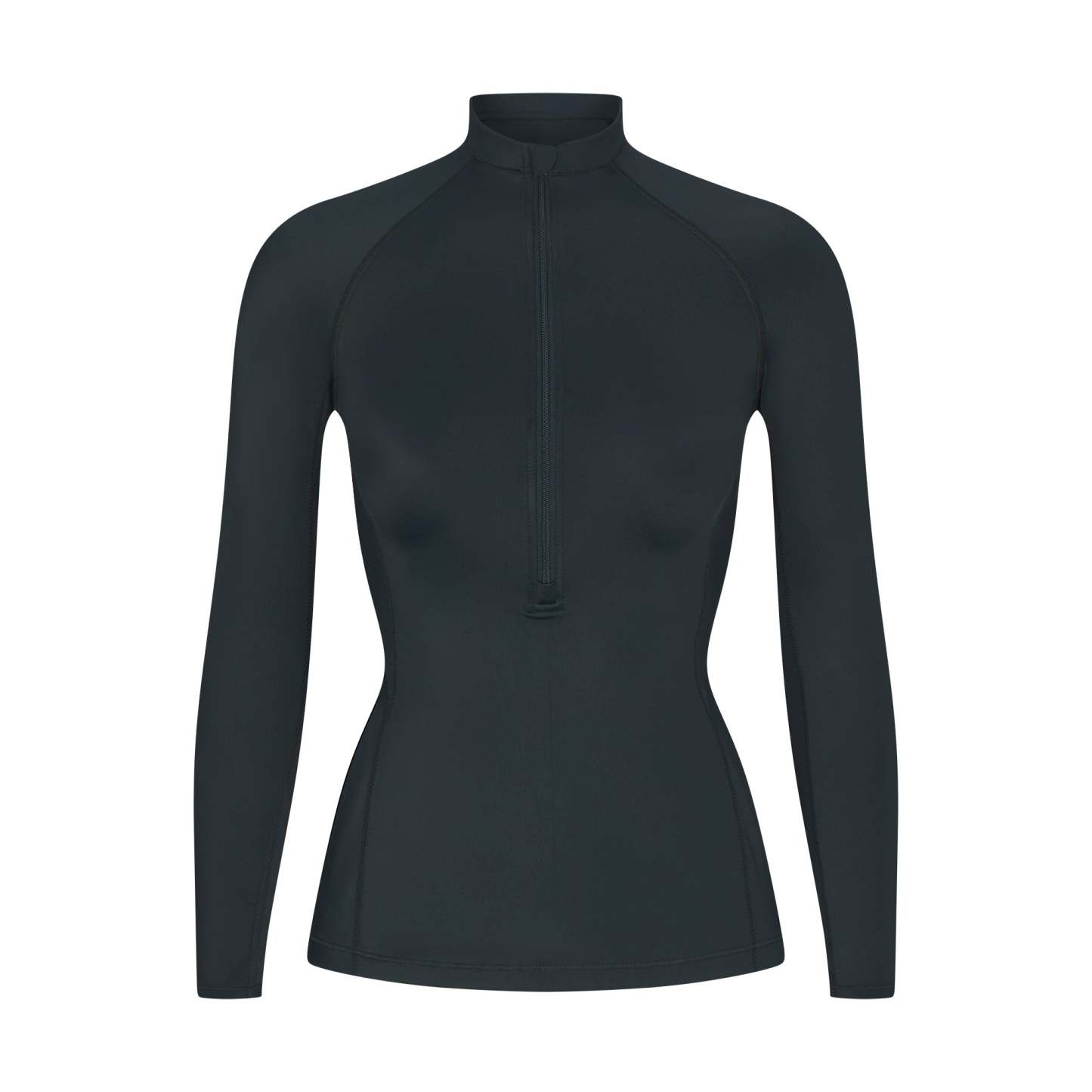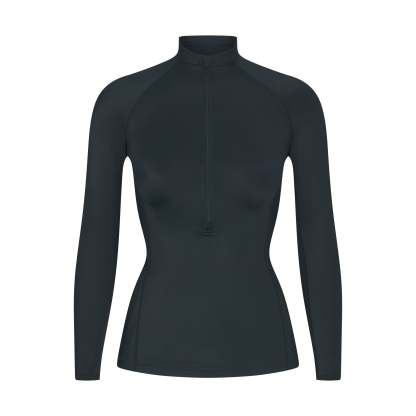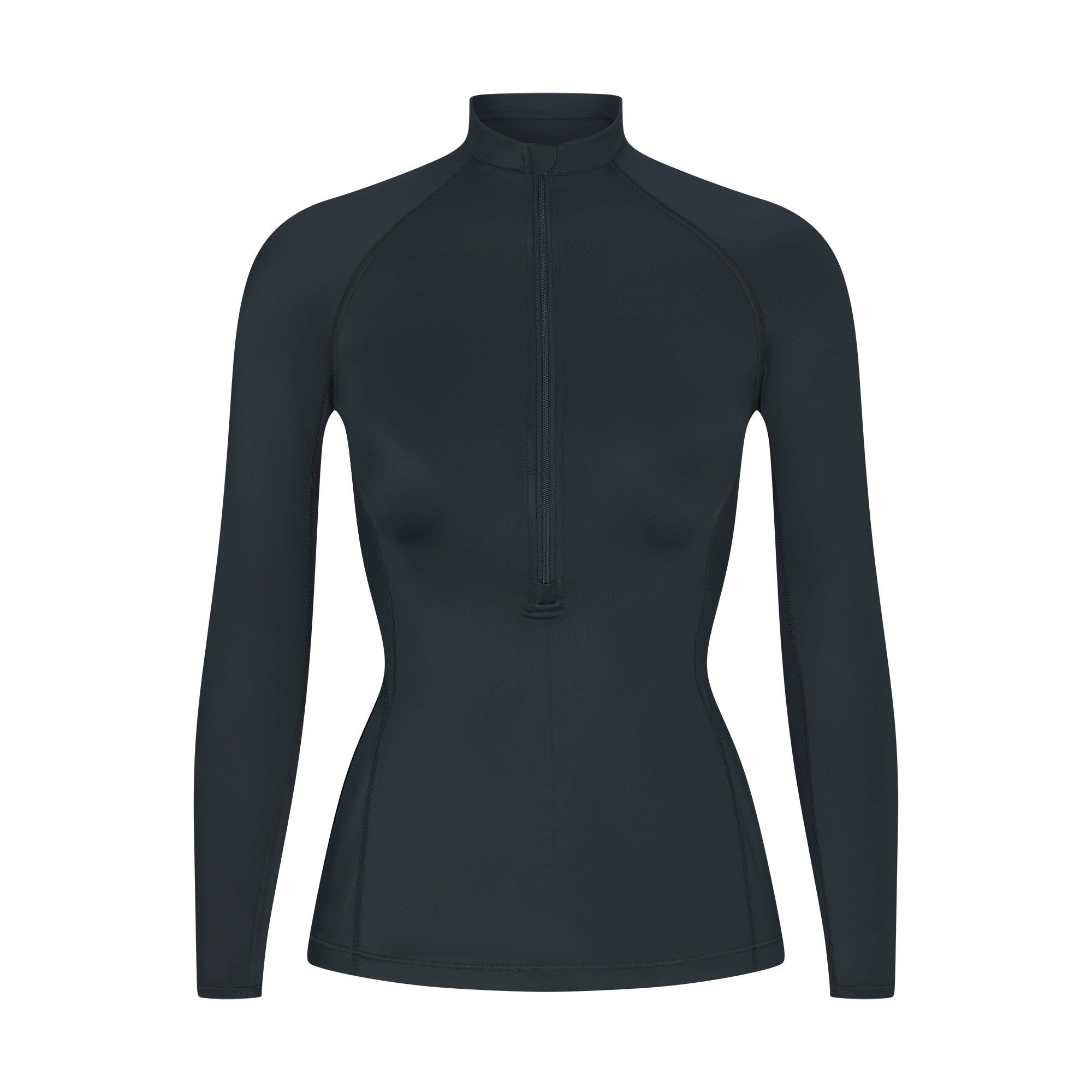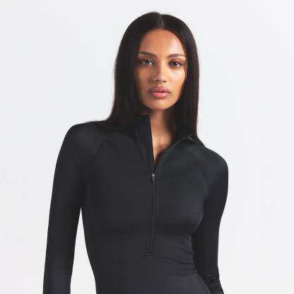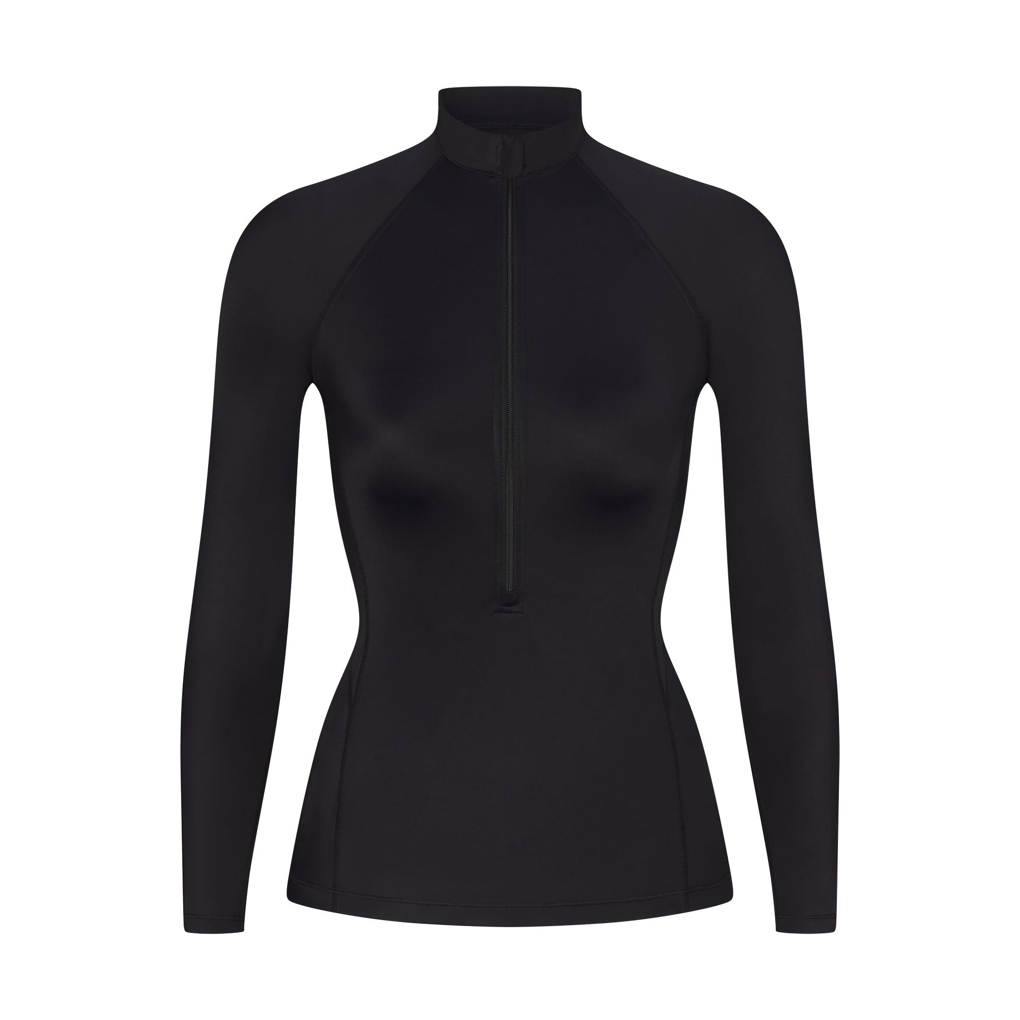 Mock neck, Raglan long sleeves, Half zip closure, Silicone matte logo at center back, Fits tight to body