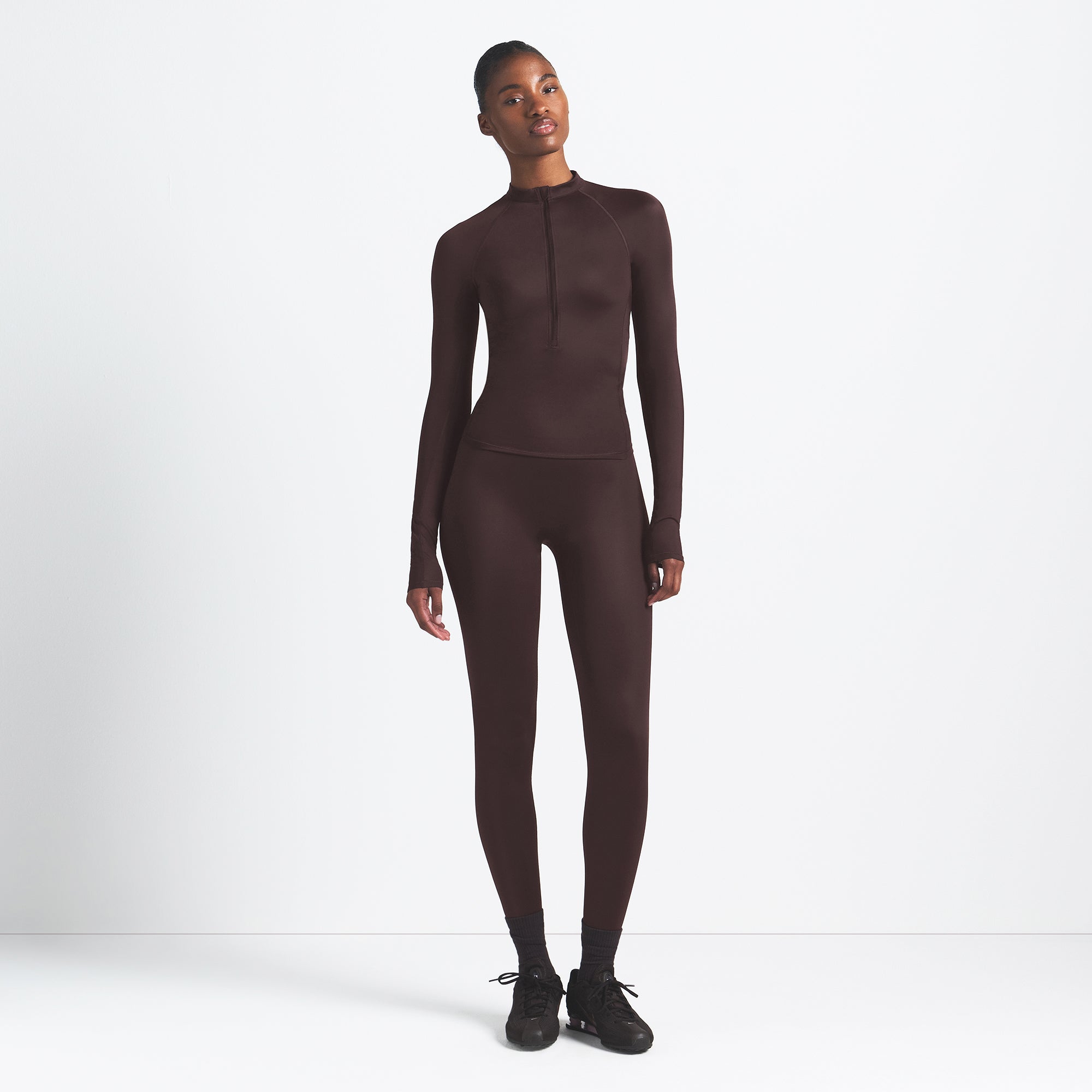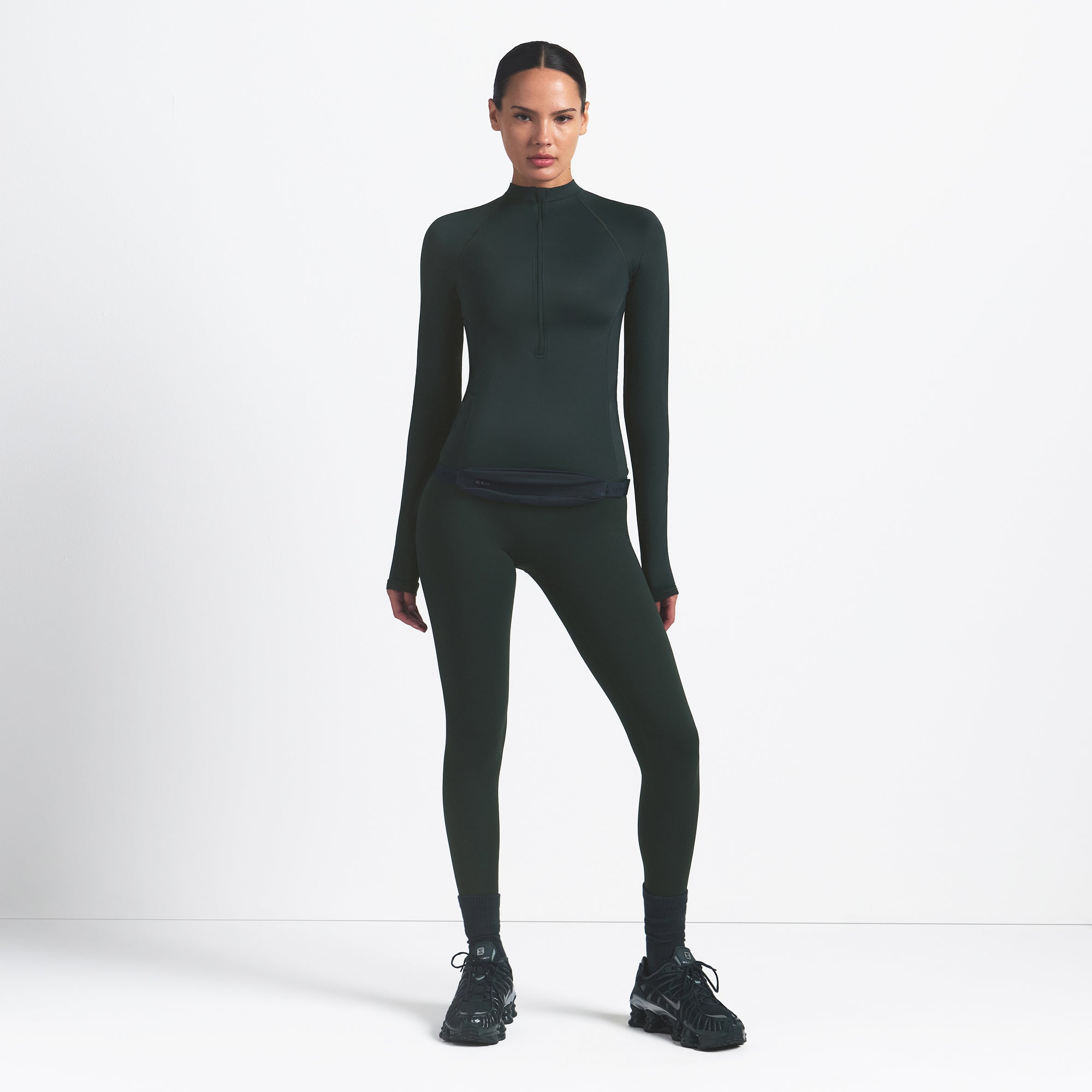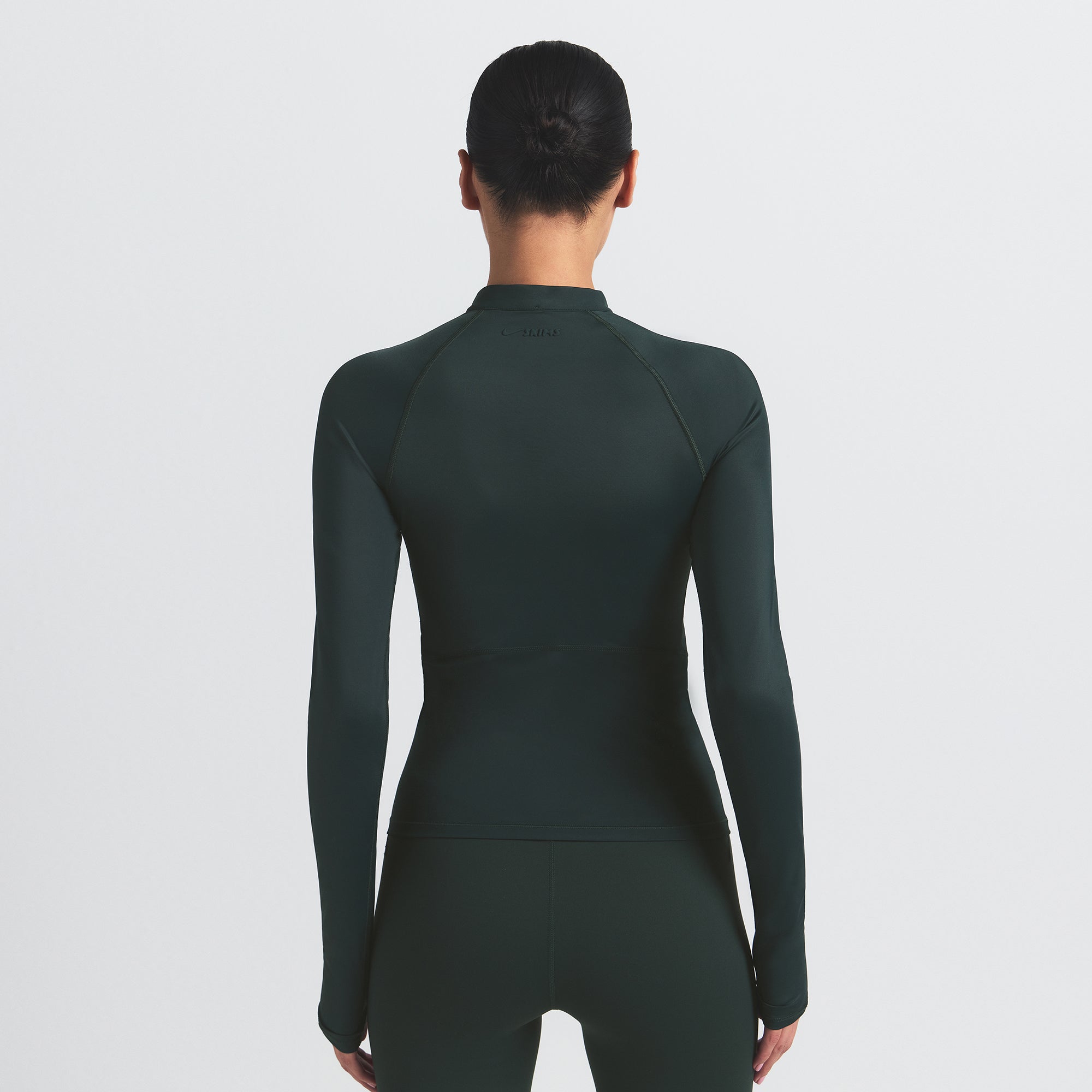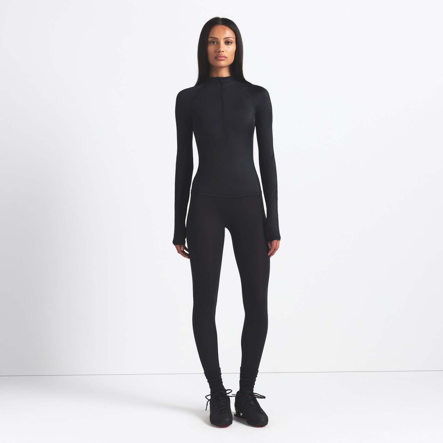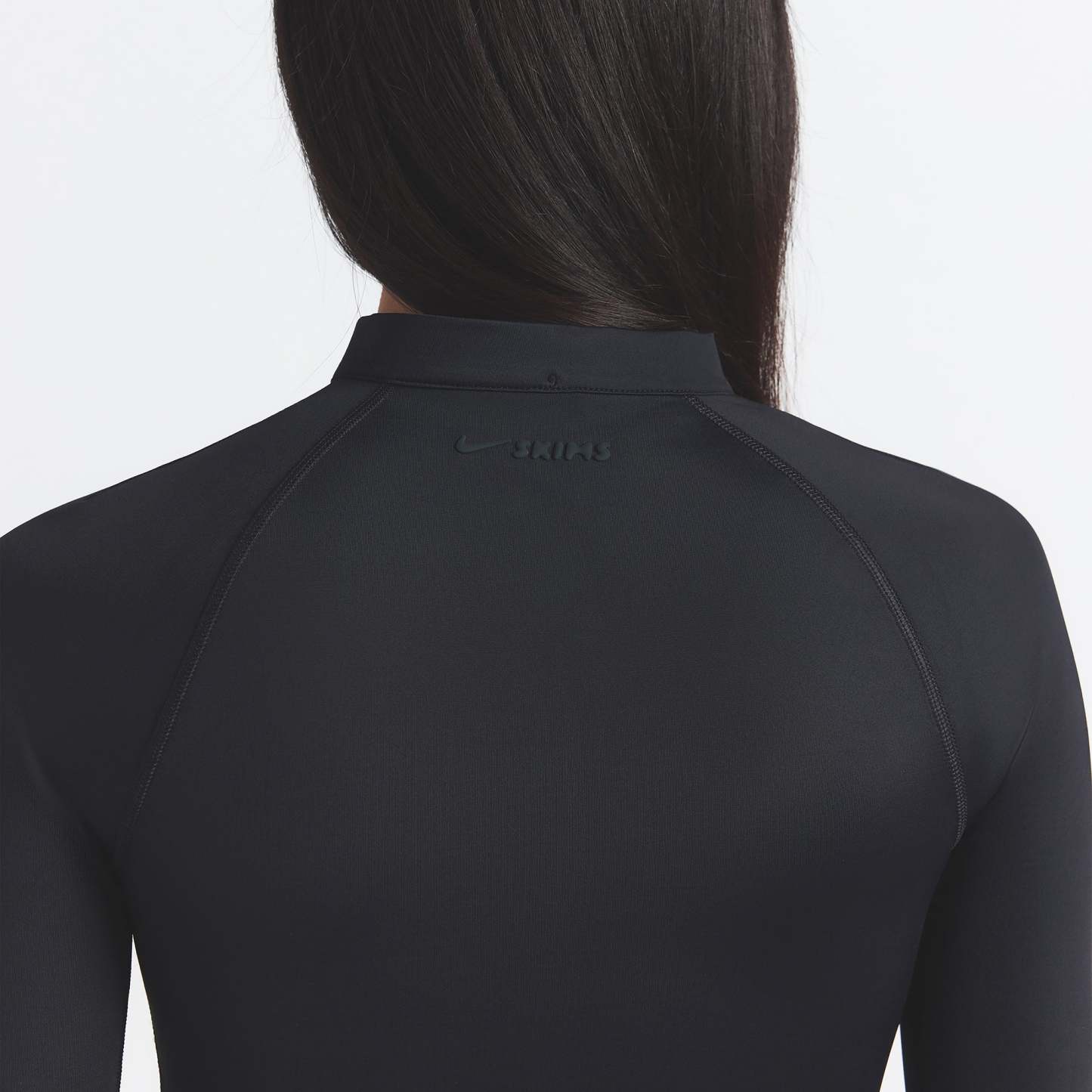 Mock neck, Raglan long sleeves, Half zip closure, Silicone matte logo at center back, Fits tight to body