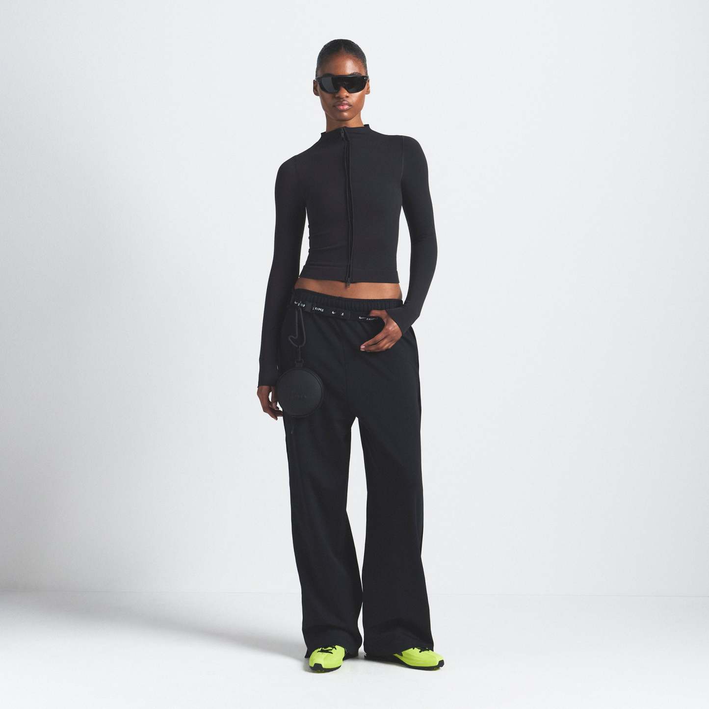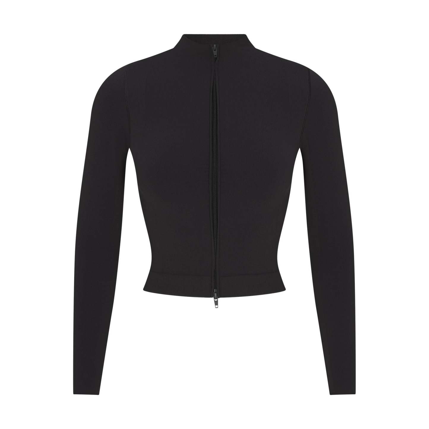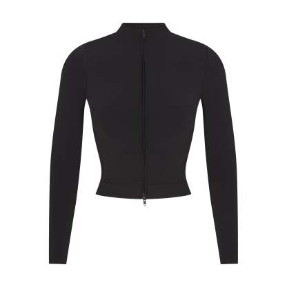 Mock neck, Long sleeves, Full double ended zip closure at center front, Jacquard logo at center back, Fits tight to body