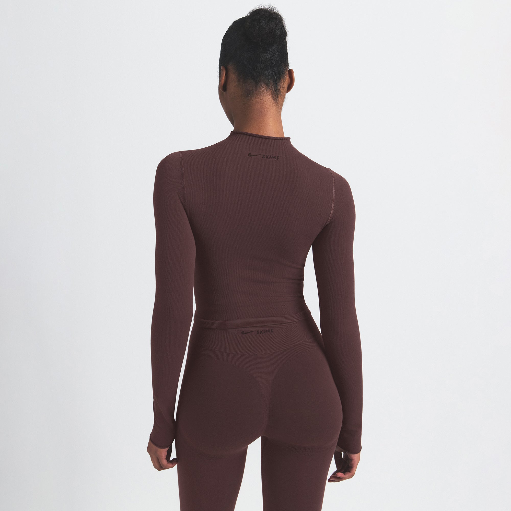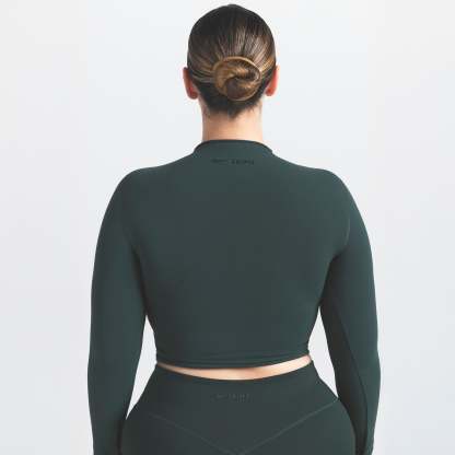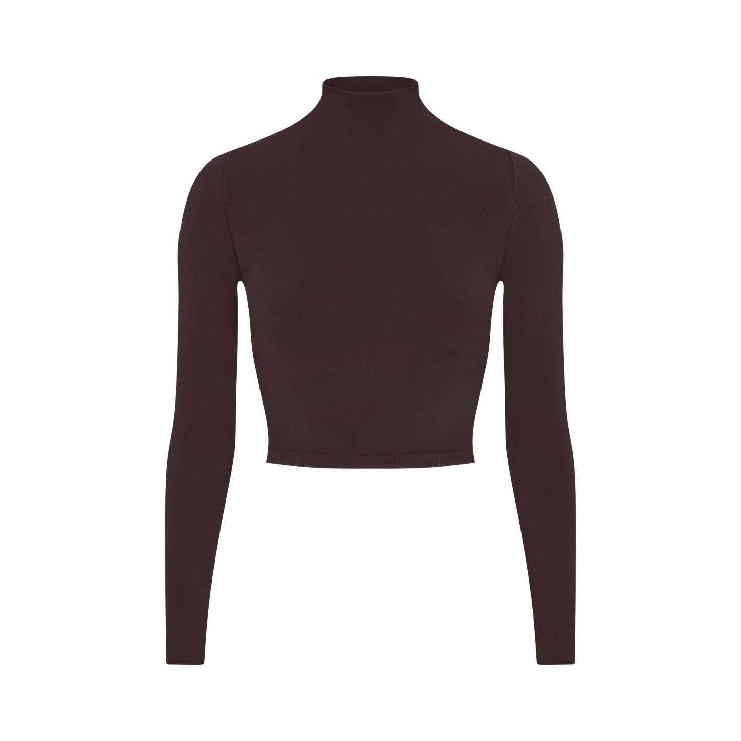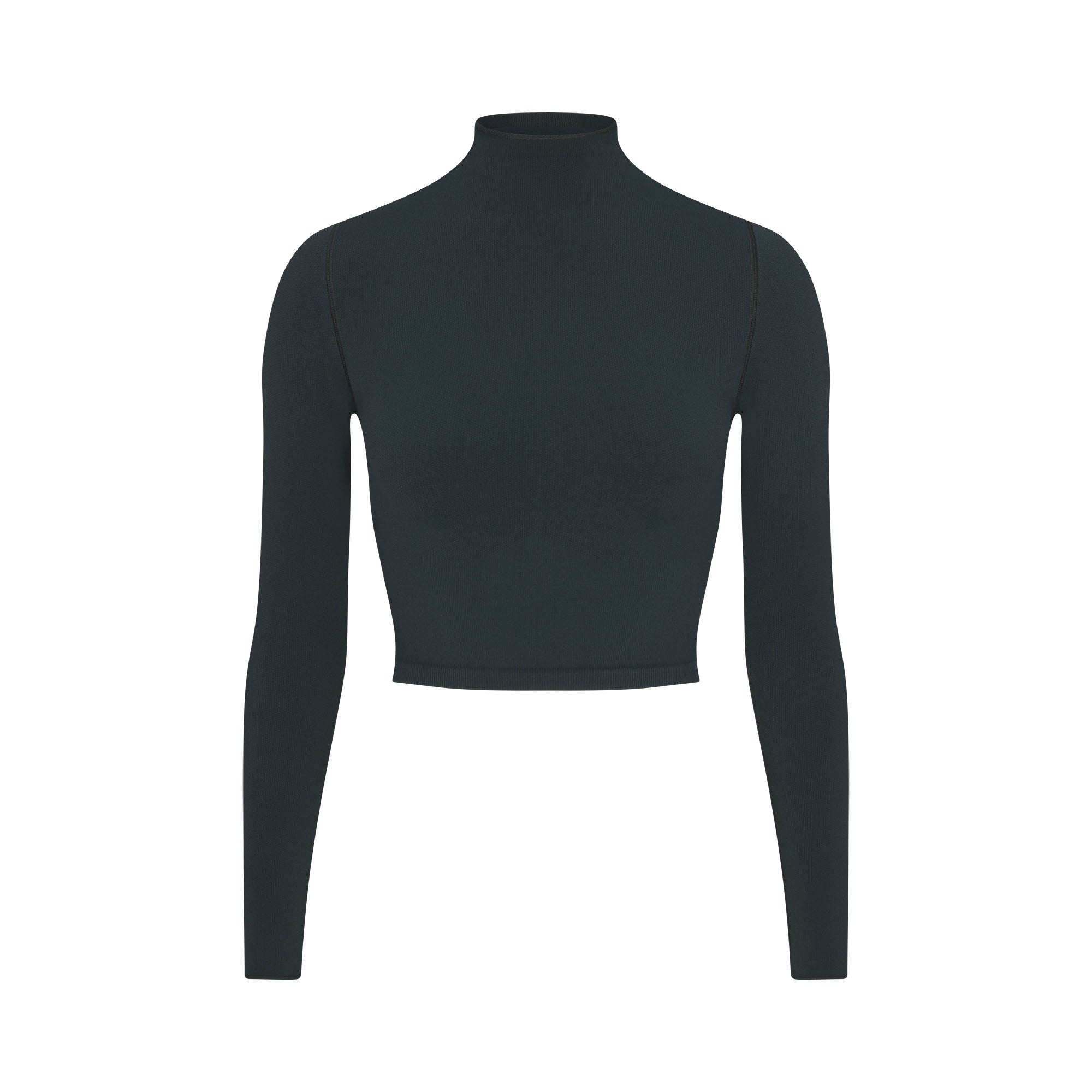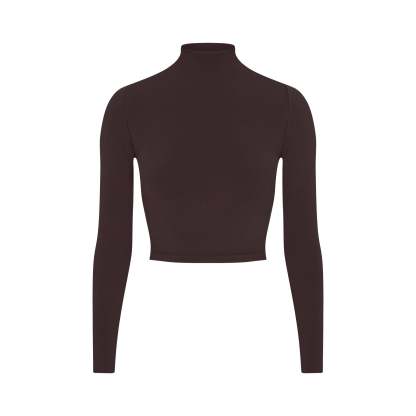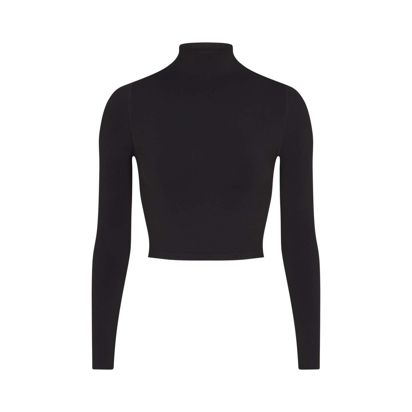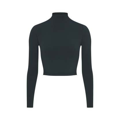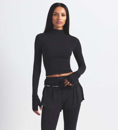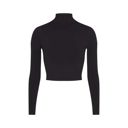 Mock neck, Long sleeves, Logo at center back neck, Fits tight to body, Cropped length