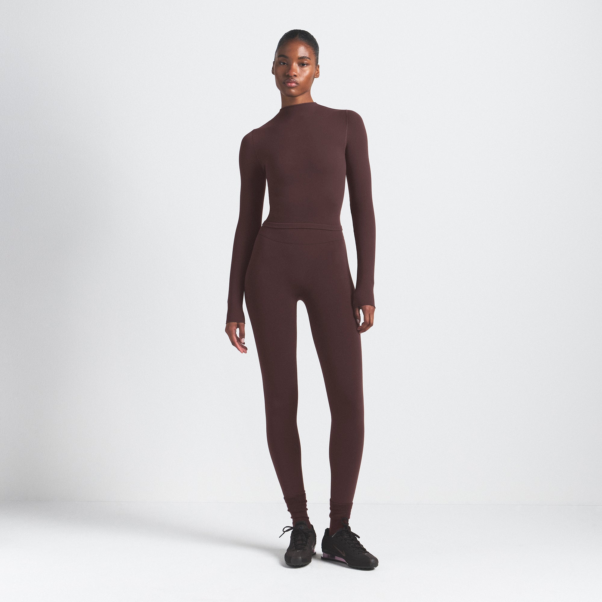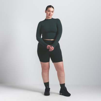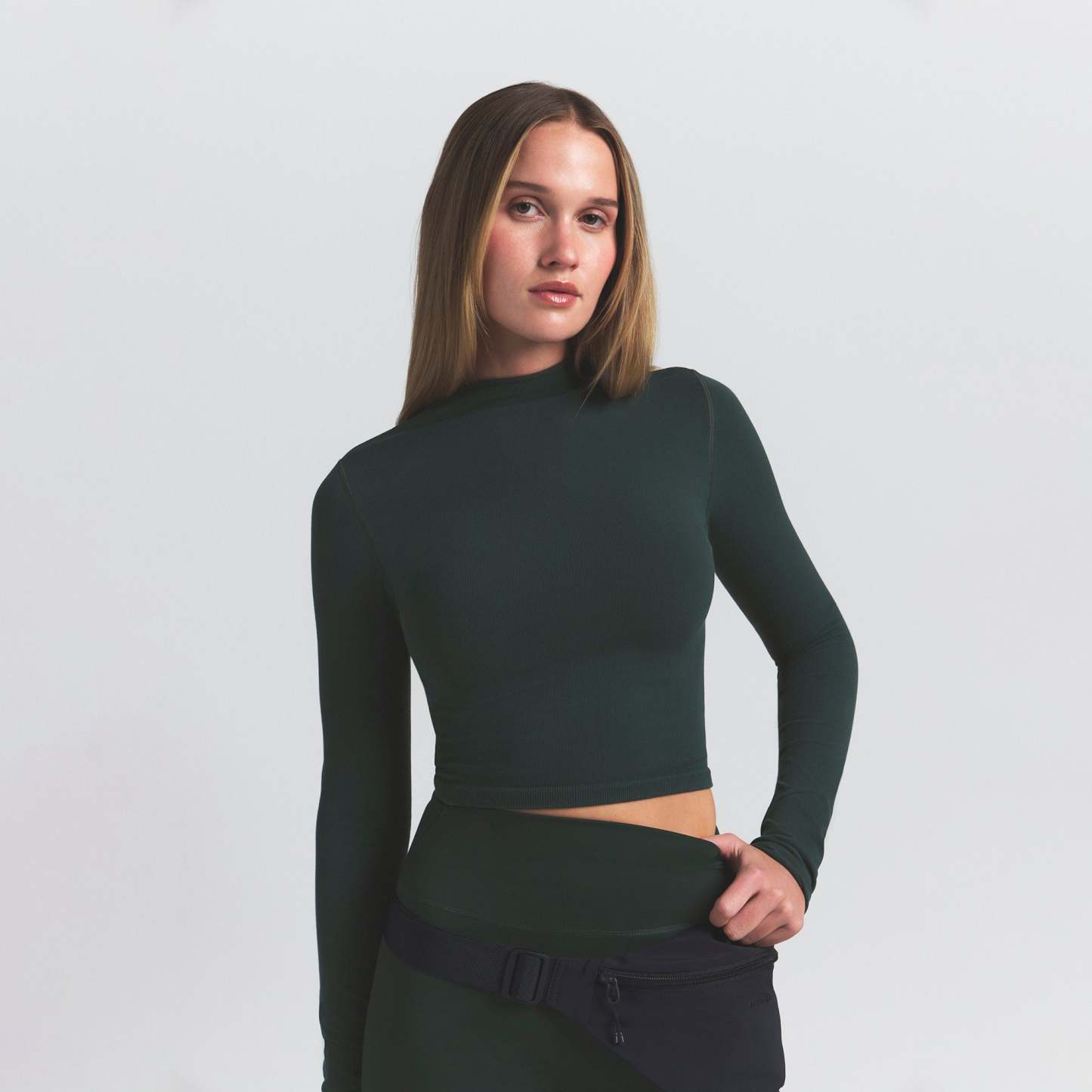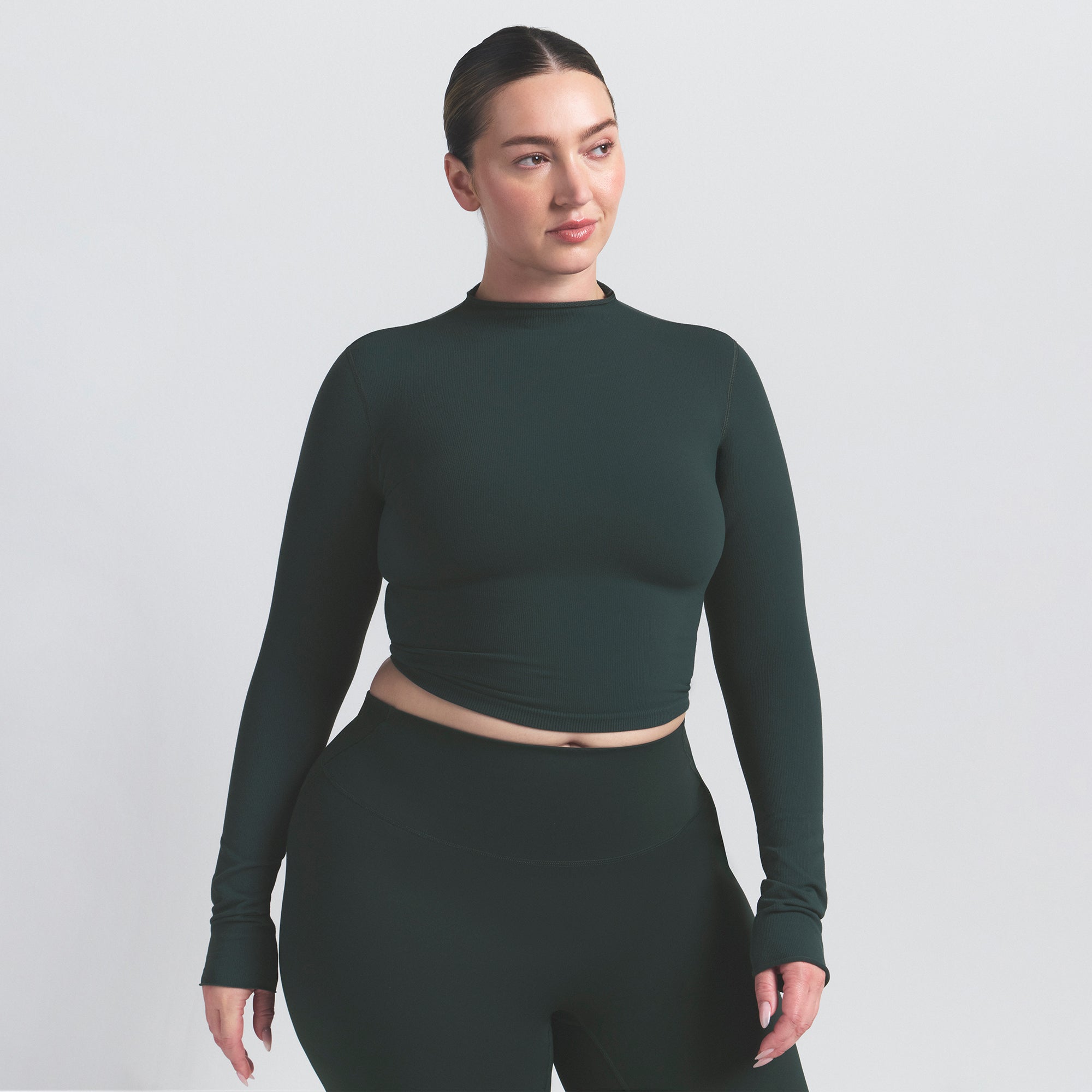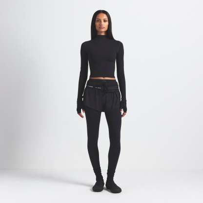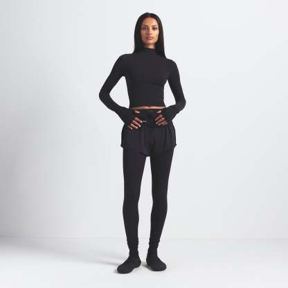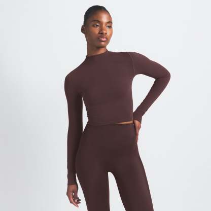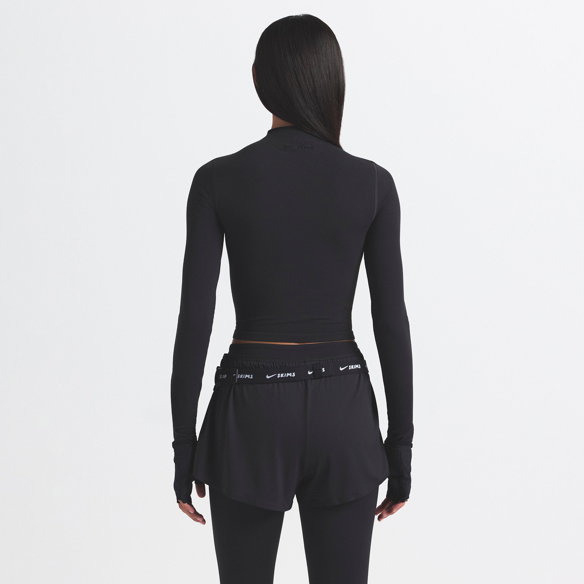Mock neck, Long sleeves, Logo at center back neck, Fits tight to body, Cropped length