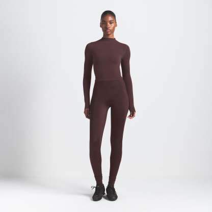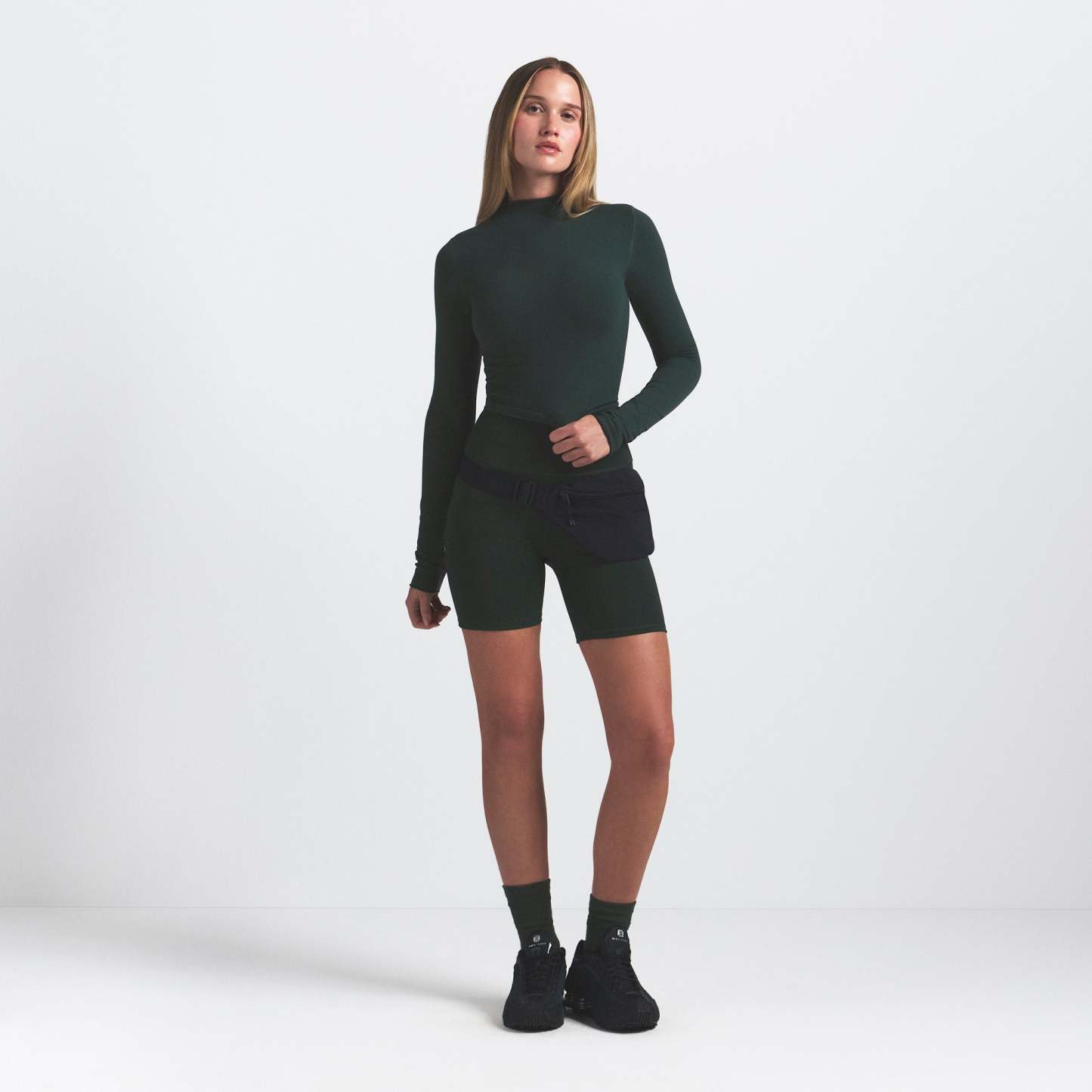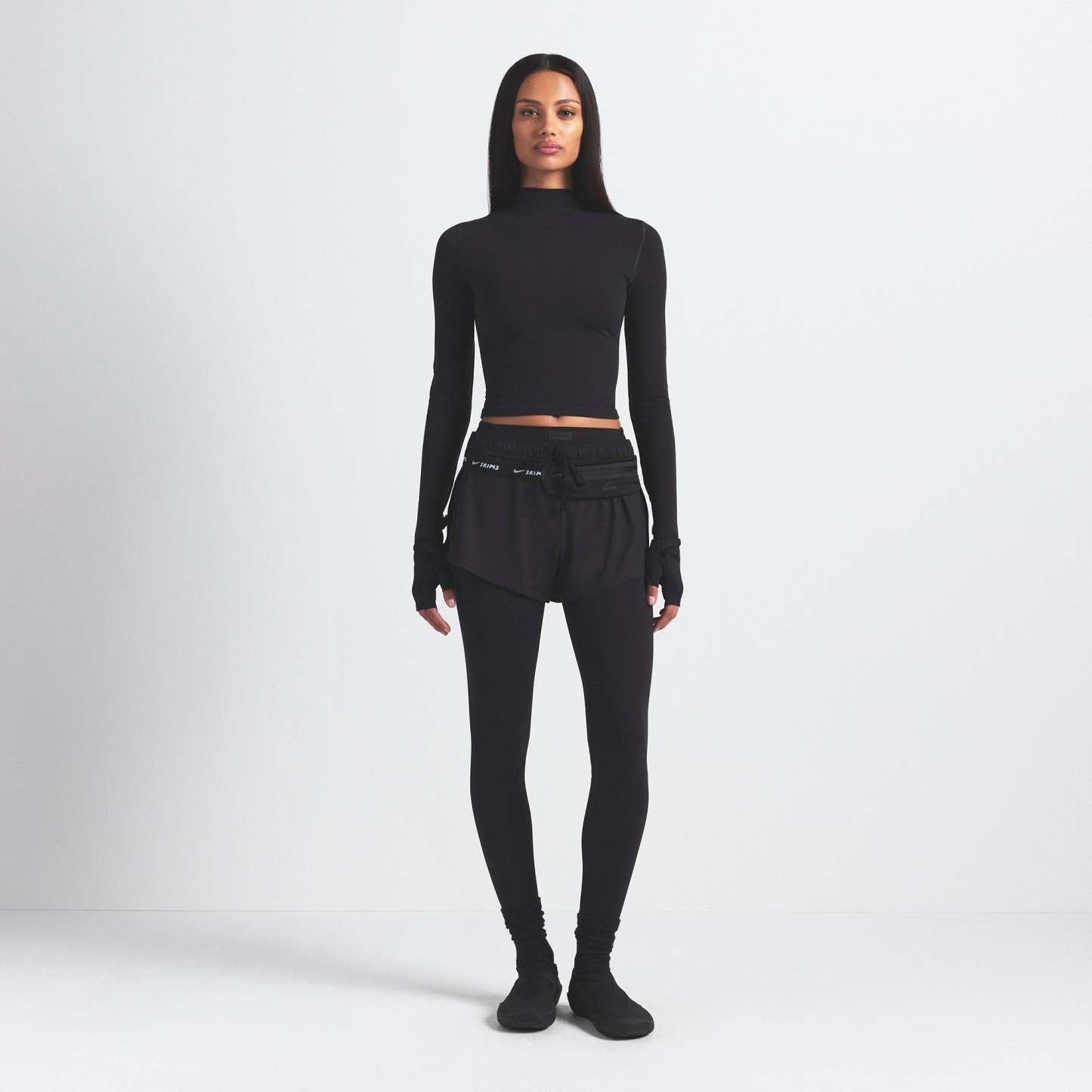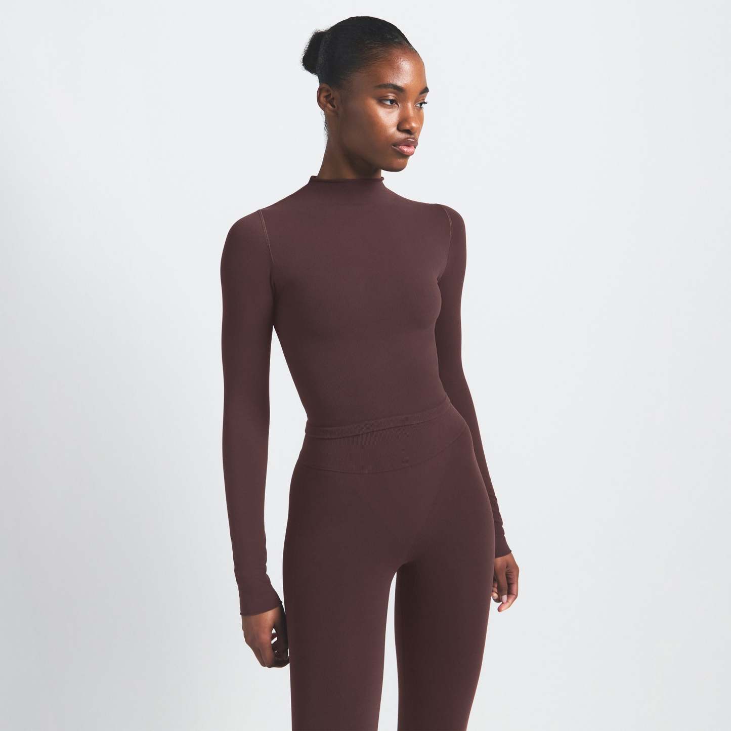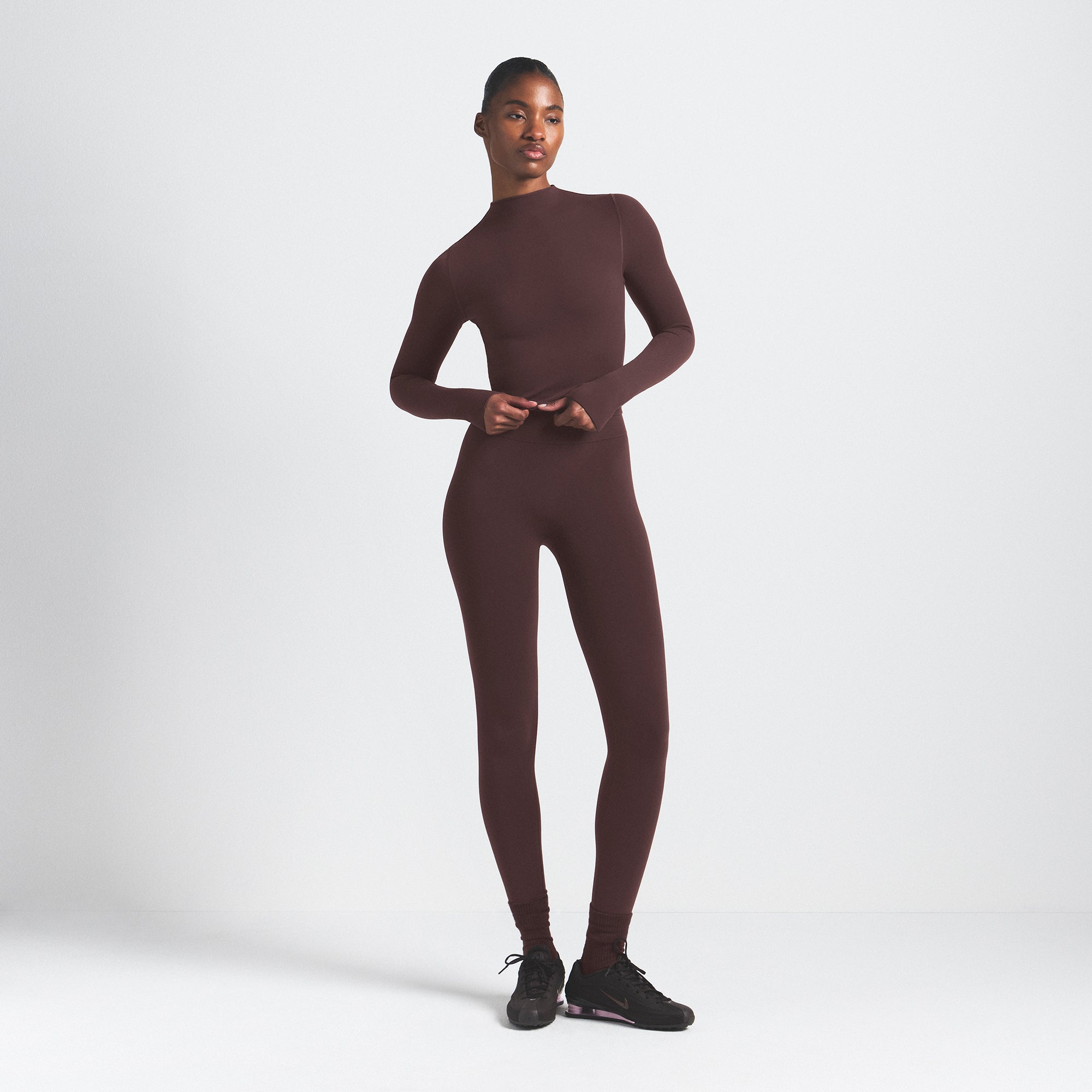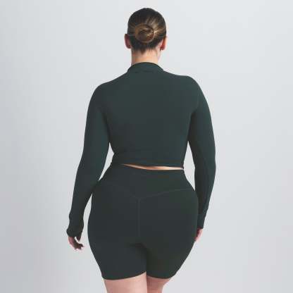 Mock neck, Long sleeves, Logo at center back neck, Fits tight to body, Cropped length