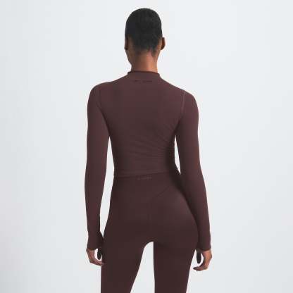 Mock neck, Long sleeves, Logo at center back neck, Fits tight to body, Cropped length