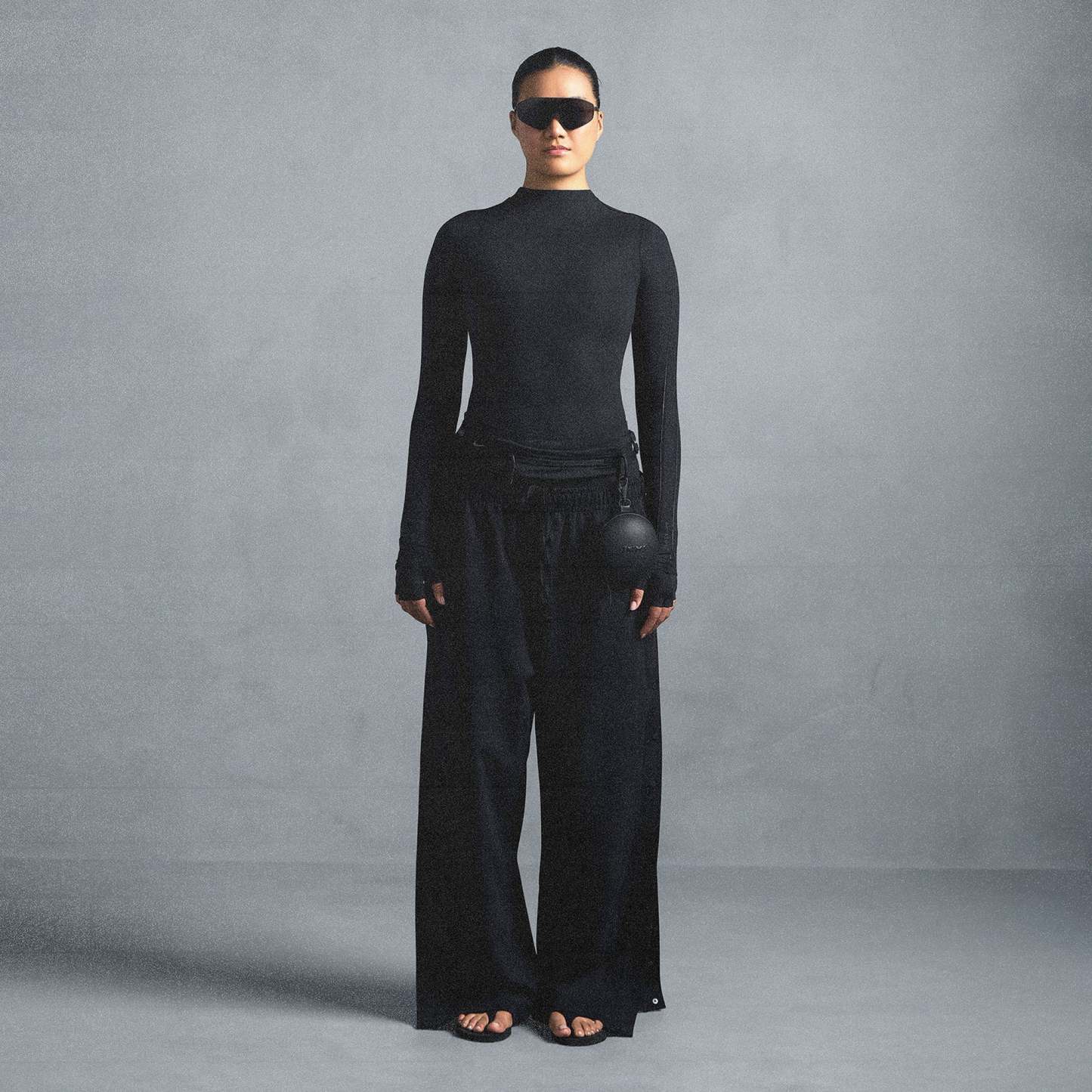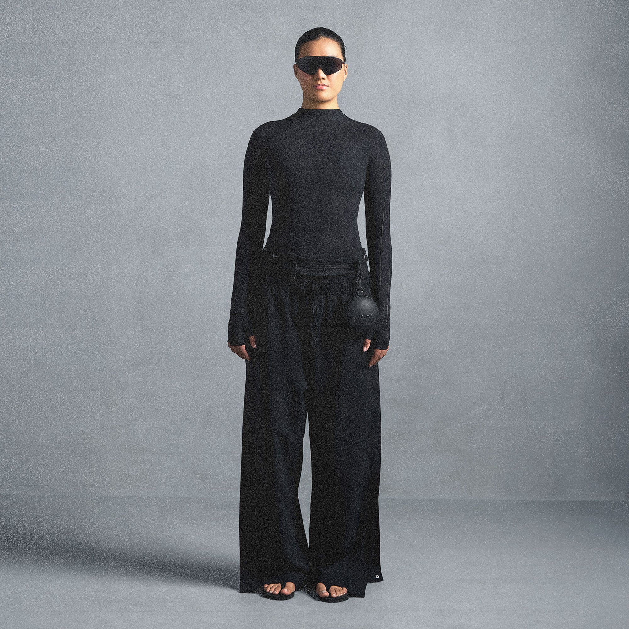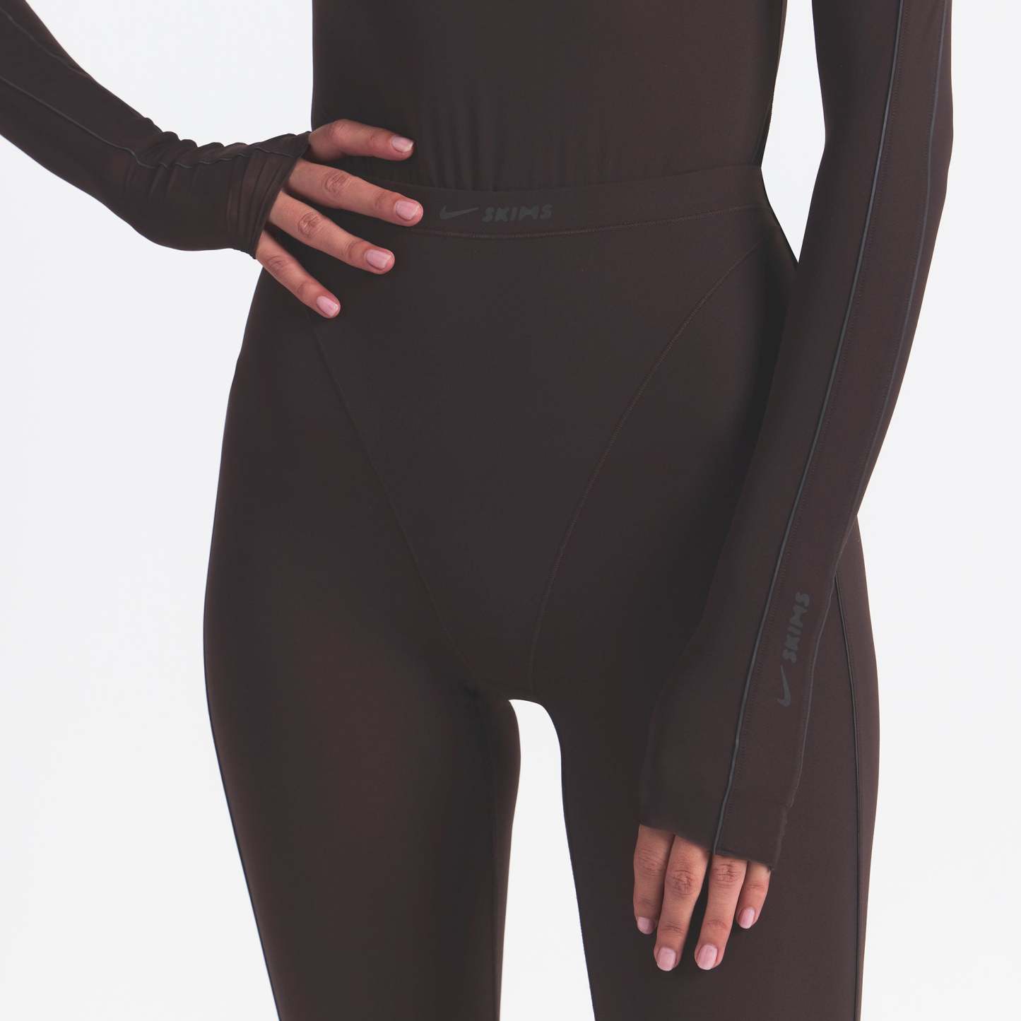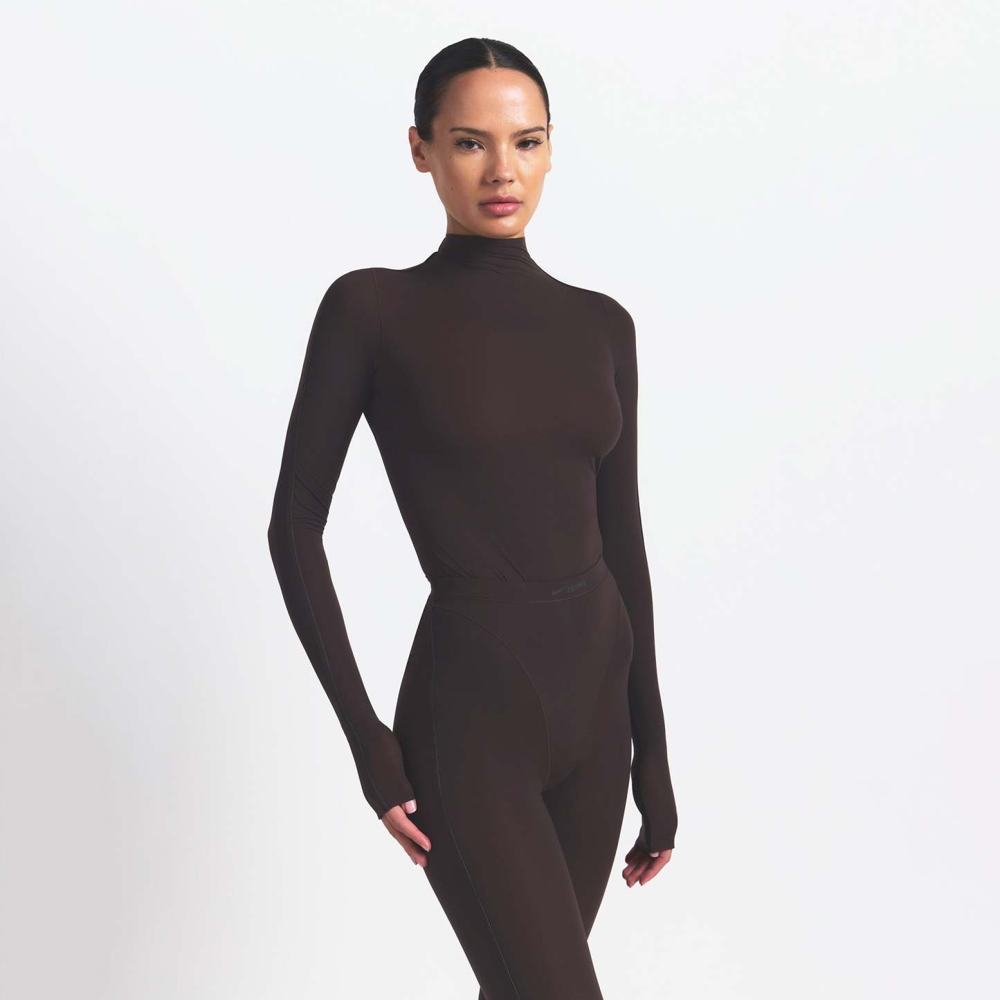 - Mock neck, Long sleeves, Reflective trim details on sleeves, Reflective logo on wearers left sleeve, Raw edge details, Fits tight to body