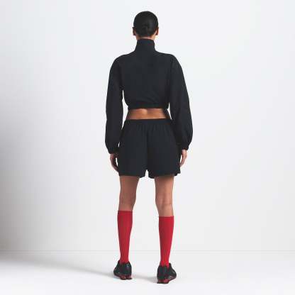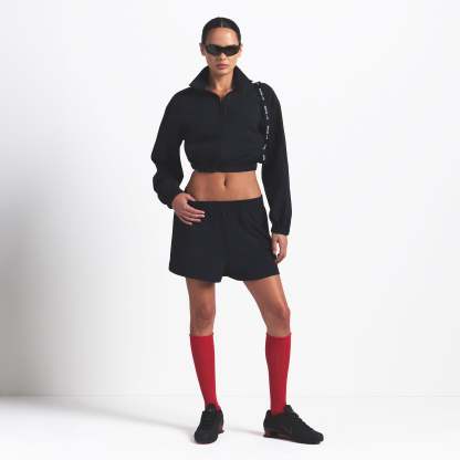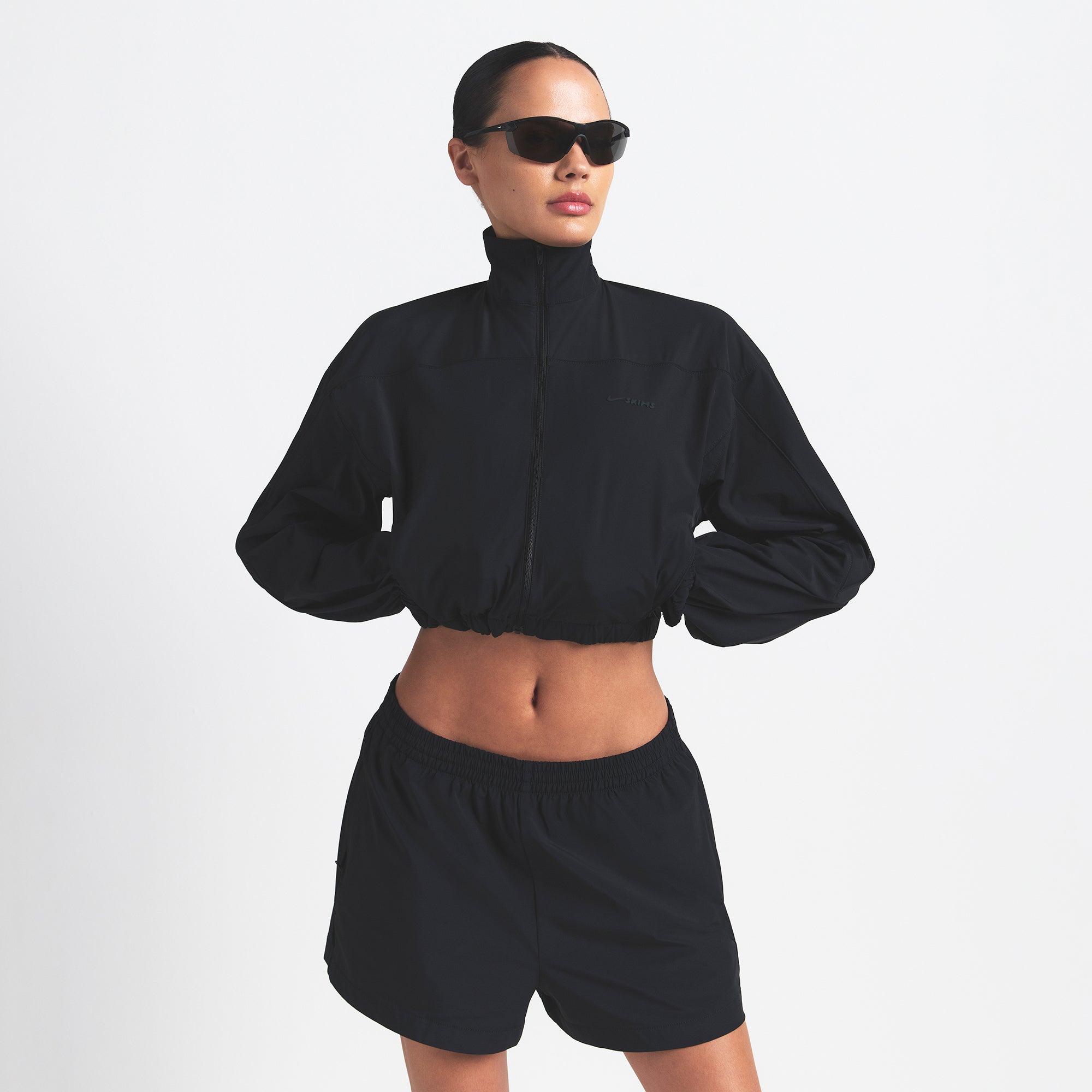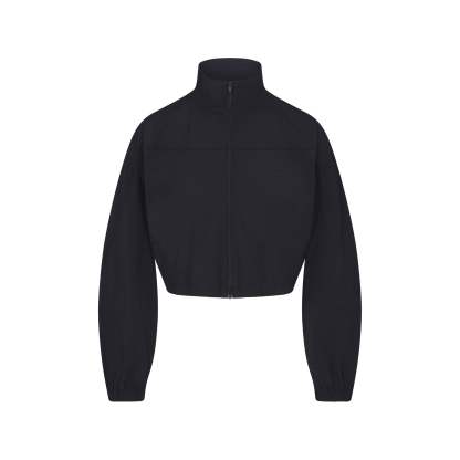 Cropped to perfection and street-ready. Designed in our breathable Woven Nylon fabric, this relaxed zip-up jacket features a flattering mock neck and adjustable bungee. Complete with welt zipper pockets, and piping details.