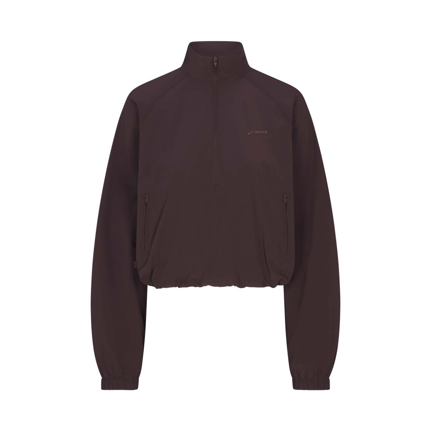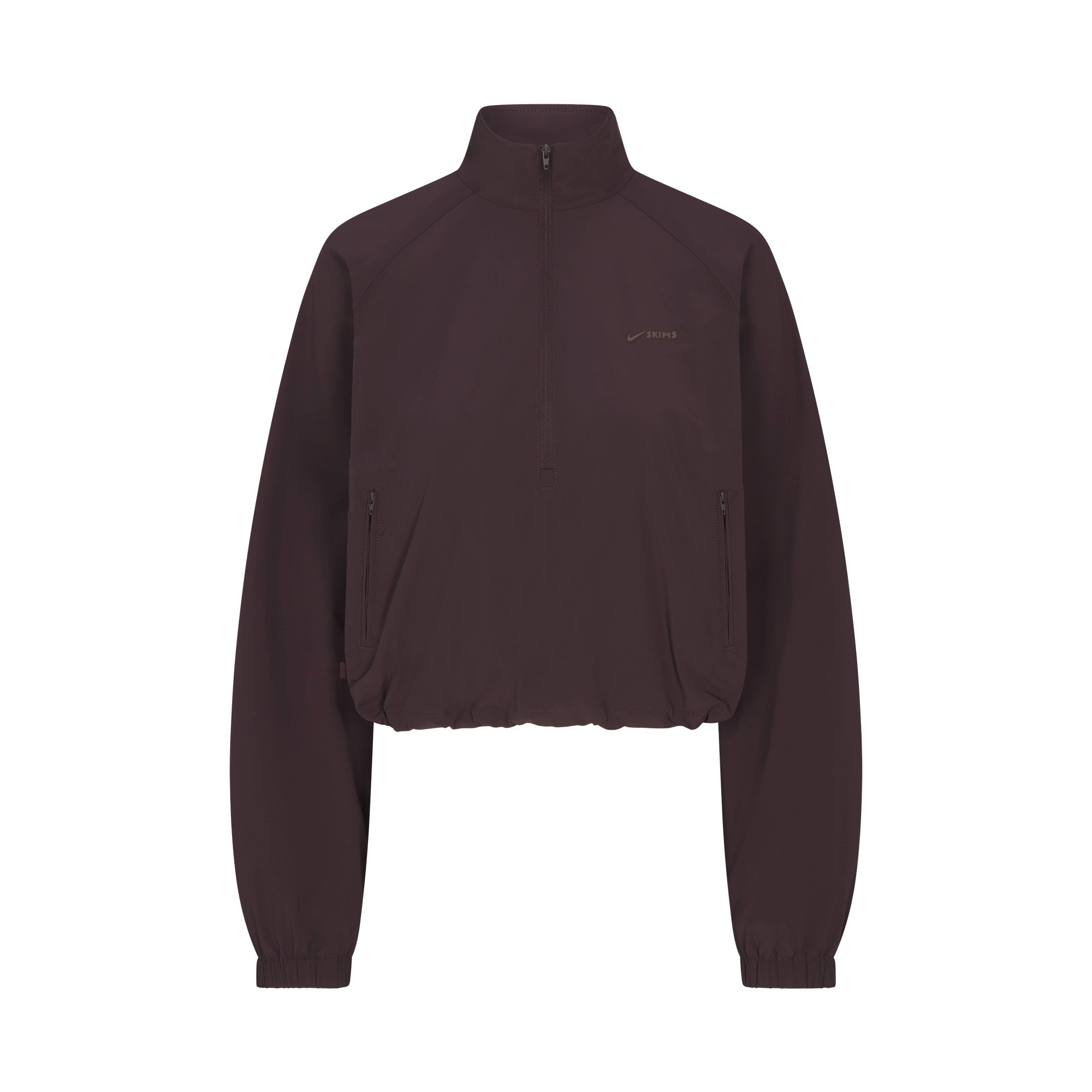 Mock neck, Raglan long sleeves, Half zip closure, Back storm flap, Welt pockets with zipper closure, Bunjee with branded toggle at hem for adjustability, Front side and back seam details, Silicone matte logo at wearers left chest, Lined in a soft sports mesh, Relaxed fit