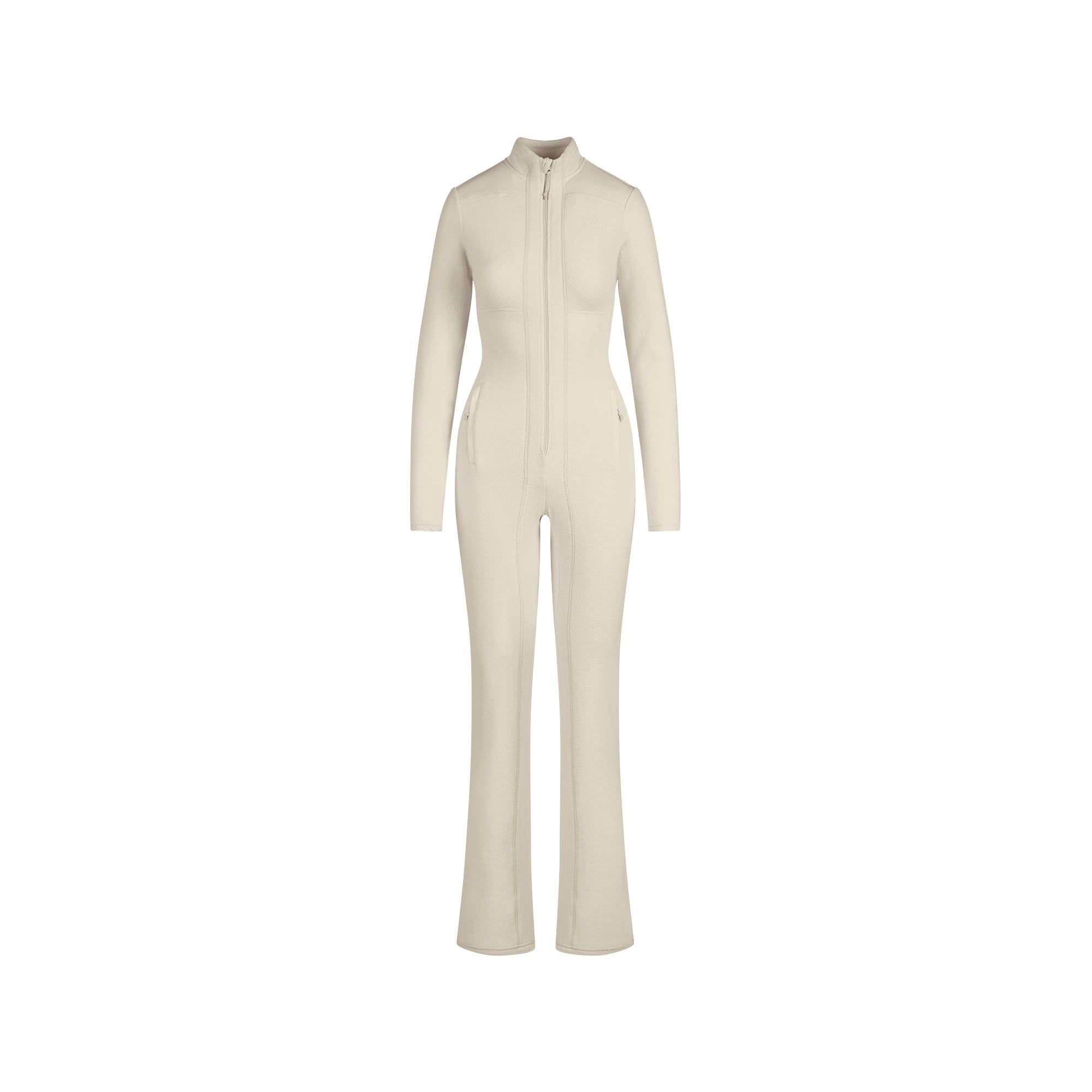 - Mock neck, Zipper at center front, Silicone logo patch at wearers left side chest, Welt pockets, Contrast woven panels, Fits tight to body, Long length, Straight leg, Inseam: 34"