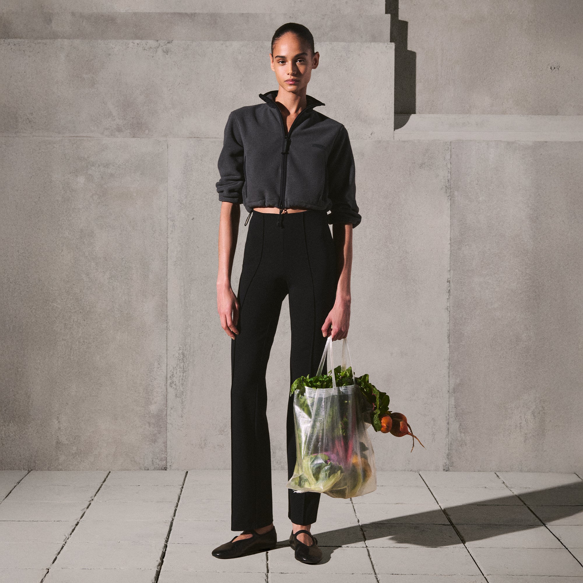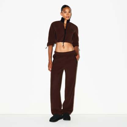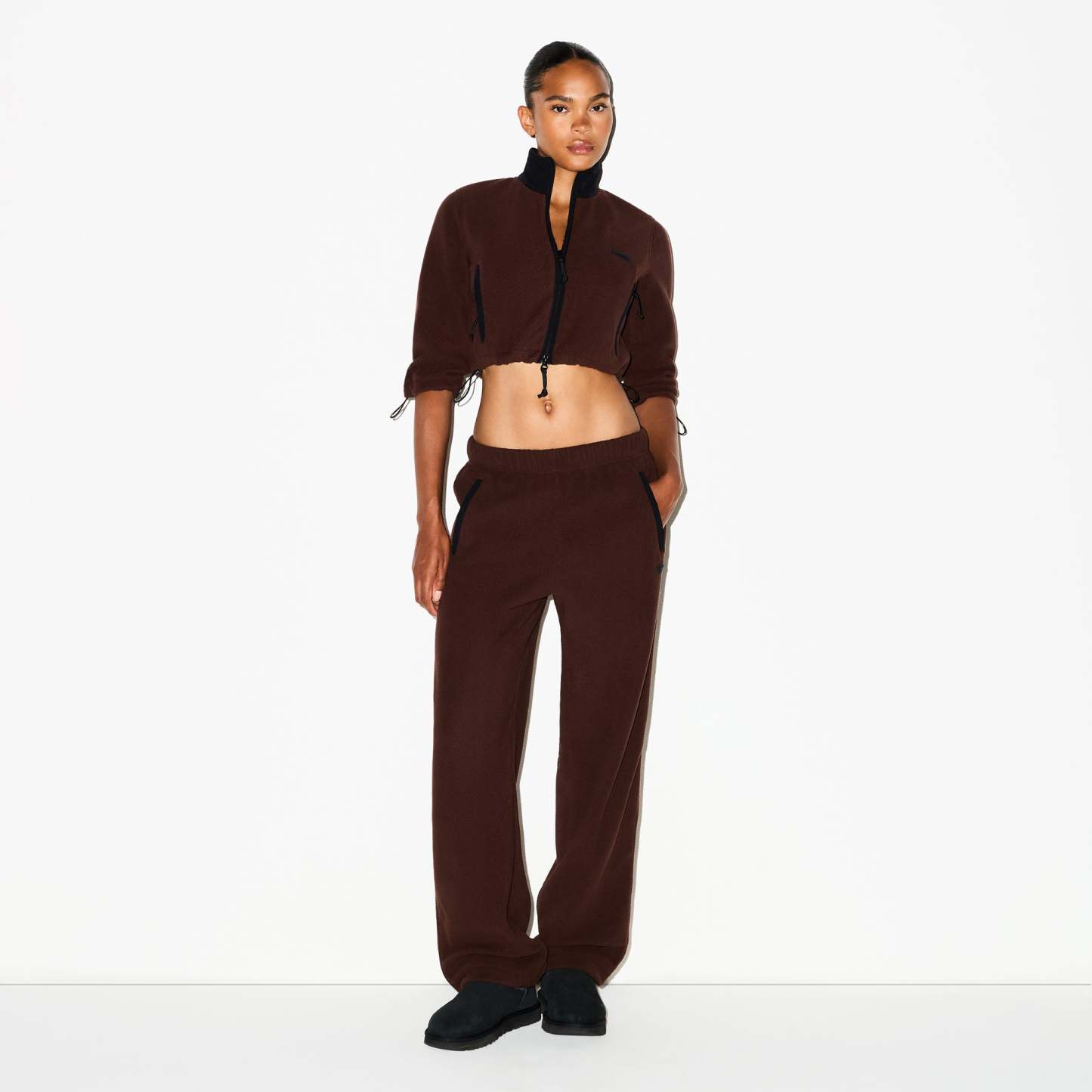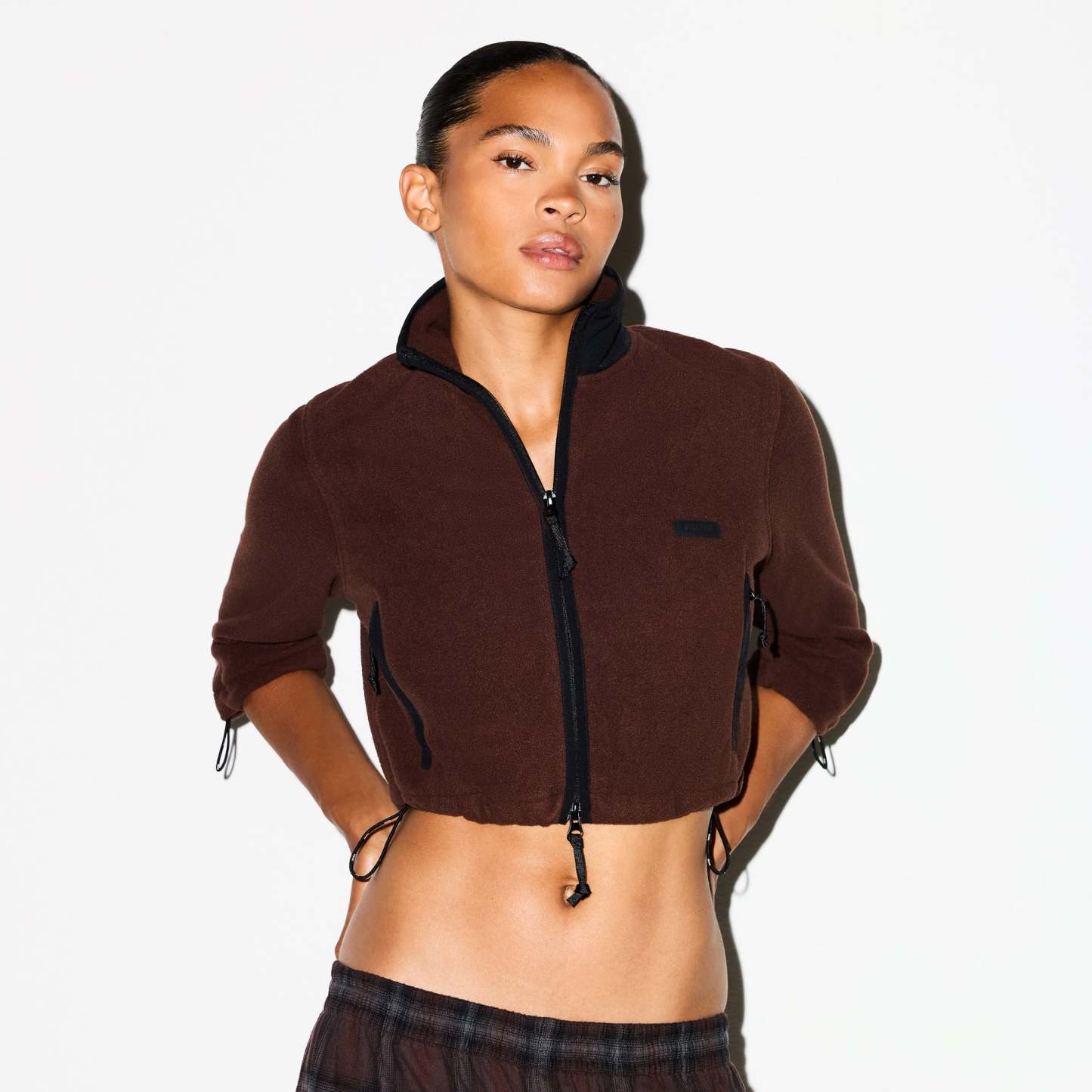 Cropped, cozy, and plush. Featuring our mid-weight polar fleece and contrast detailing, this shrunken zip-up brings softness and sporty edge to your cold-weather uniform. Complete with a sleek mock neck, side zipper pockets, and adjustable bungee cord at the sleeve and hem. Finished with a skithtms logo on the chest and fits true to size.