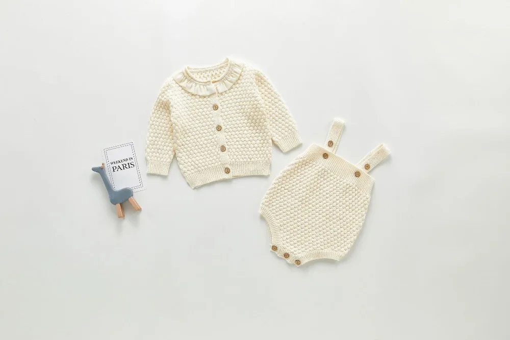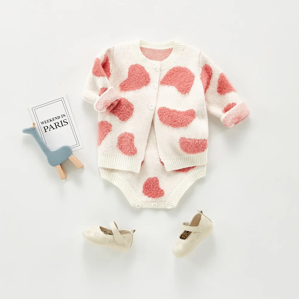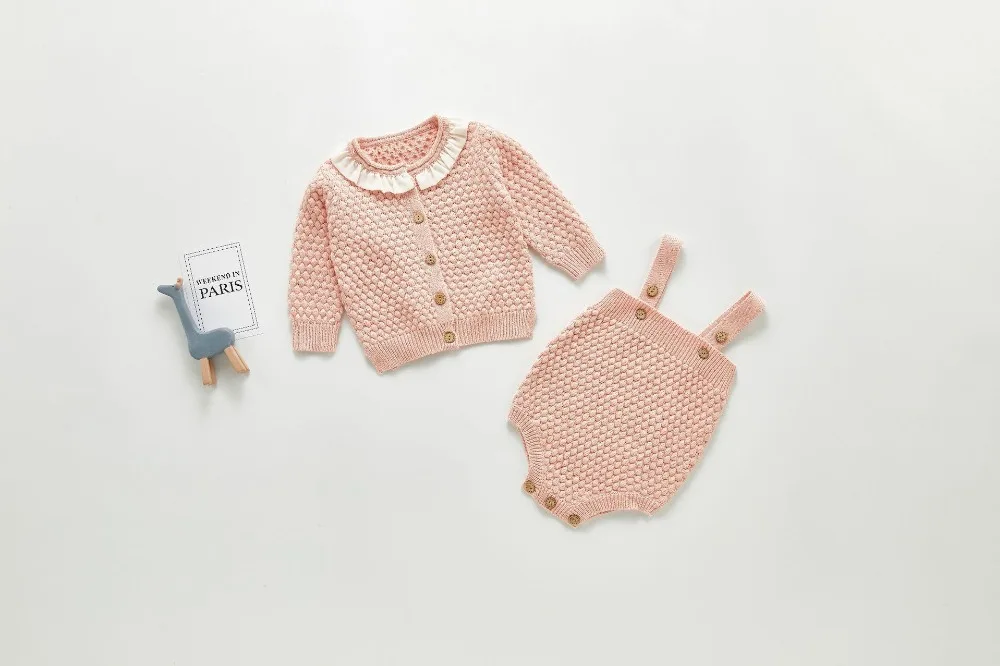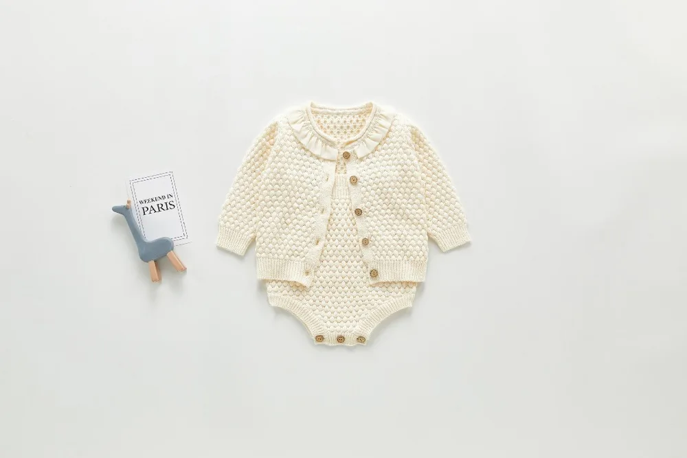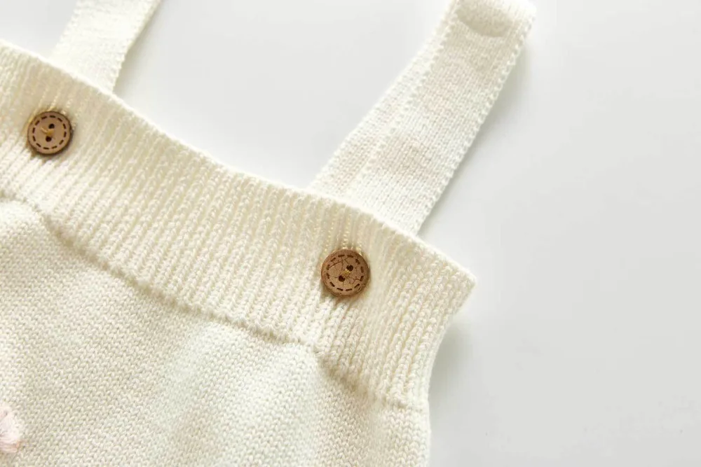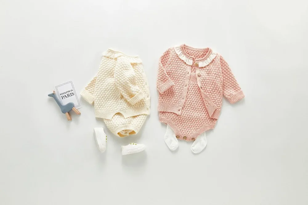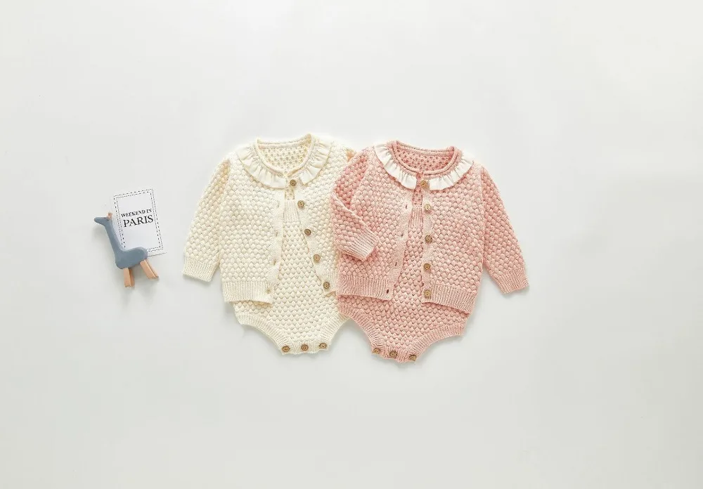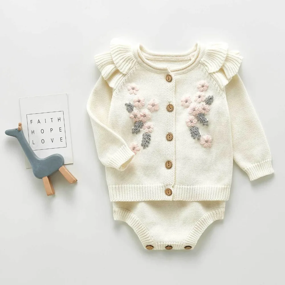 A beautiful baby knitted sweater romper is a must-have for your baby's wardrobe. Featuring a round neck, with ruffle shoulder, embroidered pretty floral, and press studs in the crotch. A classic style in a soft and comfortable texture. It comes with a cardigan sweater that has a front closure button. This baby girl knitted sweater romper set makes a perfect outfit for photoshoots too!
