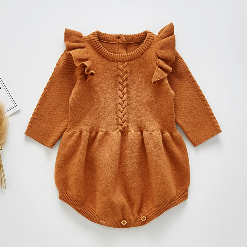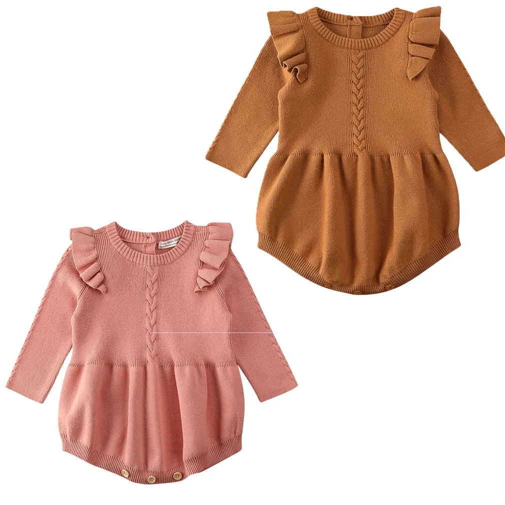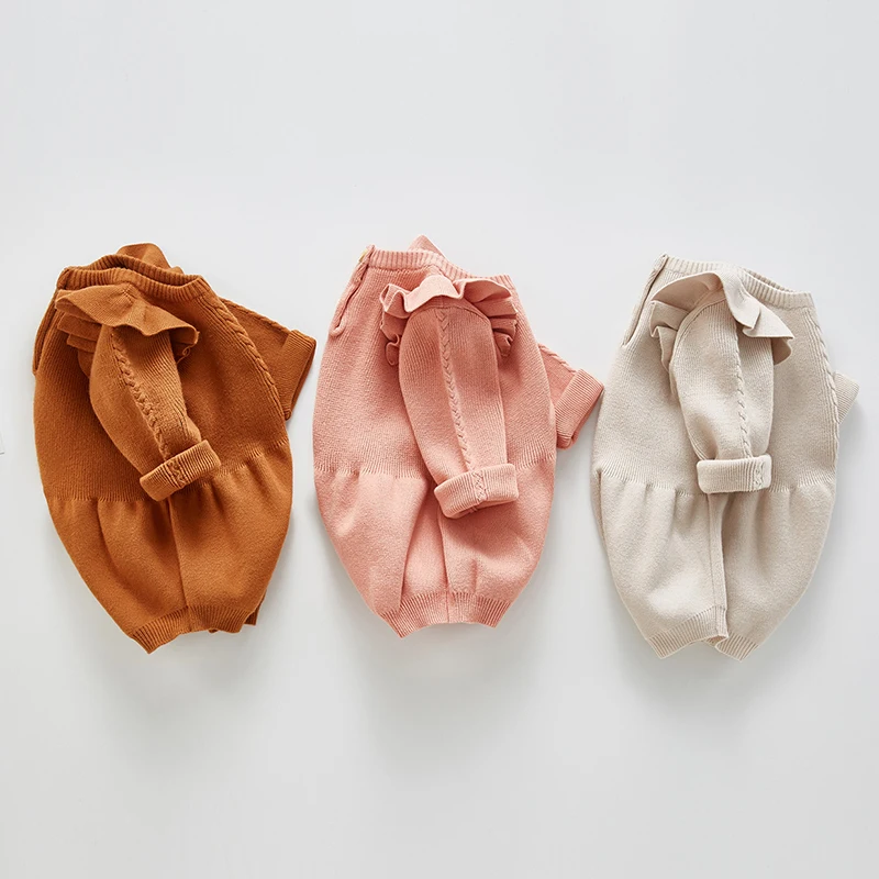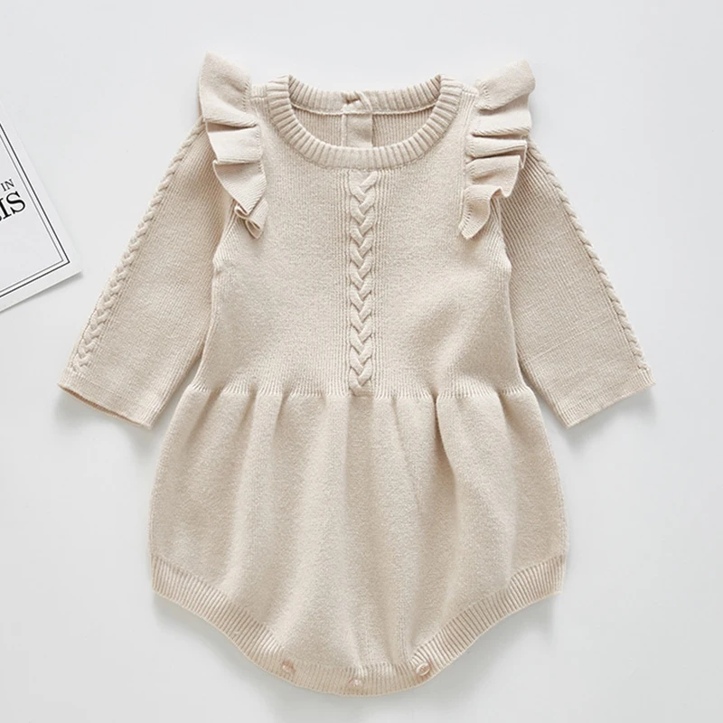 A simple crewneck casual romper. There are 3 colors to choose from. It has snuggly long sleeves, ruffles on the shoulders and is crafted by a hundred percent cotton material. The material is soft and gentle to the baby's skin. It is perfect for everyday wear for your little one.