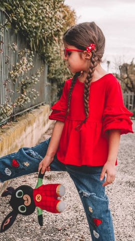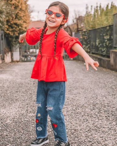 It features a super cute set of pleats on its 3/4 flare sleeves that is super easy to pair with absolutely anything! It is made especially loose so your little fashion girl would be comfortable rocking this super cute top!