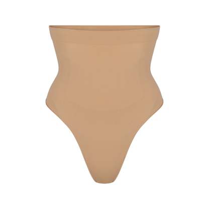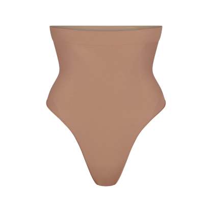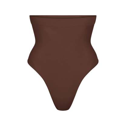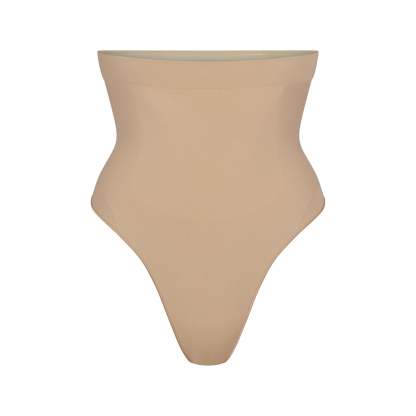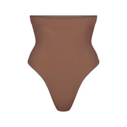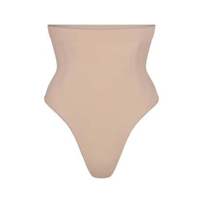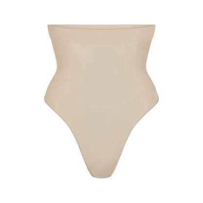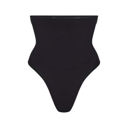 Underband with interior silicone to prevent rolling, Strong compression along tummy and waist, Wide gusset for added coverage, Thong back, 100% Cotton gusset