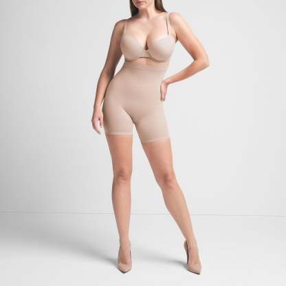 Interior silicone band to prevent rolling, Strong compression along tummy, waist and thighs, Pockets at butt to lift and add definition, Strong compression along back thigh to provide lift, Hits at mid thigh, Open gusset