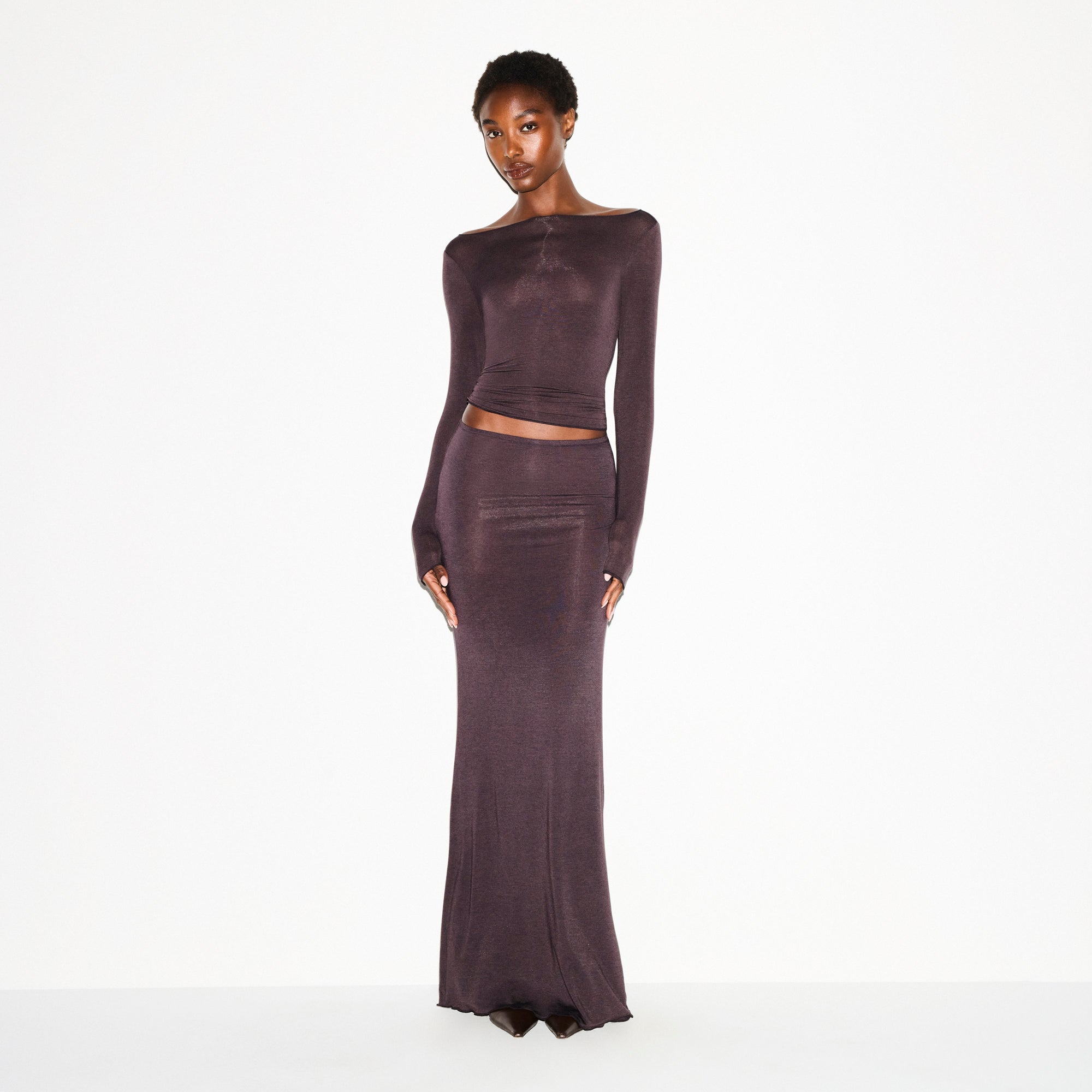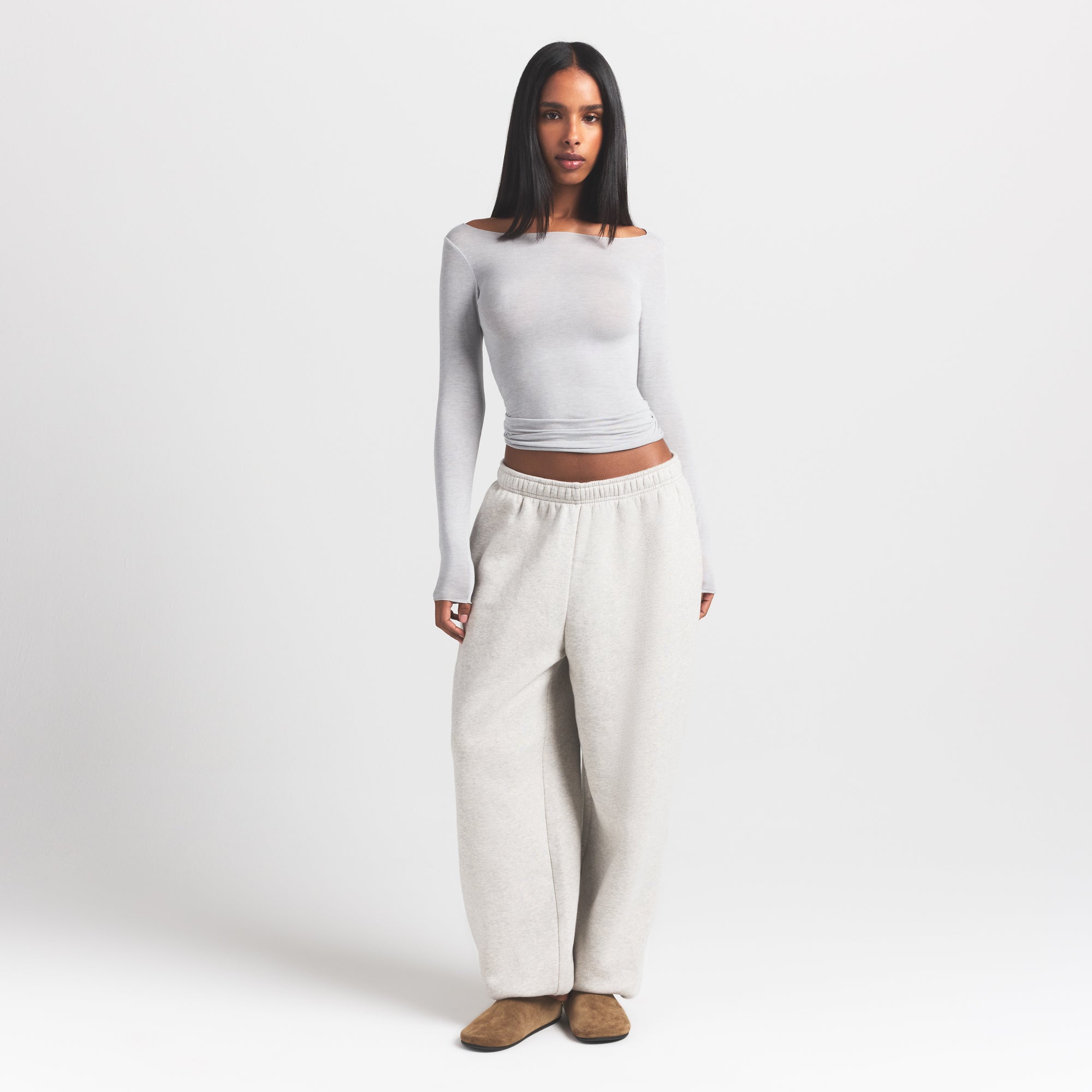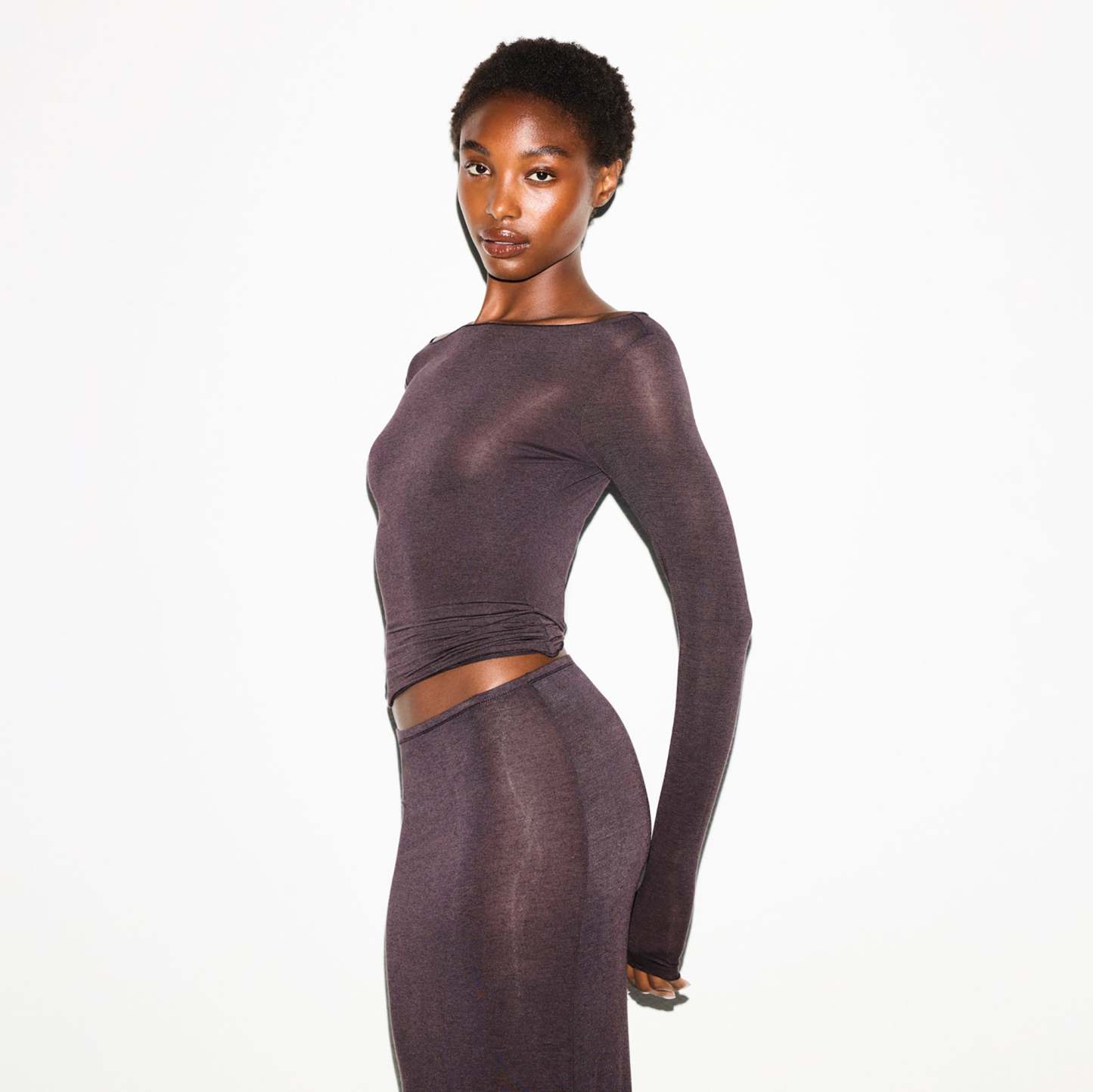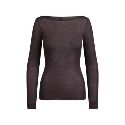 Your most elevated lounge top. Sheer with a fitted silhouette, this chic style keeps you comfortable with its incredibly soft and stretchy modal-cashmere fabric. Elevated with a wide boat neck and extra long sleeves. Wear with the Sheer Modal Straight Leg Pant to complete the set. Hits below the natural waist and fits true to size.