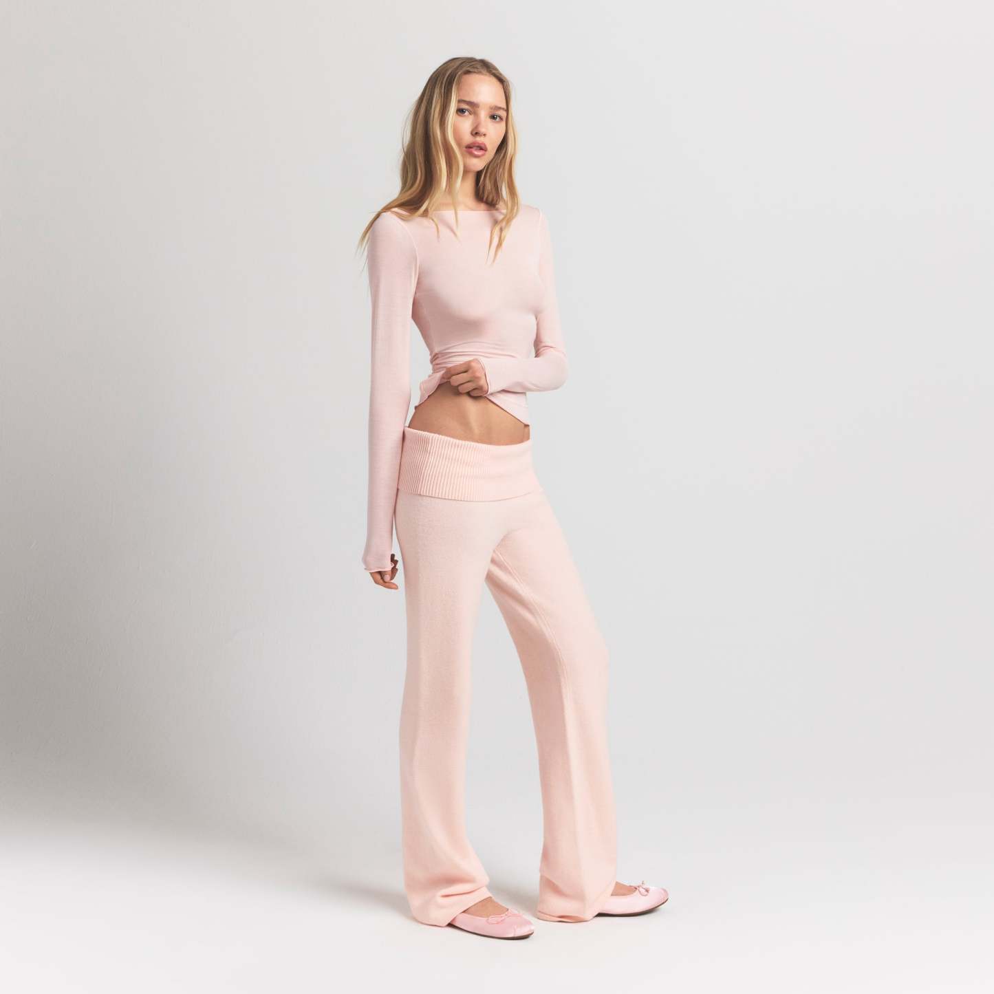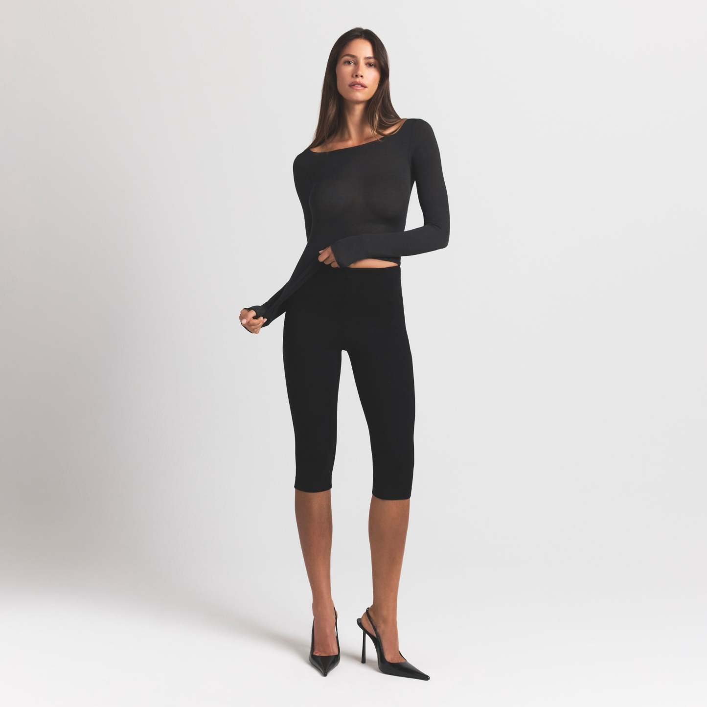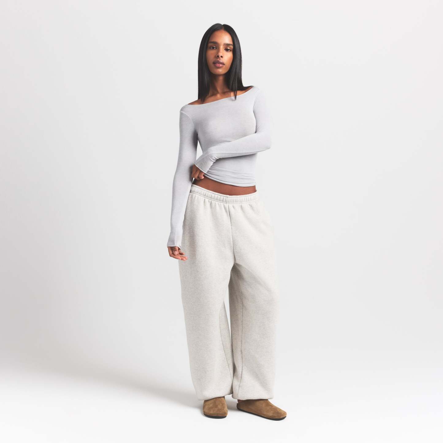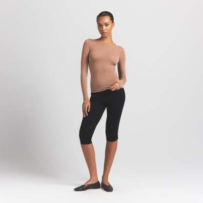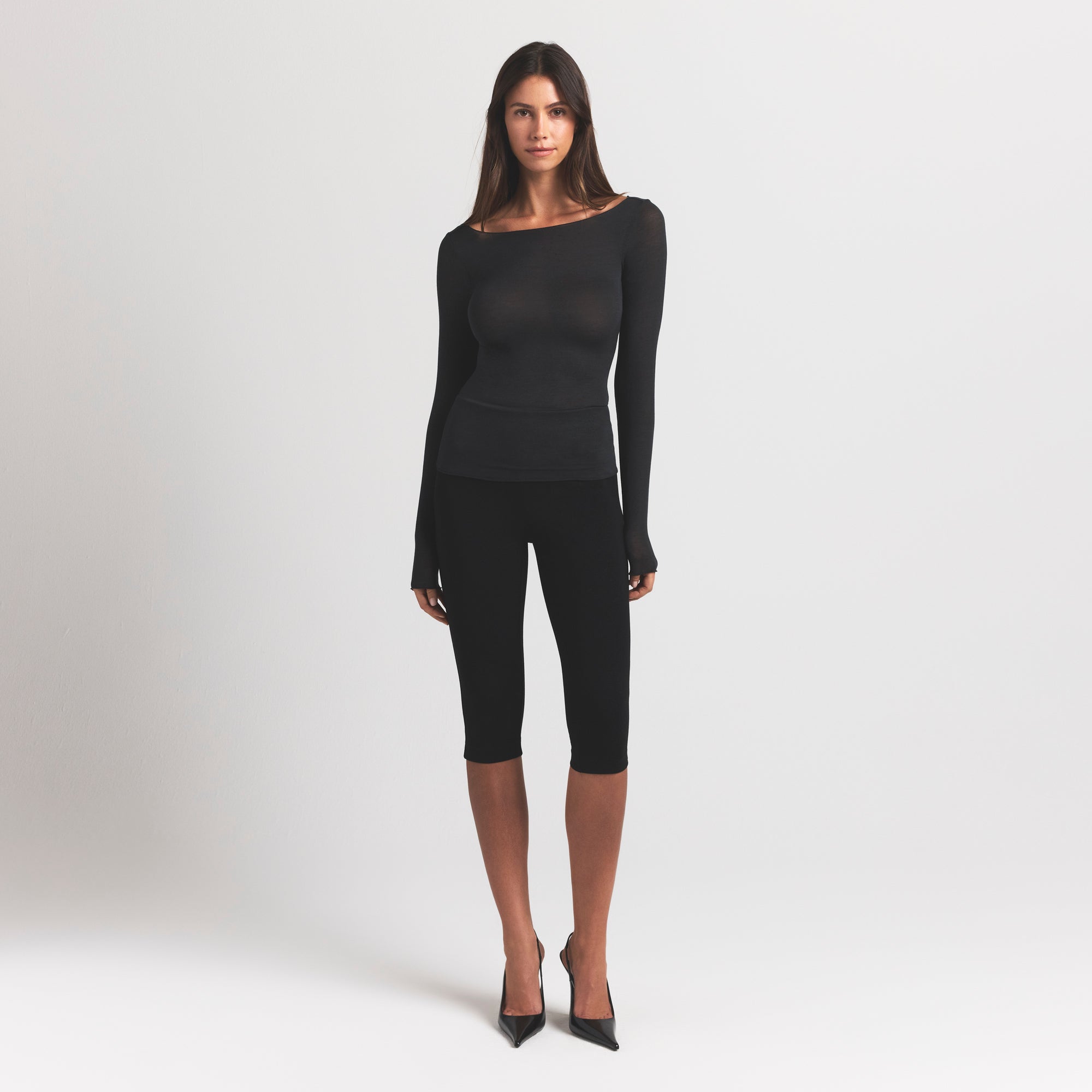 Your most elevated lounge top. Sheer with a fitted silhouette, this chic style keeps you comfortable with its incredibly soft and stretchy modal-cashmere fabric. Elevated with a wide boat neck and extra long sleeves. Wear with the Sheer Modal Straight Leg Pant to complete the set. Hits below the natural waist and fits true to size.