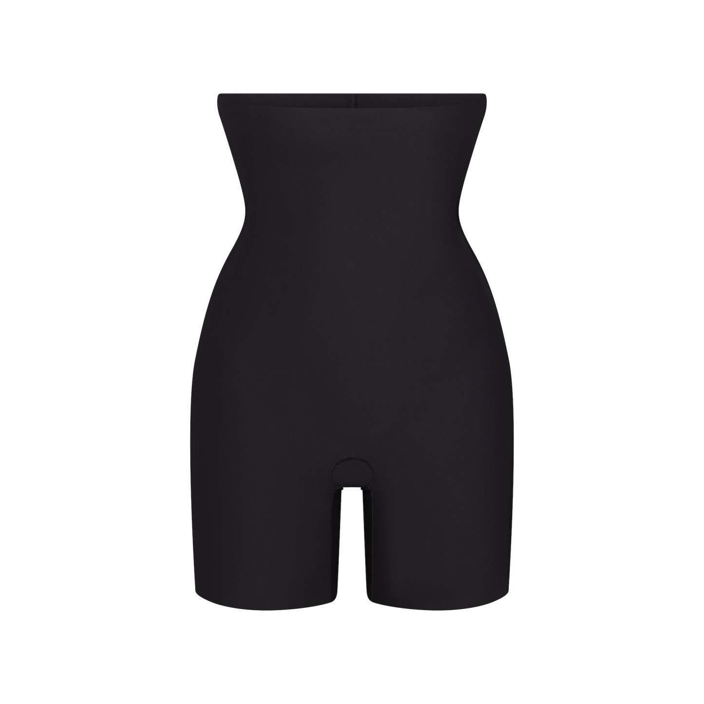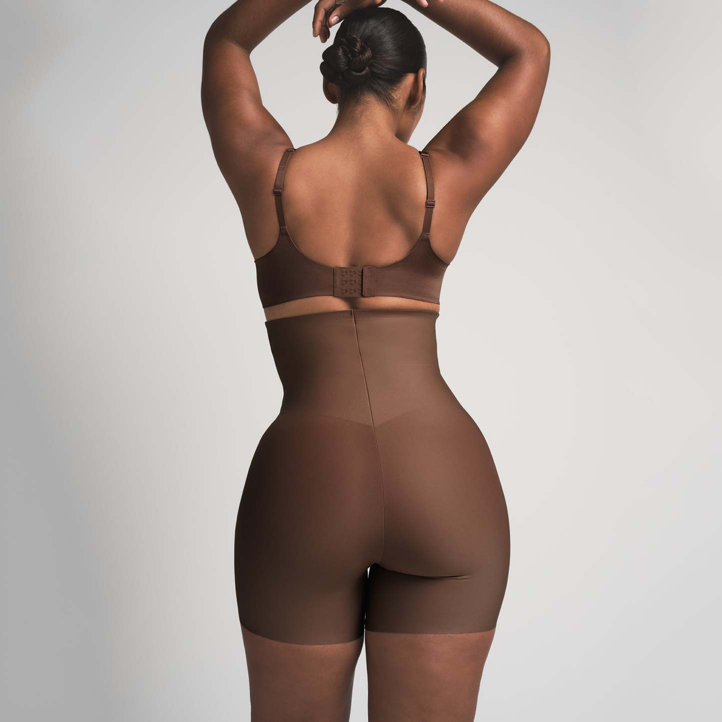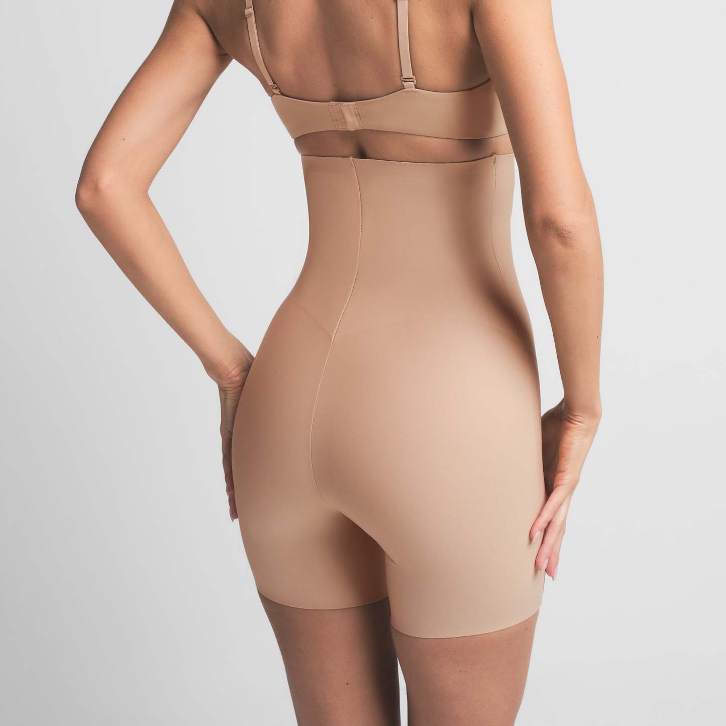 High waisted, Interior bonded elastic along waist, Targeted core compression, Hits at mid thigh, Open gusset, Raw cut leg opening