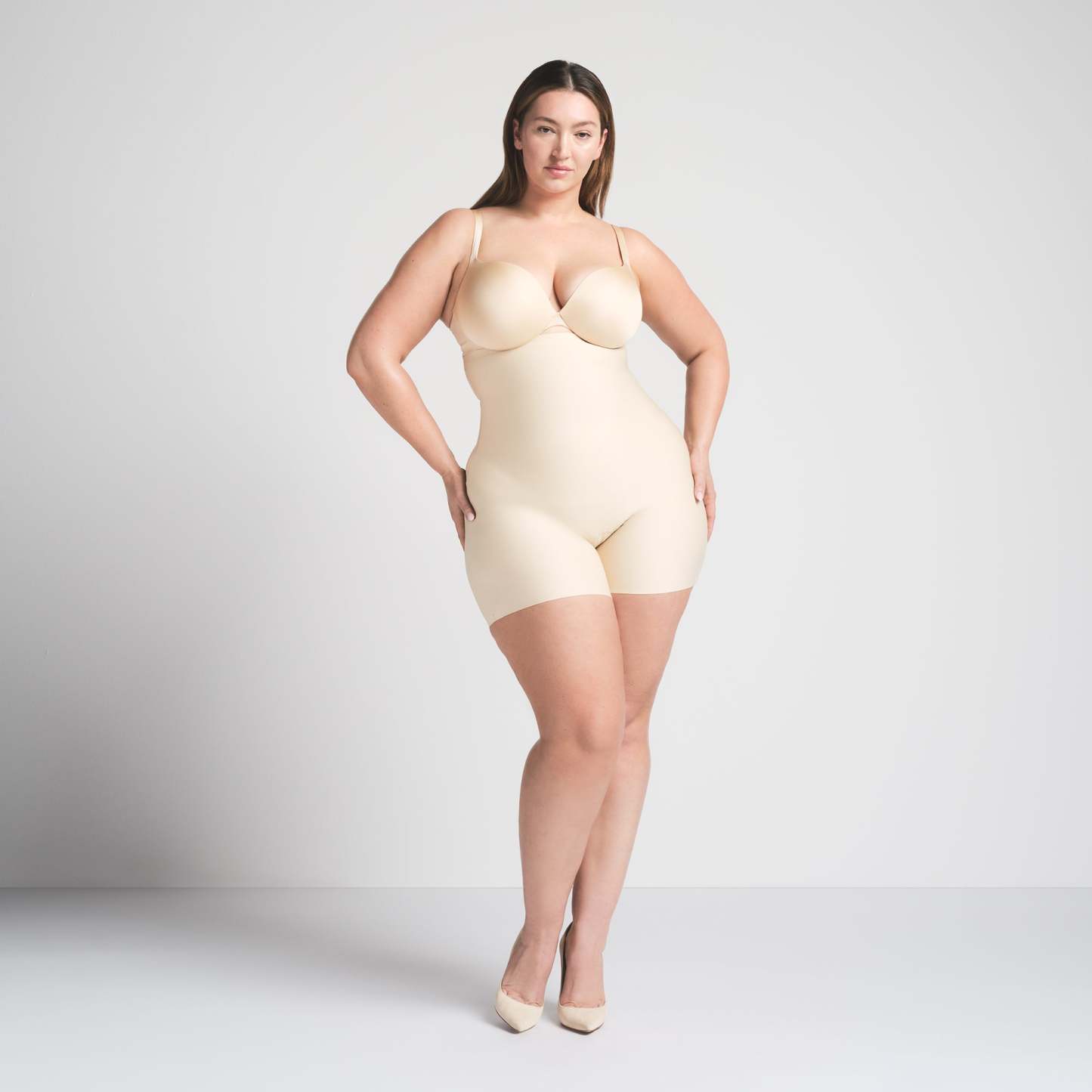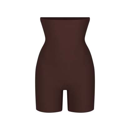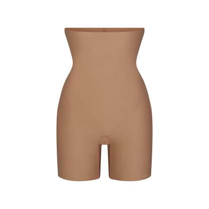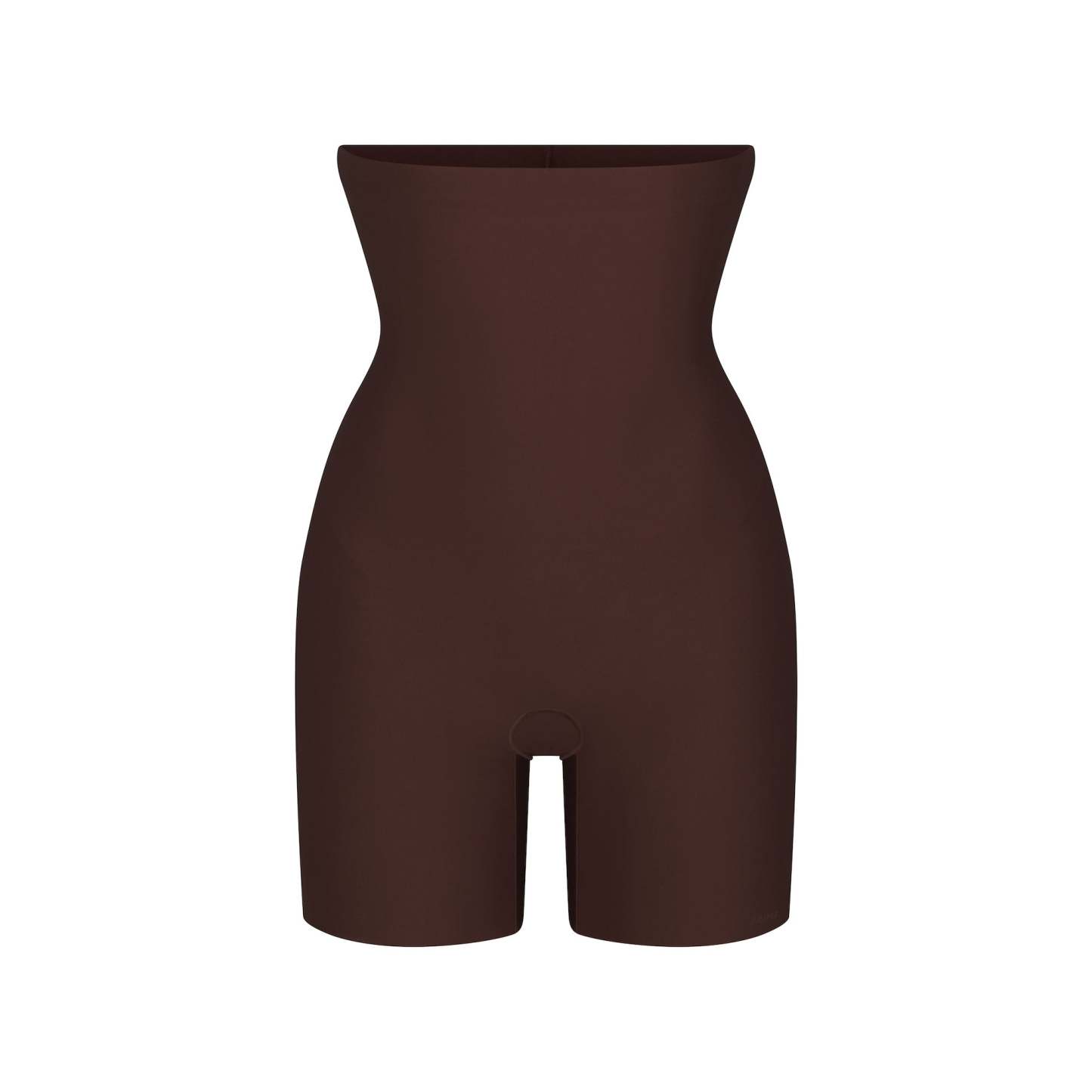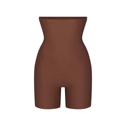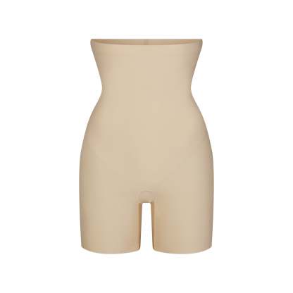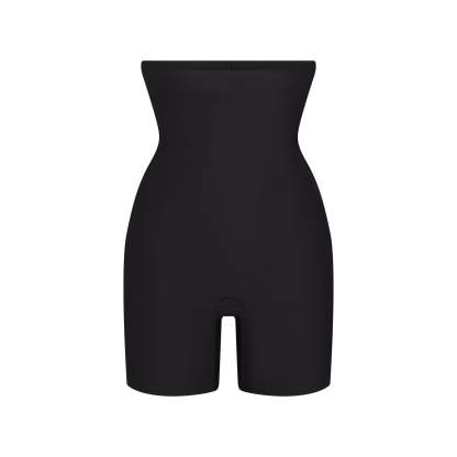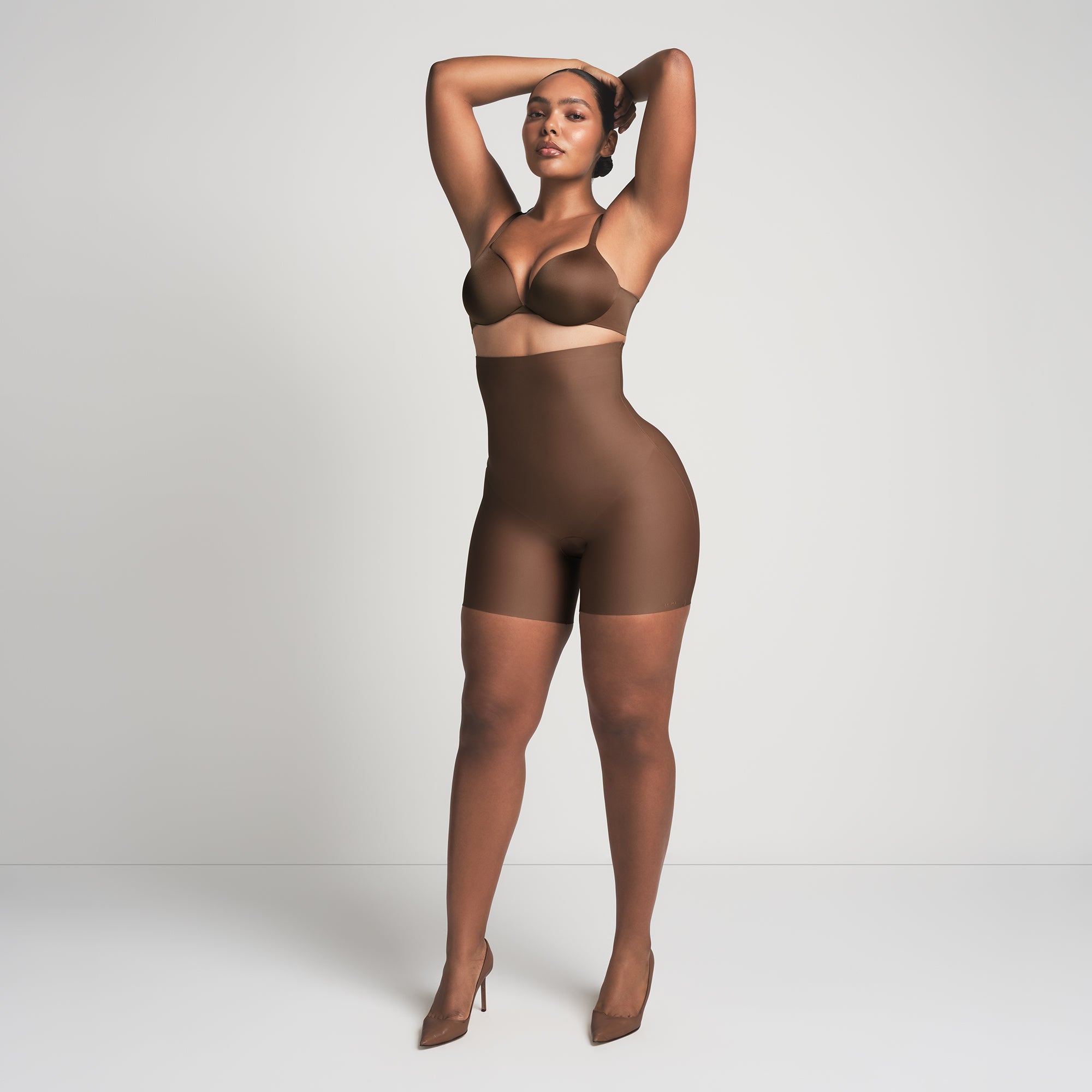 High waisted, Interior bonded elastic along waist, Targeted core compression, Hits at mid thigh, Open gusset, Raw cut leg opening
