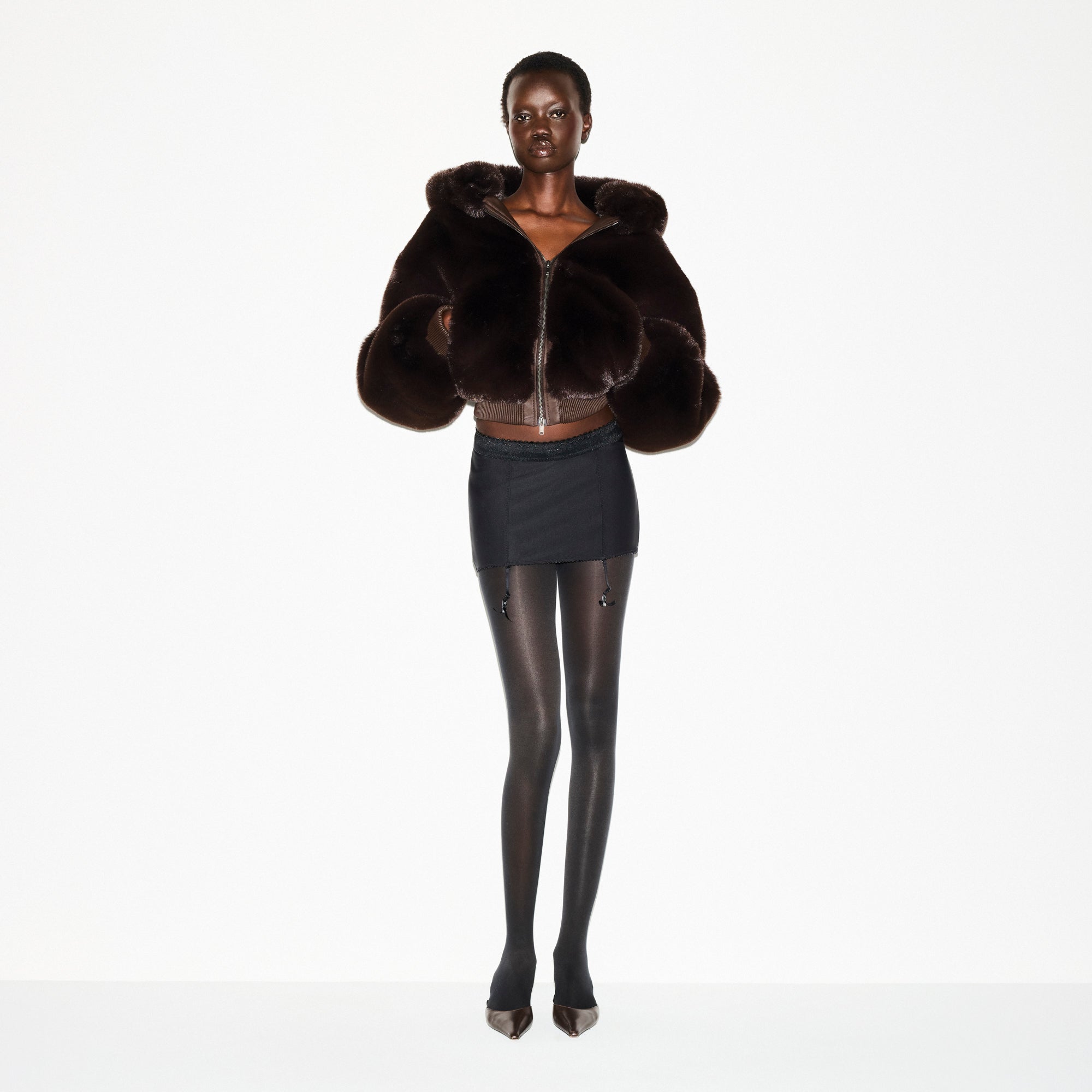 - Picot elastic waistband, Logo label at center front, Front and back seam details, Removable garter straps, Mini length