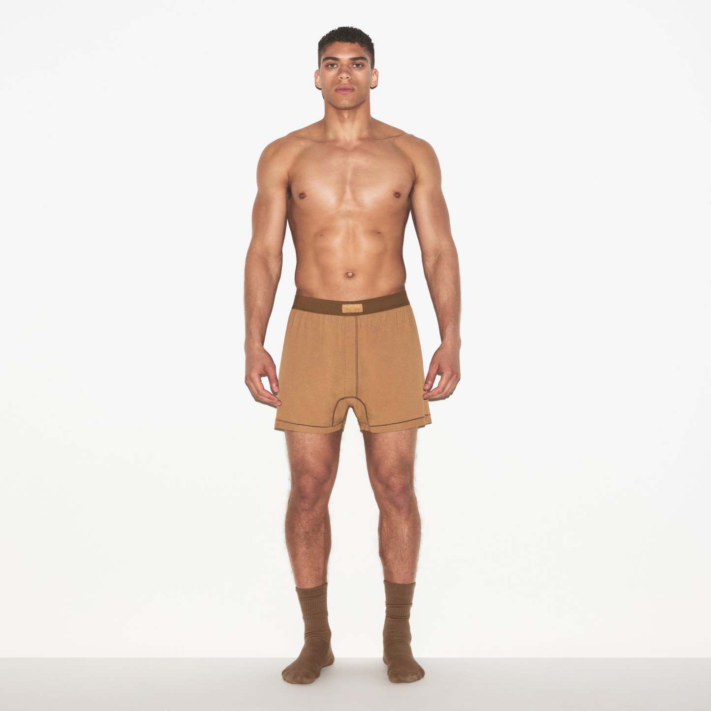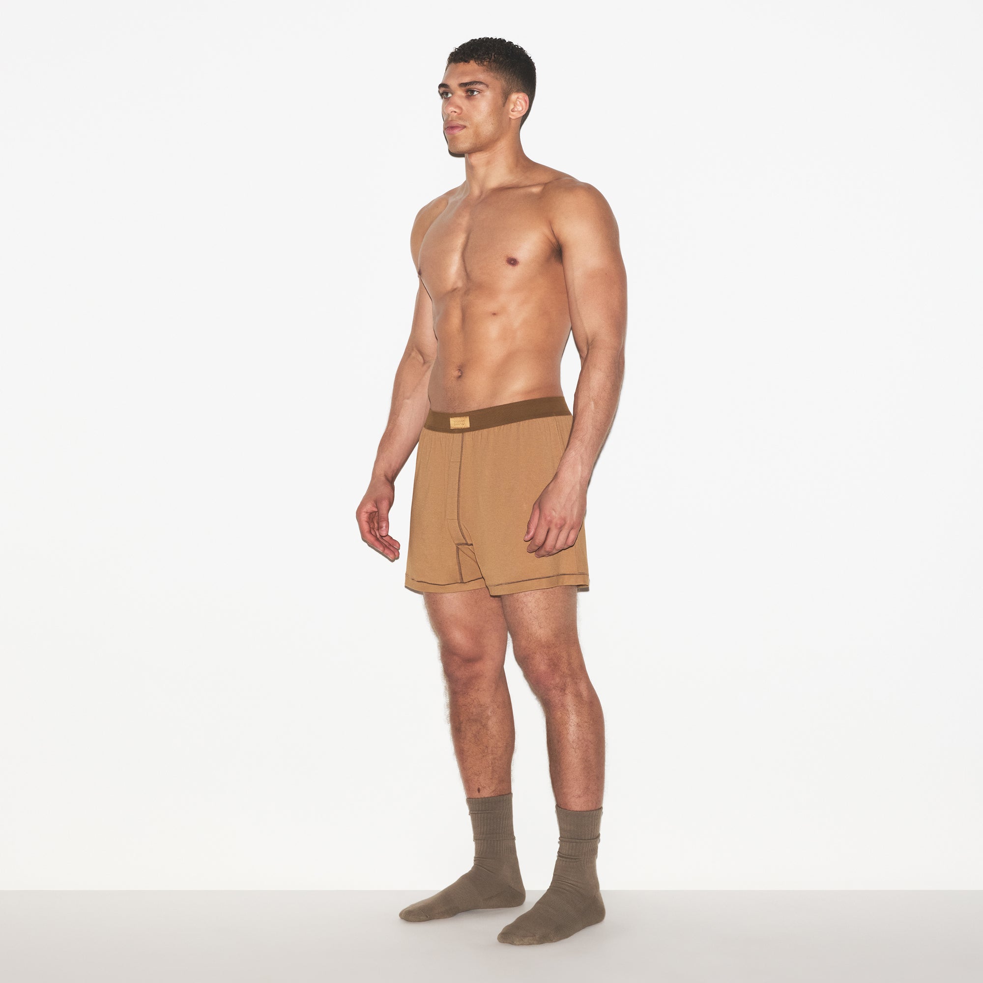 - Knit boxer silhouette, Elastic waistband with logo label at center front, Functional fly opening, Slim boxer fit
