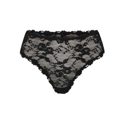 - Lace trim topped on at waist and leg opening, Contrast rosette at center front, Gusset lining, Medium back coverage, Designed in a sheer stretch lace