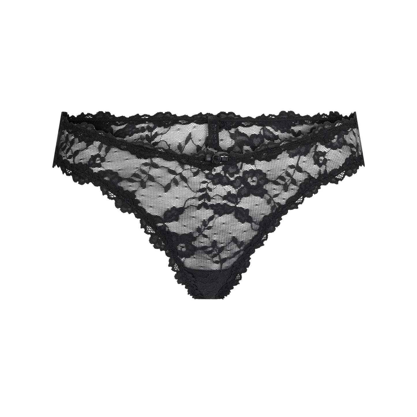This sexy and feminine sheer lace-adorned dipped front thong is the next addition to your top drawer. Features a rosette detail at the center front, a thong back with minimum coverage, and a cotton gusset. Fits true to size.
