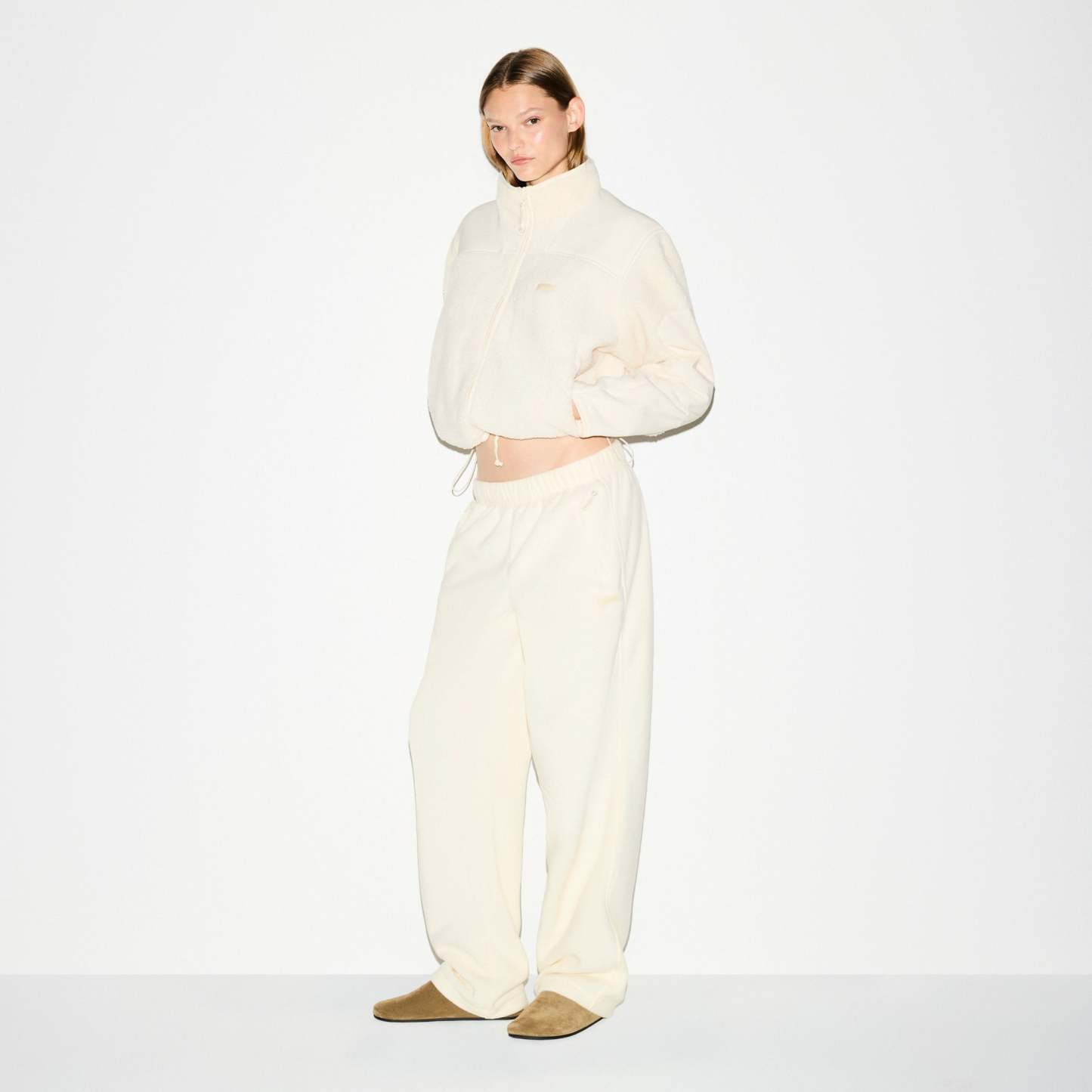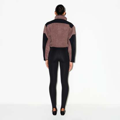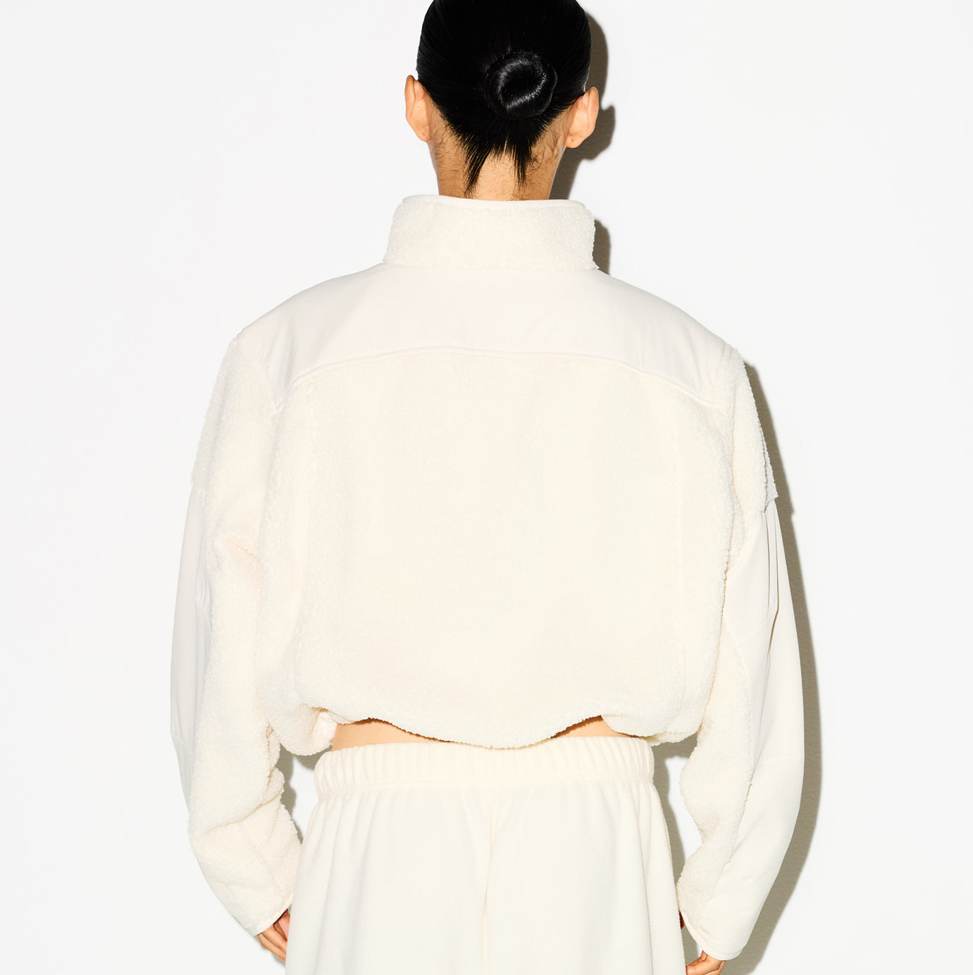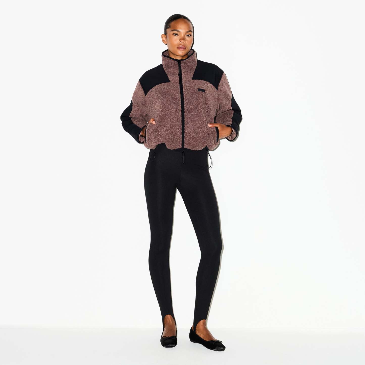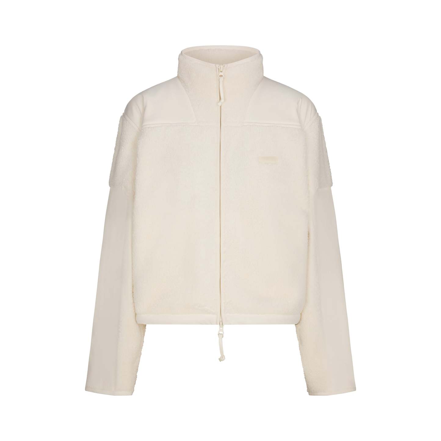 Soft, sporty, and versatile. Designed with a loose mock neck and woven panel details, this relaxed faux shearling zip-up fits every chic look all season long. Features side zipper pockets and an adjustable cord at the hem. Complete with a skithtms logo on the chest. Fits true to size.