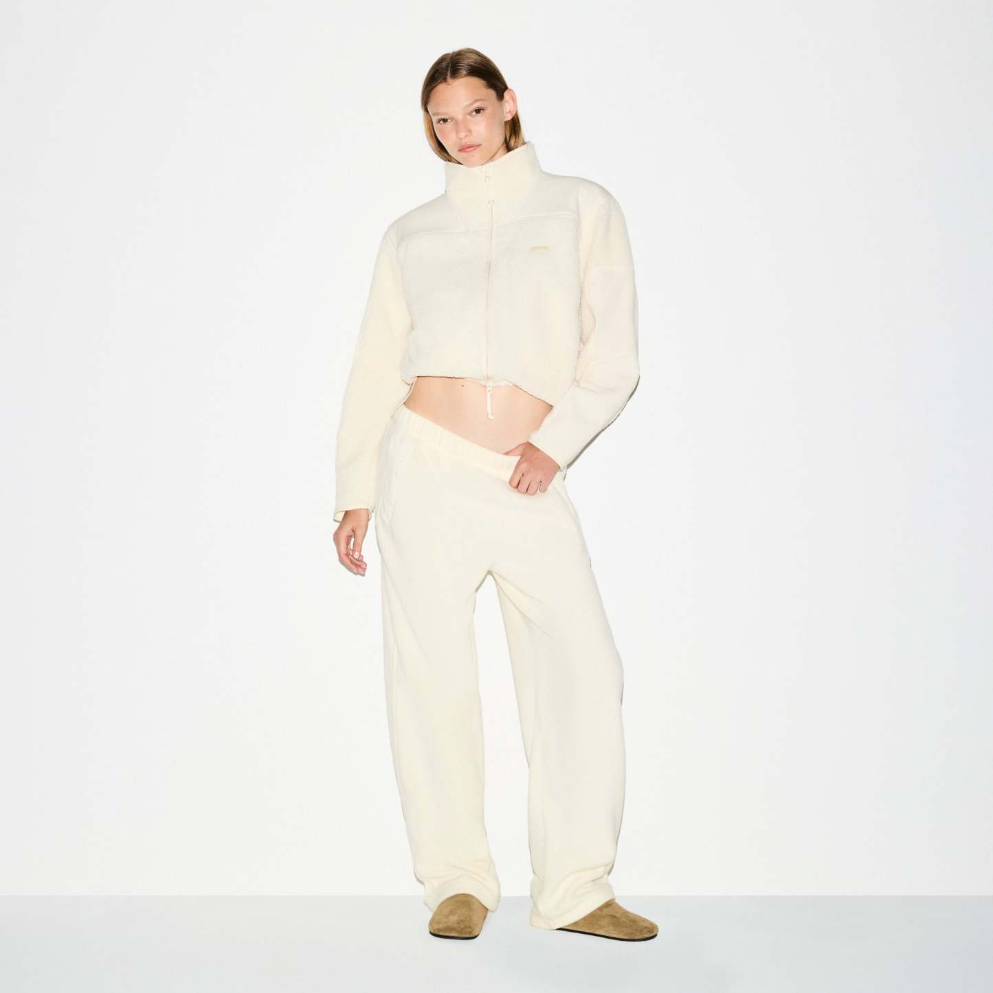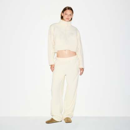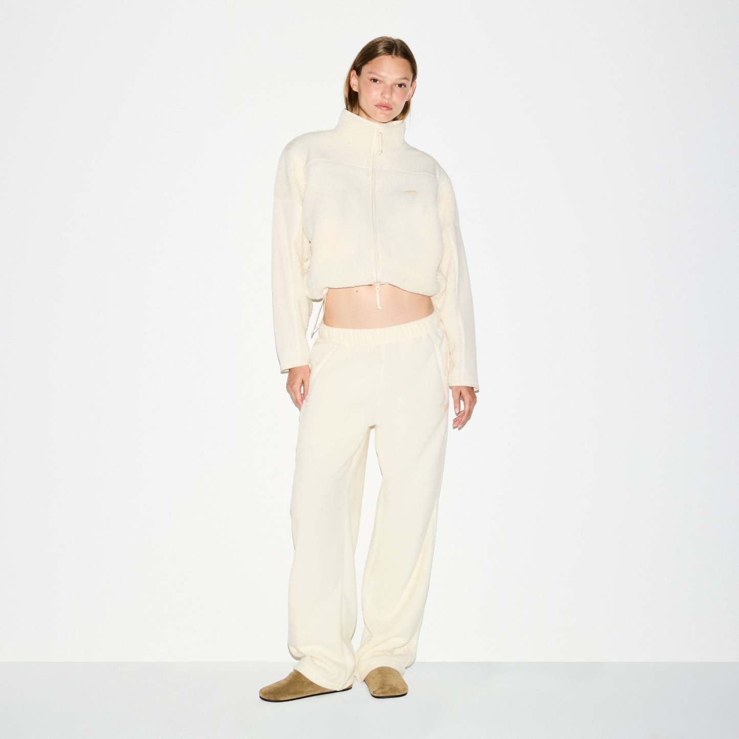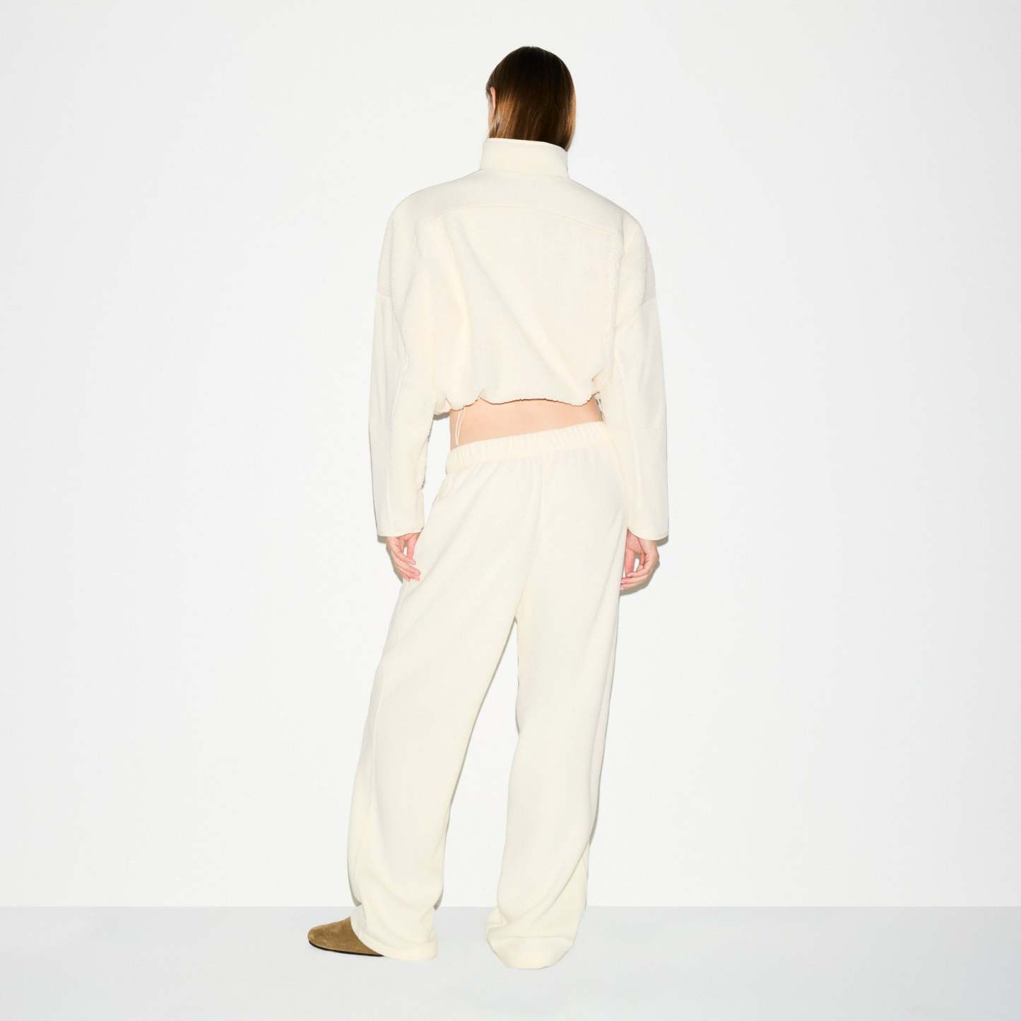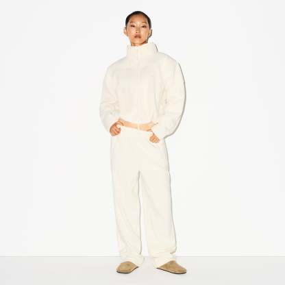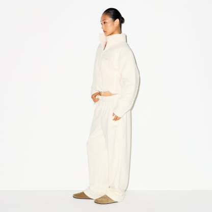 Soft, sporty, and versatile. Designed with a loose mock neck and woven panel details, this relaxed faux shearling zip-up fits every chic look all season long. Features side zipper pockets and an adjustable cord at the hem. Complete with a skithtms logo on the chest. Fits true to size.