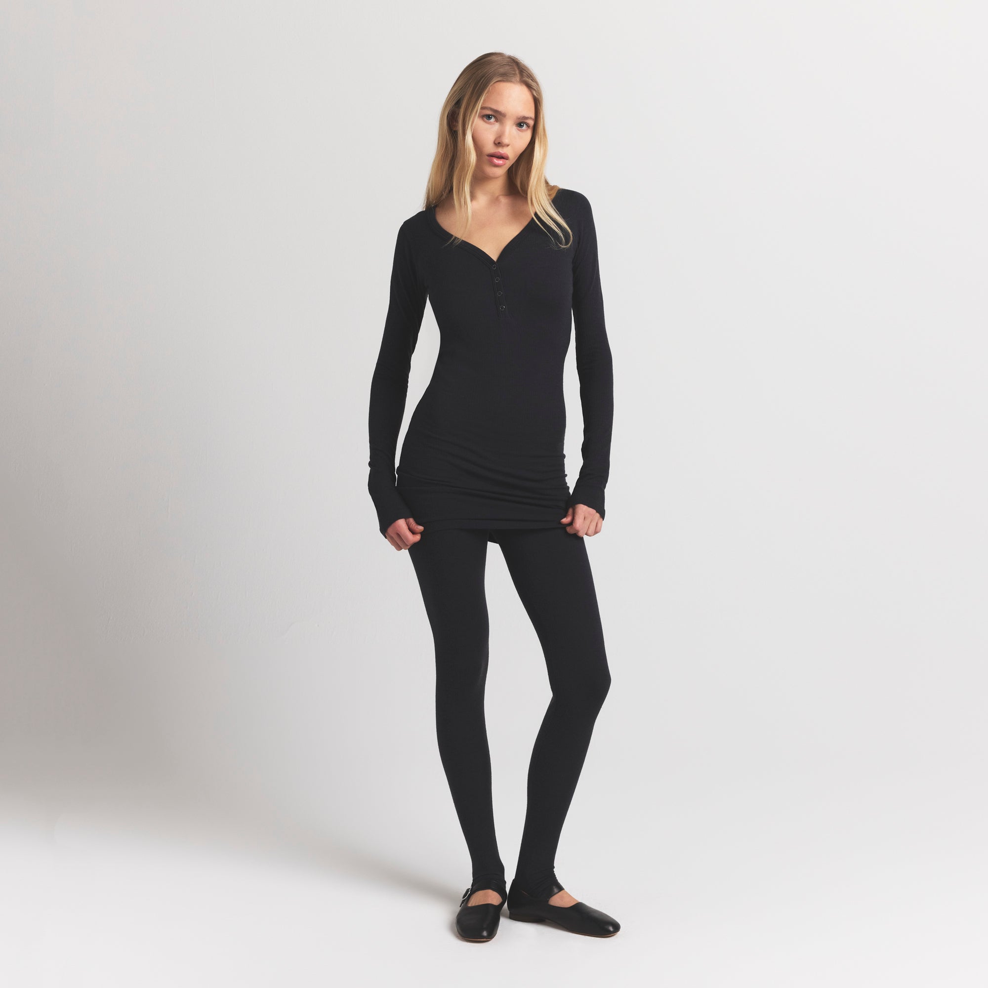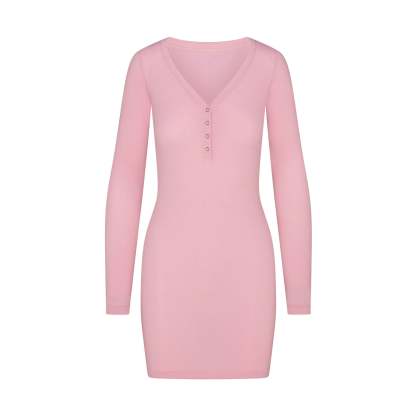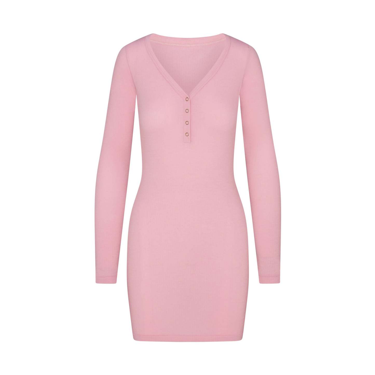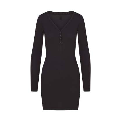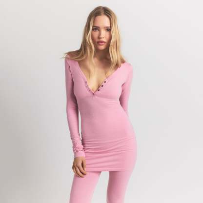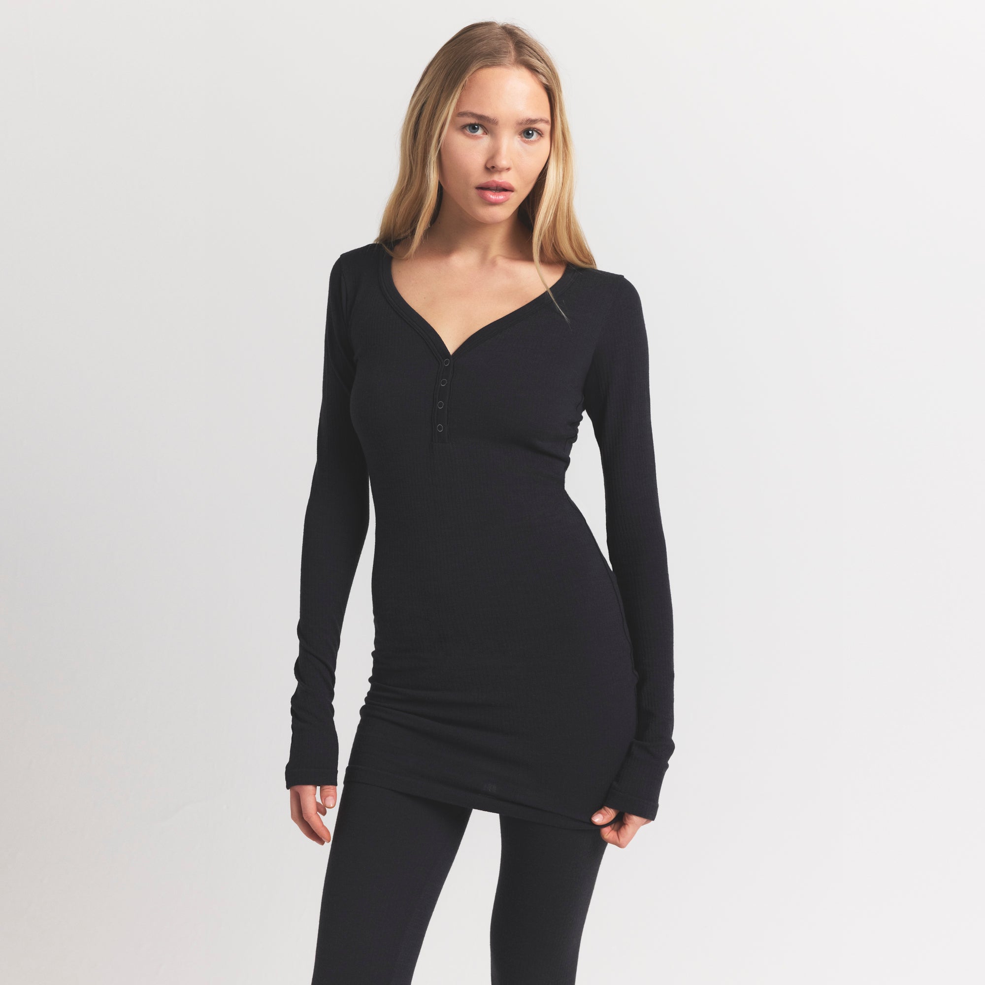 Scoop henley neckline, Snap closure, Long sleeves, Fits tight to body, Mini length