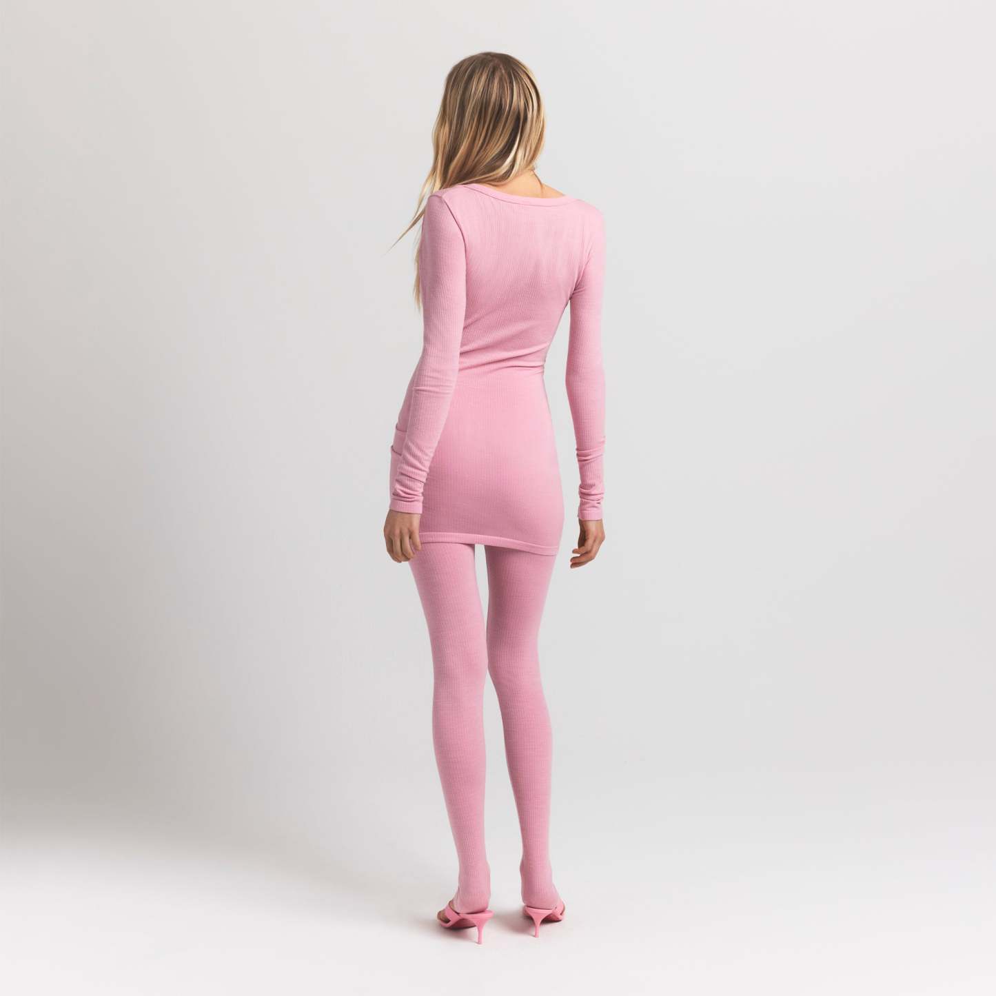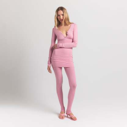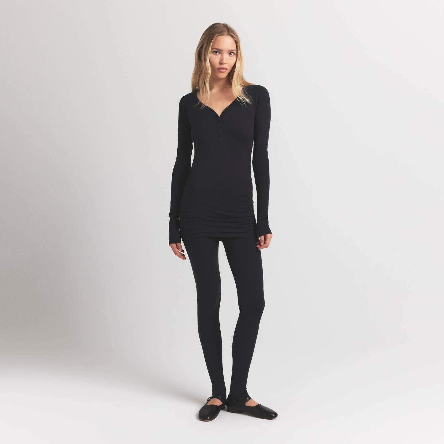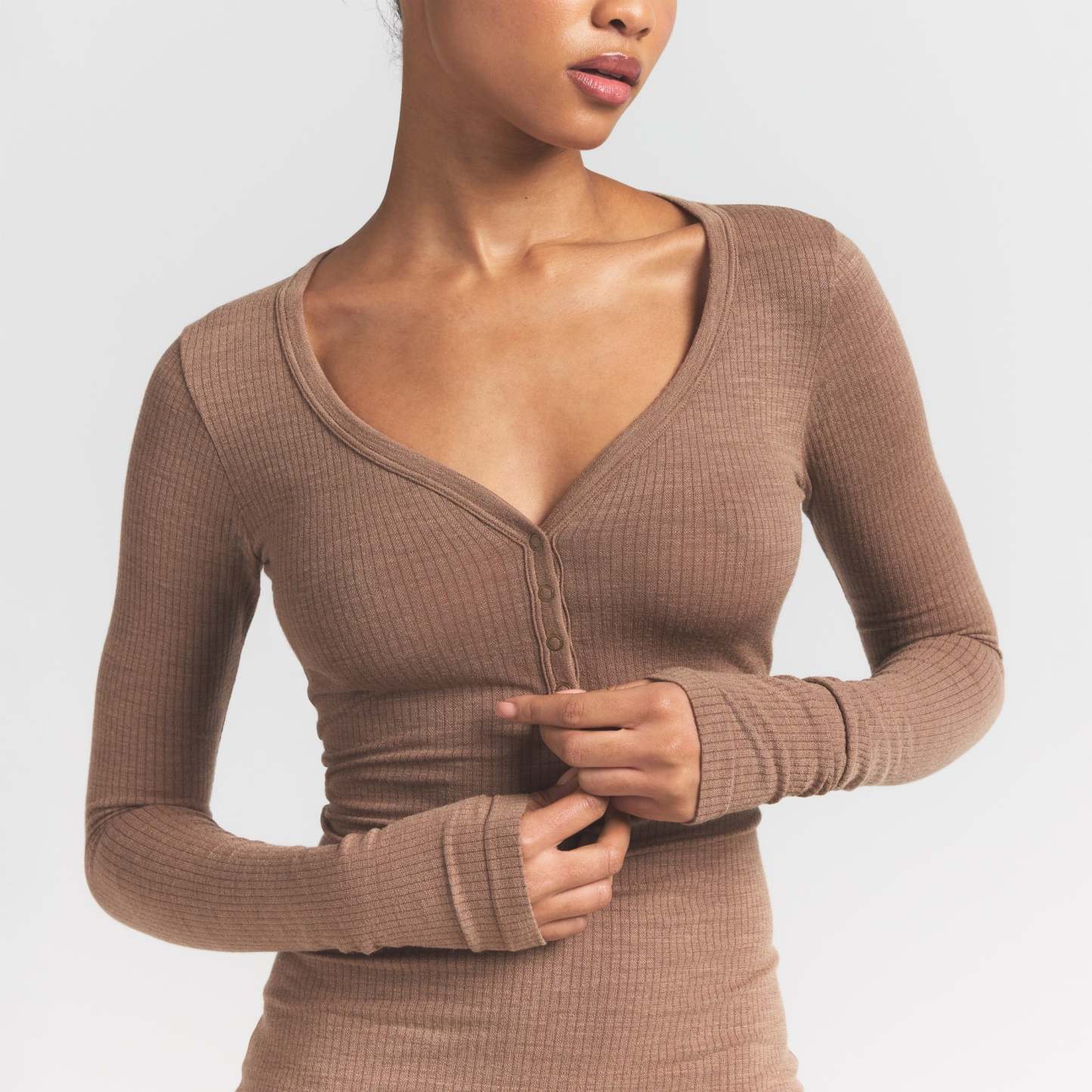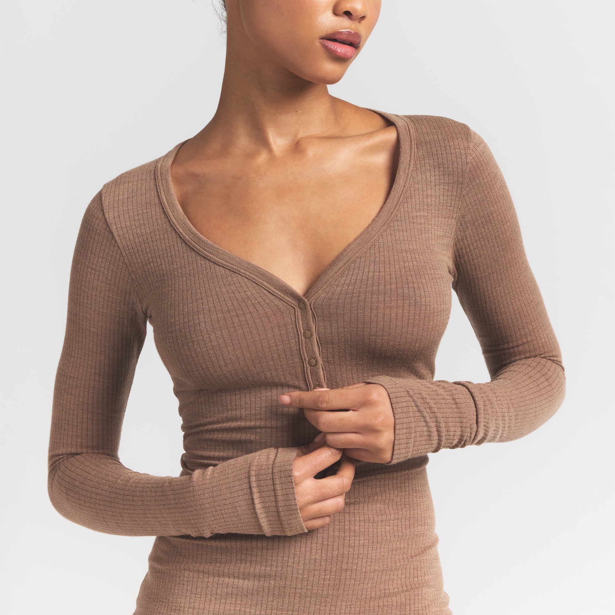 Scoop henley neckline, Snap closure, Long sleeves, Fits tight to body, Mini length
