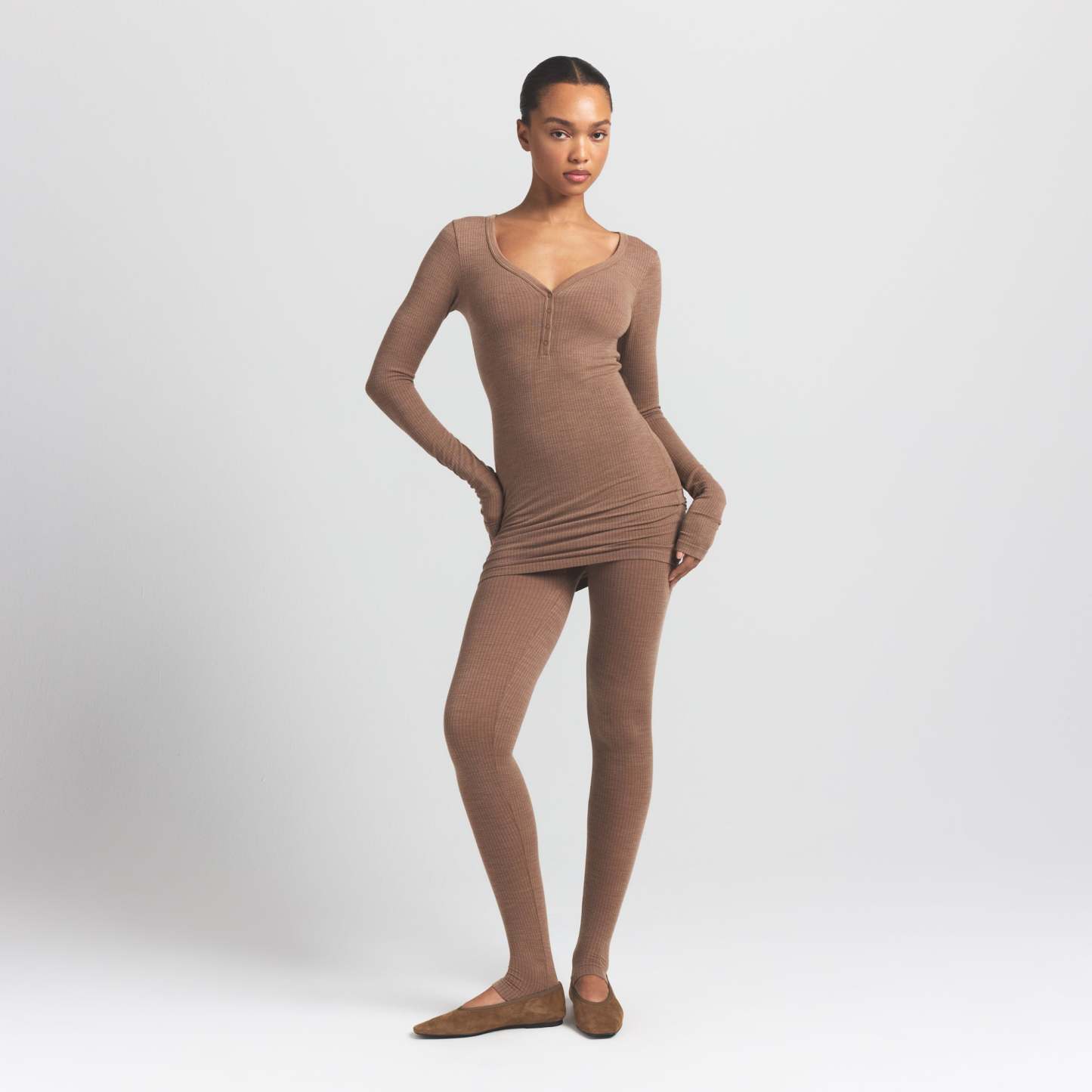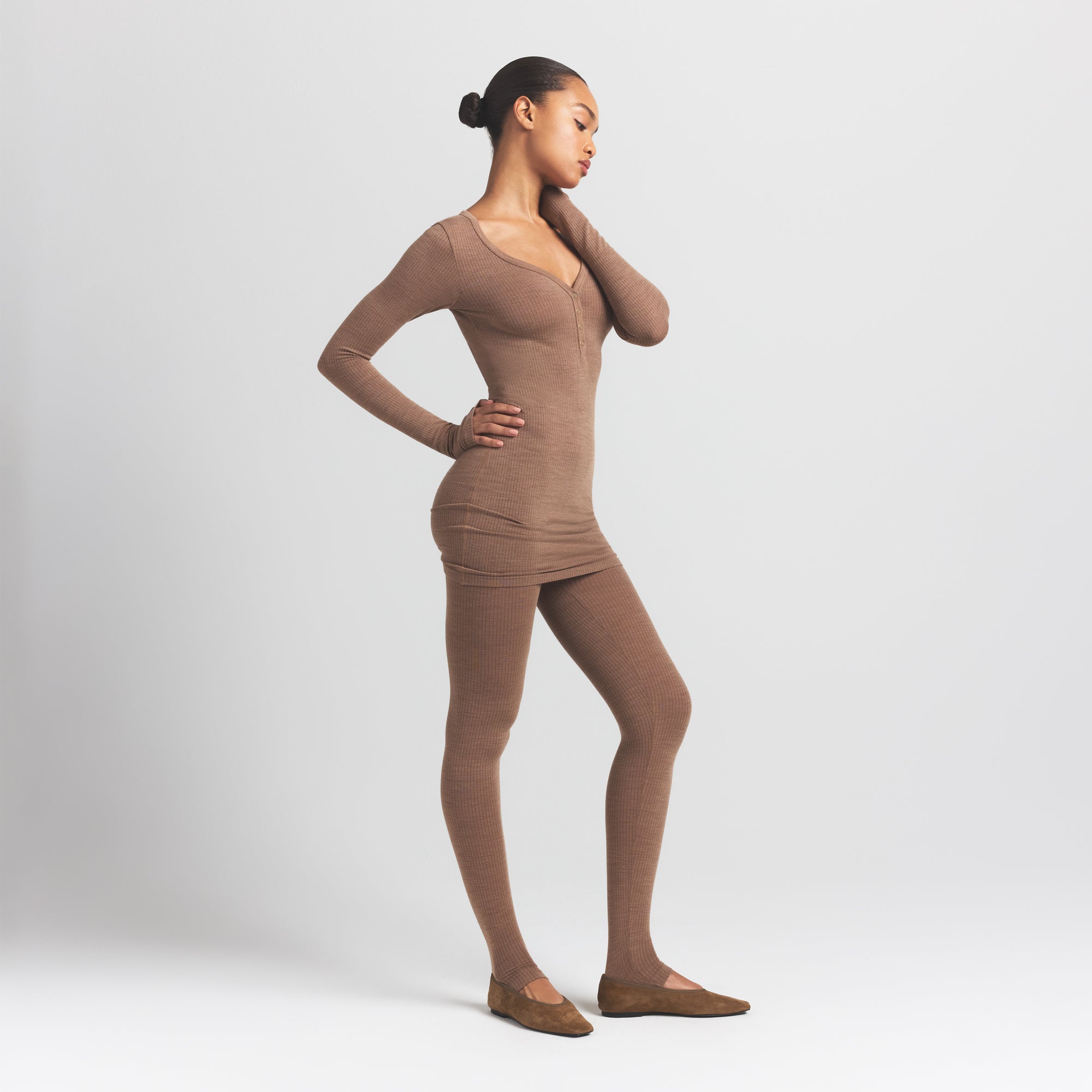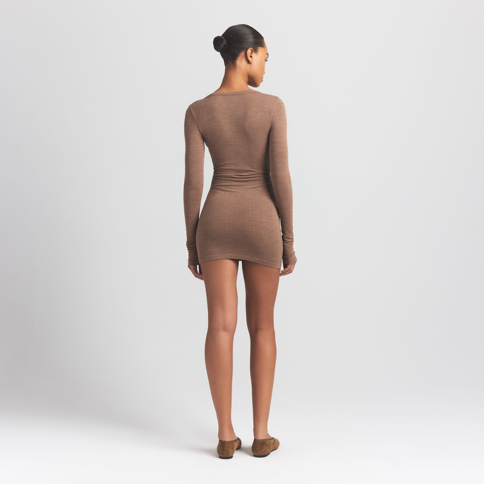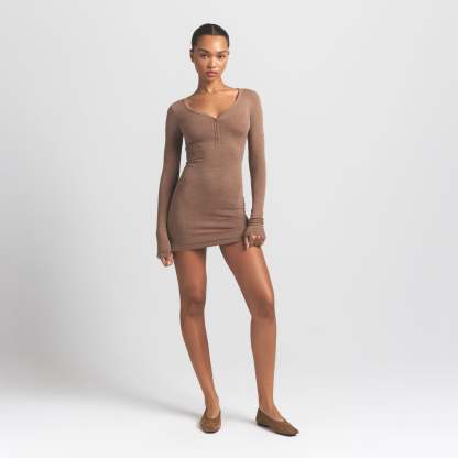 Warm, sleek, and flattering. This scoop henley mini dress is made from our new lightweight wool blend with an ultra-soft feel and ribbed look. Features a body-hugging fit and snap closure.