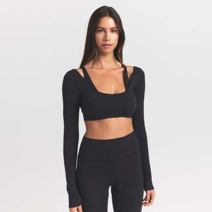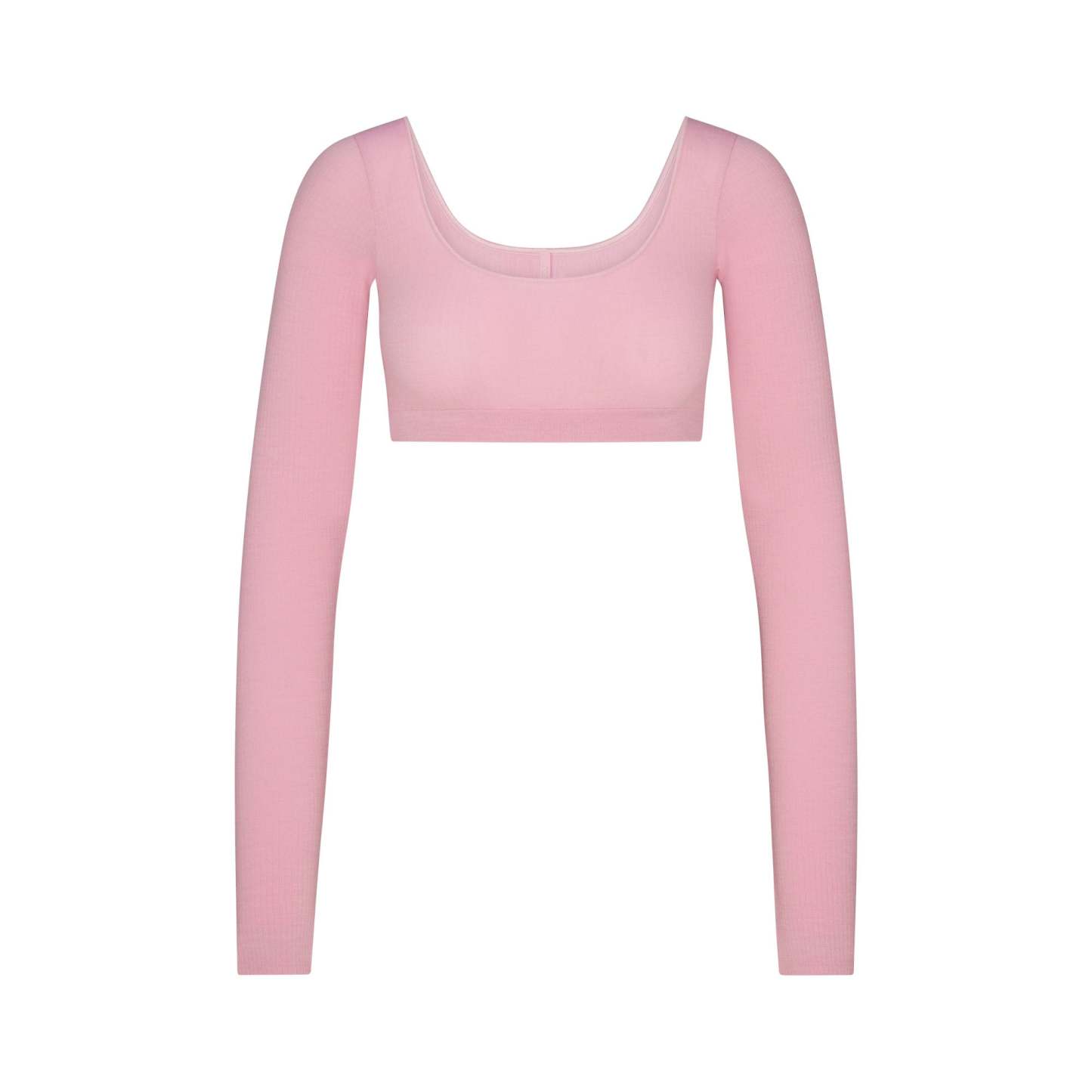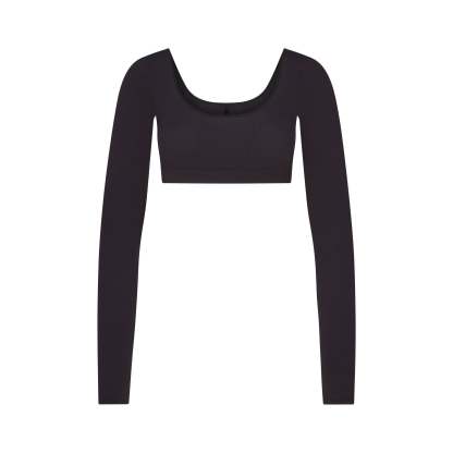 Wide scoop neckline, Long sleeves, Low back, Fits tight to body, Super cropped length
